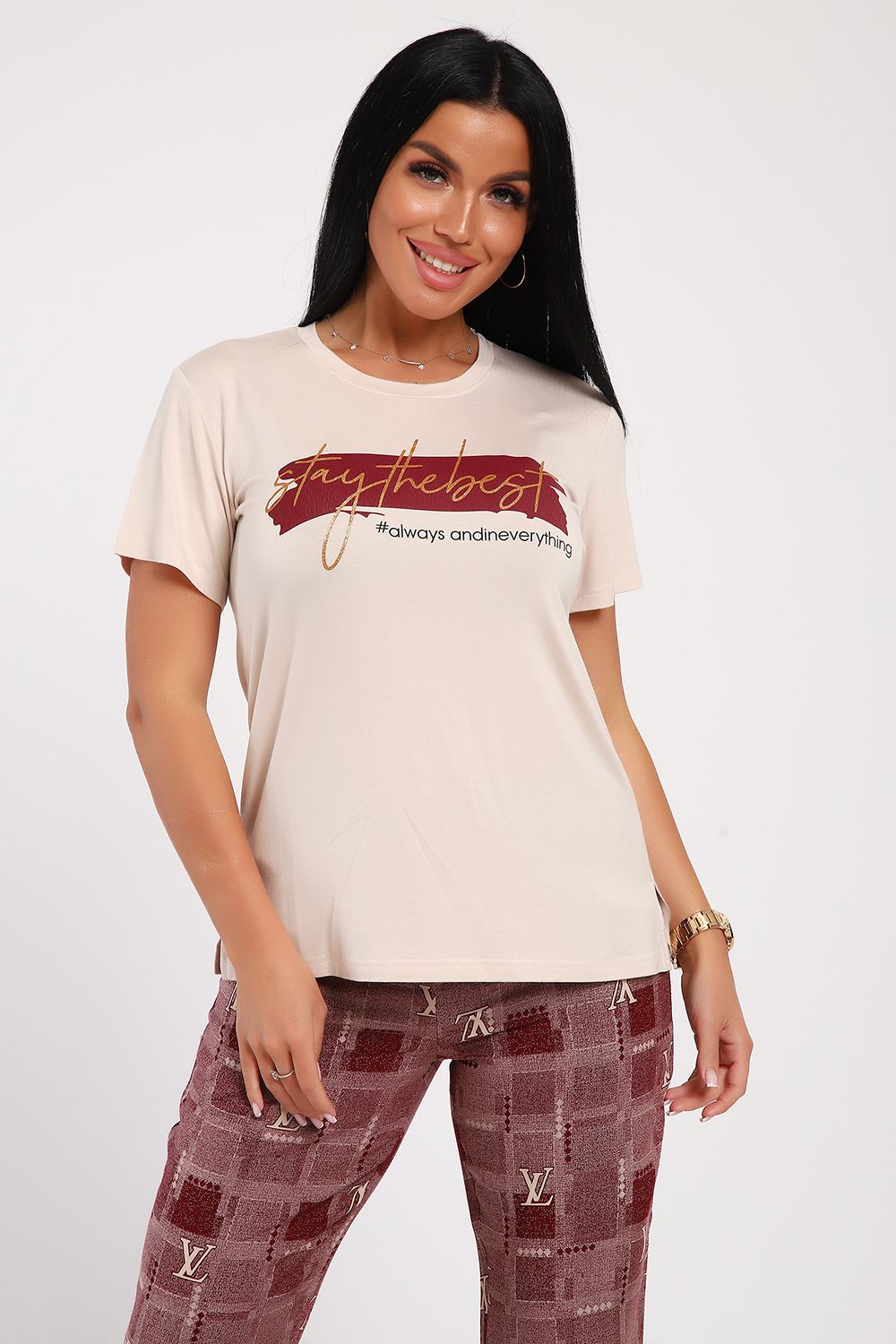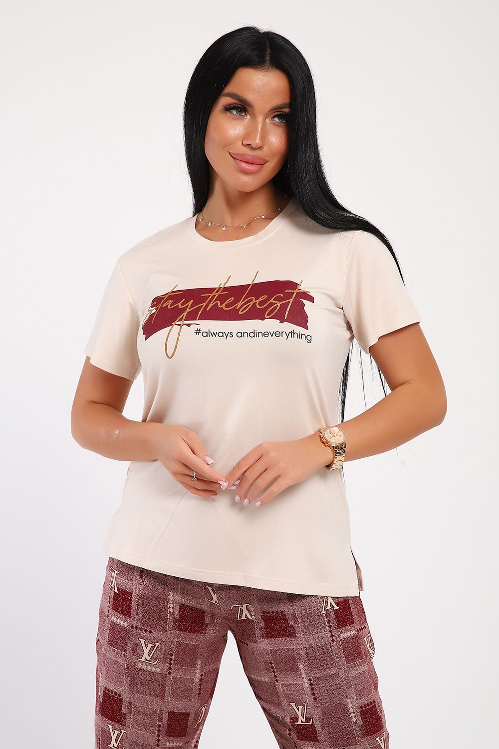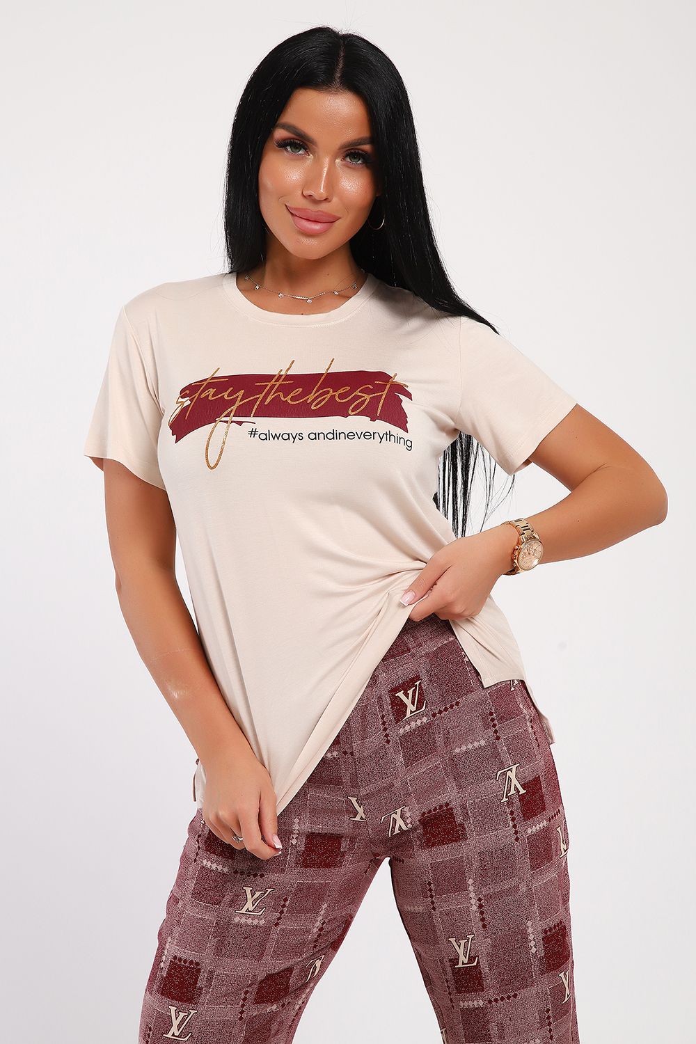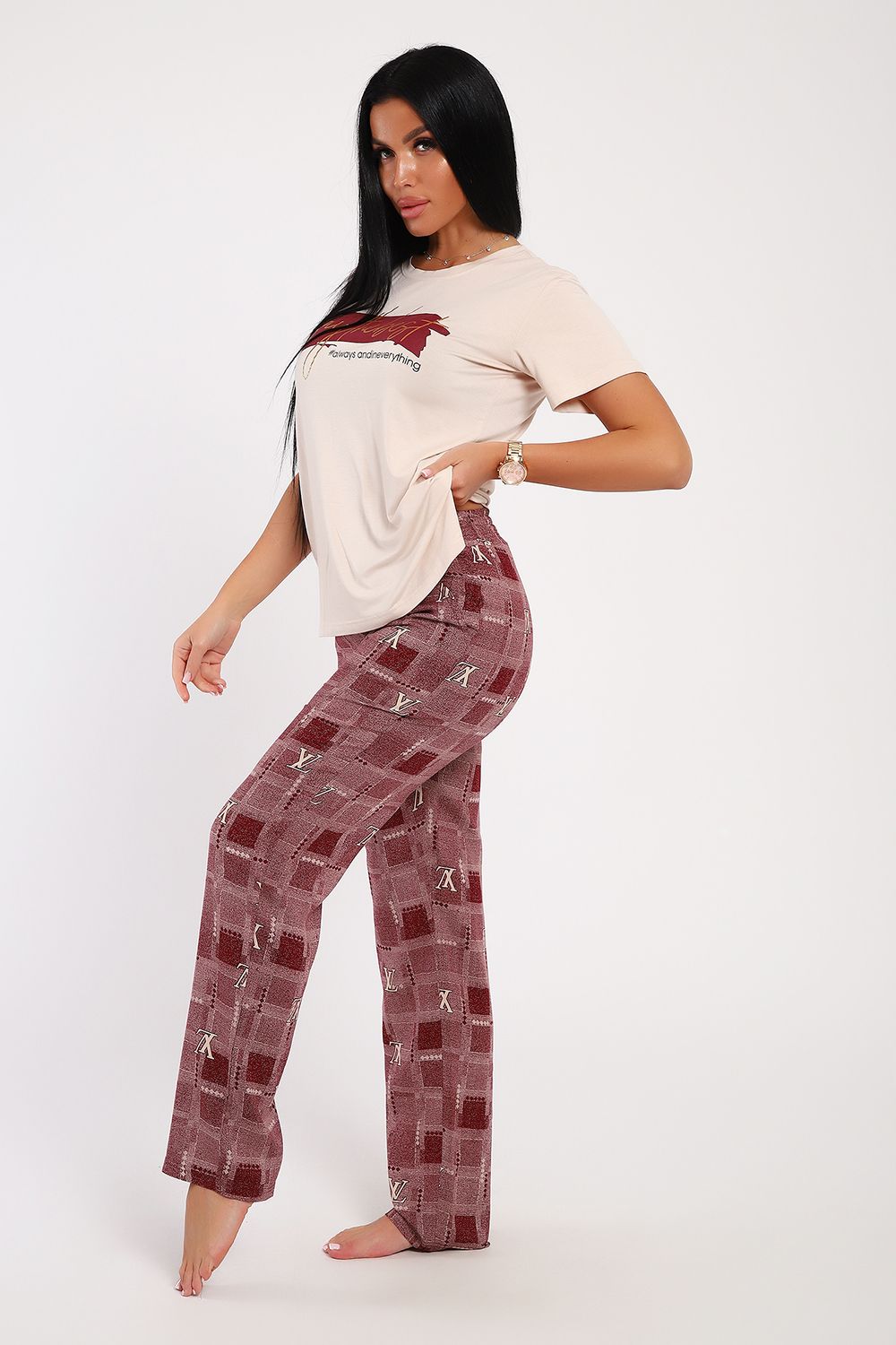 Классический и удобный трикотажный костюм с брюками из легкой хлопковой ткани динамичной расцветки! В комплекте костюма представлены кофта свободного кроя и брюки универсальной посадки Изюминкой костюма служит контраст верхи и низа -кофта нежного кремового оттенка и украшена лаконичным принтом, в тон расцветки брюк, которые сшиты из яркой, многоцветной ткани. универсальность костюма в том, что это идеальный вариант как домашней одежды для женщин, так и прекрасно подойдет для повседневной носки или одежды для сна.