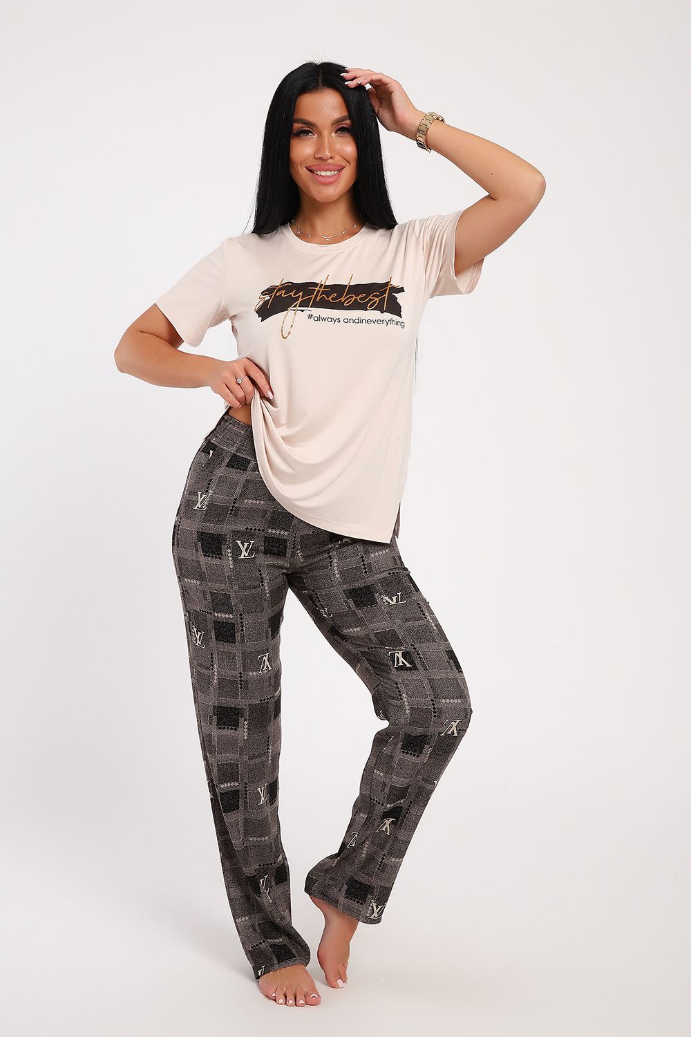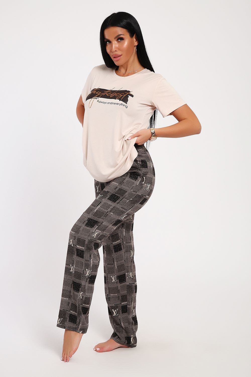 Классический и удобный трикотажный костюм с брюками из легкой хлопковой ткани динамичной расцветки! В комплекте костюма представлены кофта свободного кроя и брюки универсальной посадки Изюминкой костюма служит контраст верхи и низа -кофта нежного кремового оттенка и украшена лаконичным принтом, в тон расцветки брюк, которые сшиты из яркой, многоцветной ткани. универсальность костюма в том, что это идеальный вариант как домашней одежды для женщин, так и прекрасно подойдет для повседневной носки или одежды для сна.