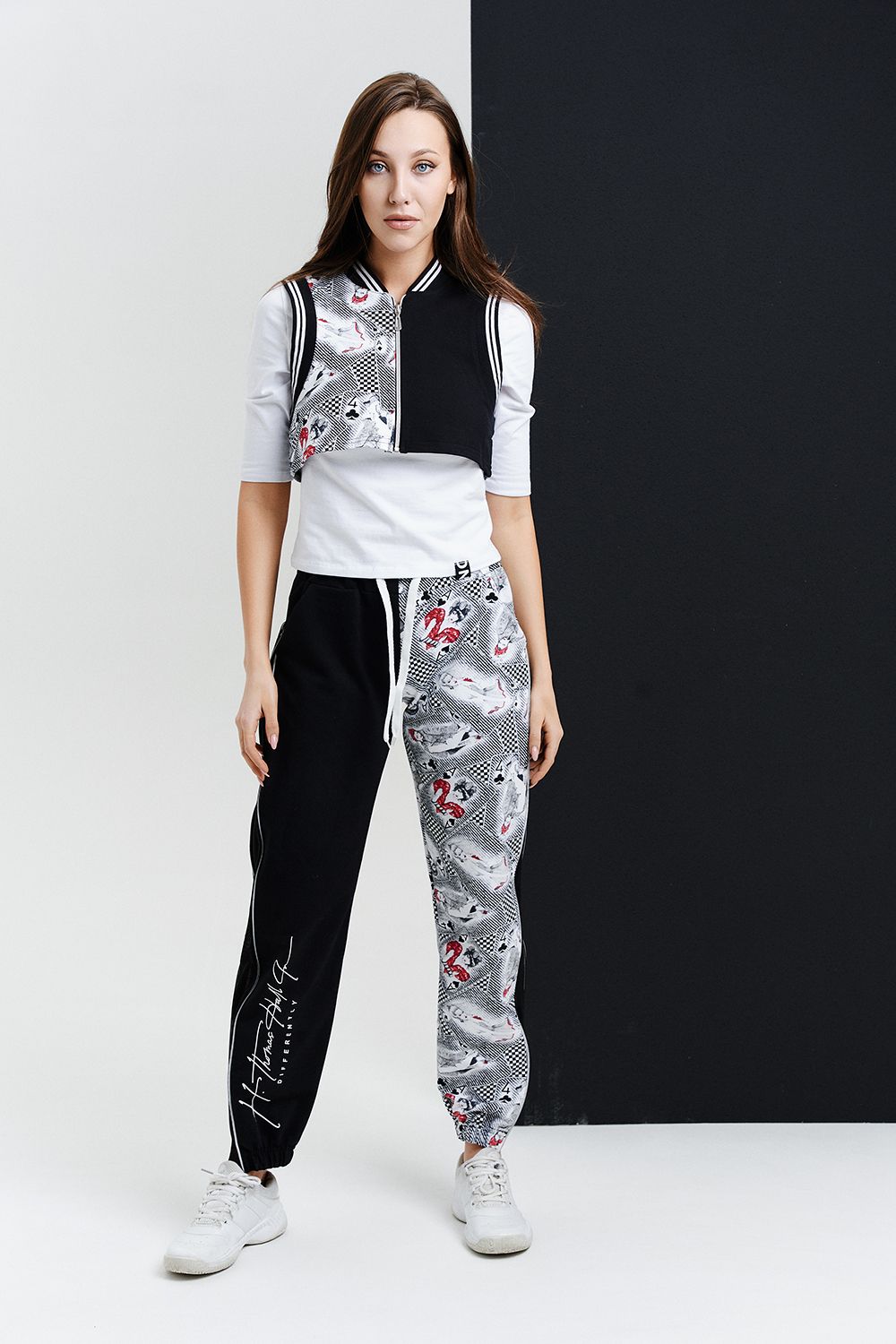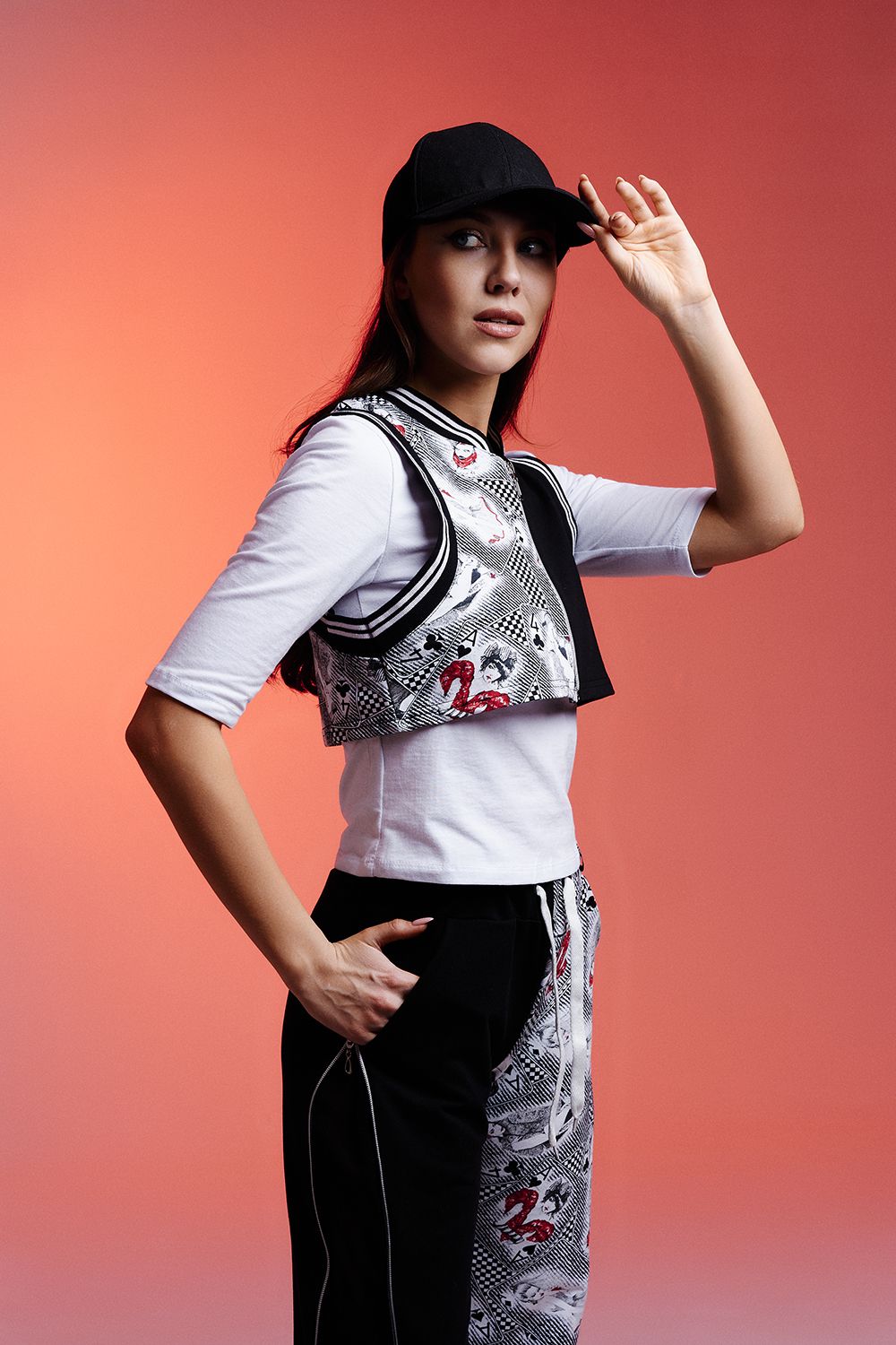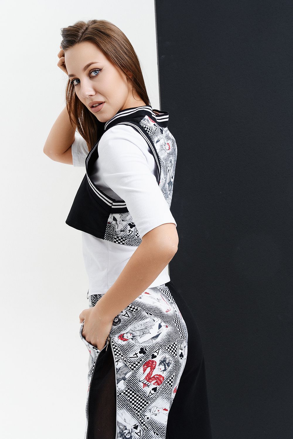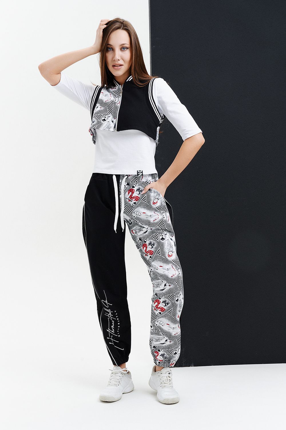 Молодежный костюм тройка, выполнен в технике COLOR BLOCKING, состоит из укороченного жилета на застежке- молнии, джоггеров со вставками из сетки и молниями в боковых швах с модным принтом на правой передней половинке брюк и белой трикотажной футболки декорированной шевроном на полочке. Оригинальный, модный и практичный костюм, который подойдет для встреч с друзьями и прогулок, для любителей активного отдыха.