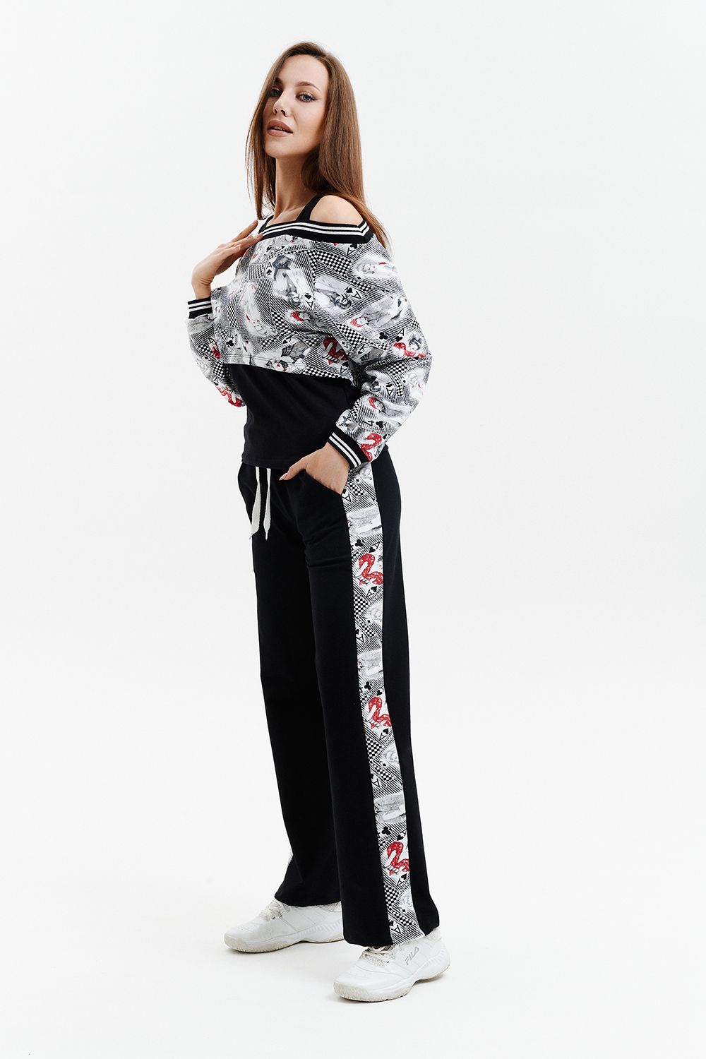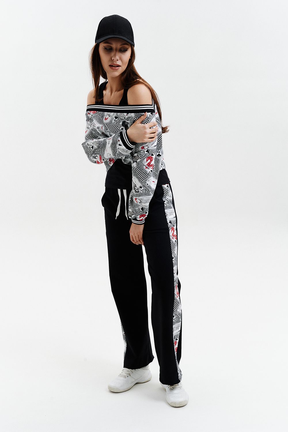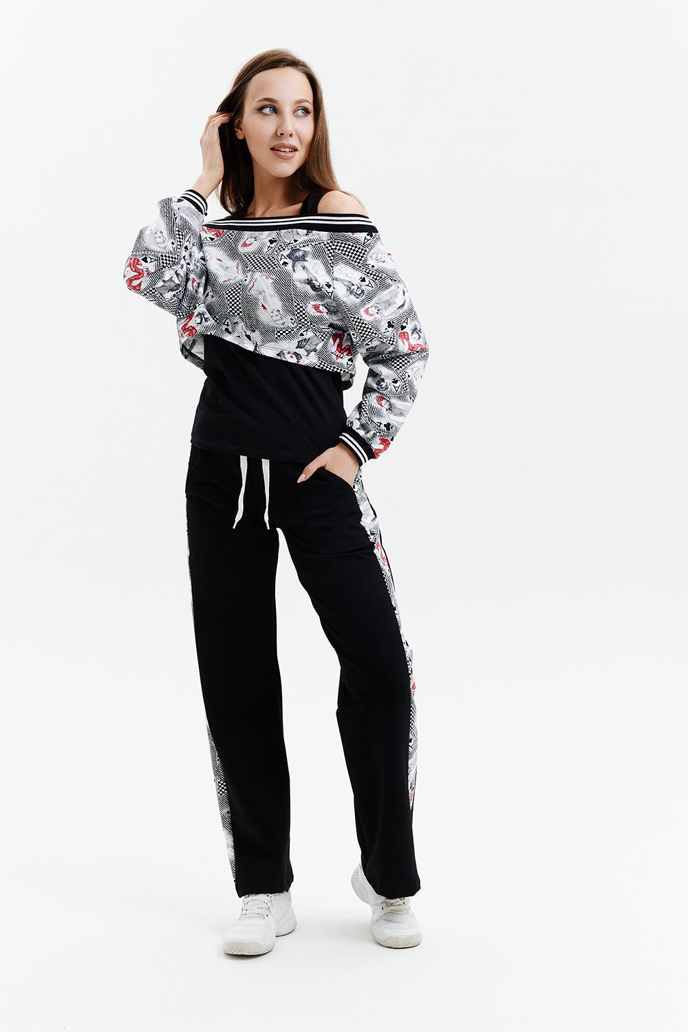 Костюм женский - тройка, состоит из майки прилегающего силуэта, широких, прямых брюк с цветной вставкой по бокам и короткого свитшота свободного силуэта со спущенной линией плеч. Оригинальный, модный костюм, который подойдет для прогулок, встреч с друзьями, активного отдыха и путешествий.