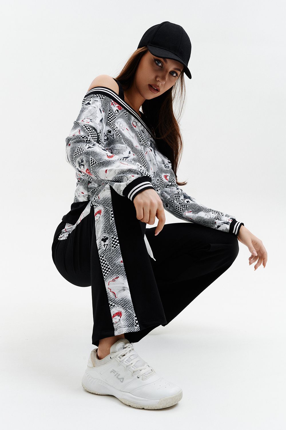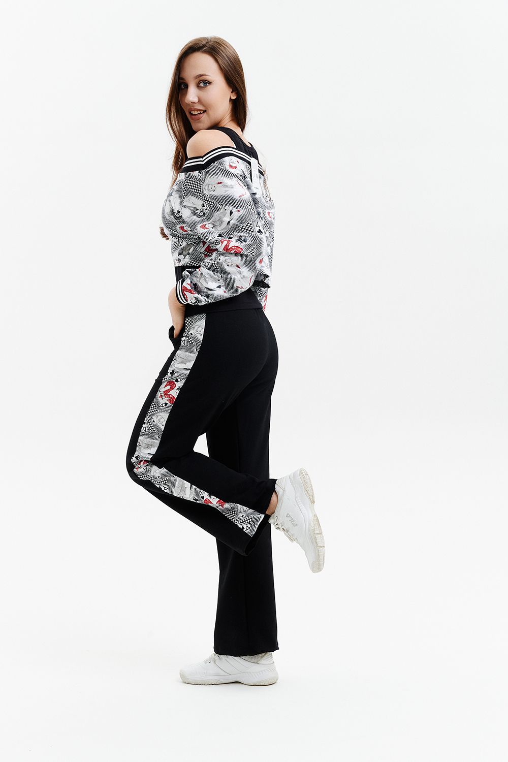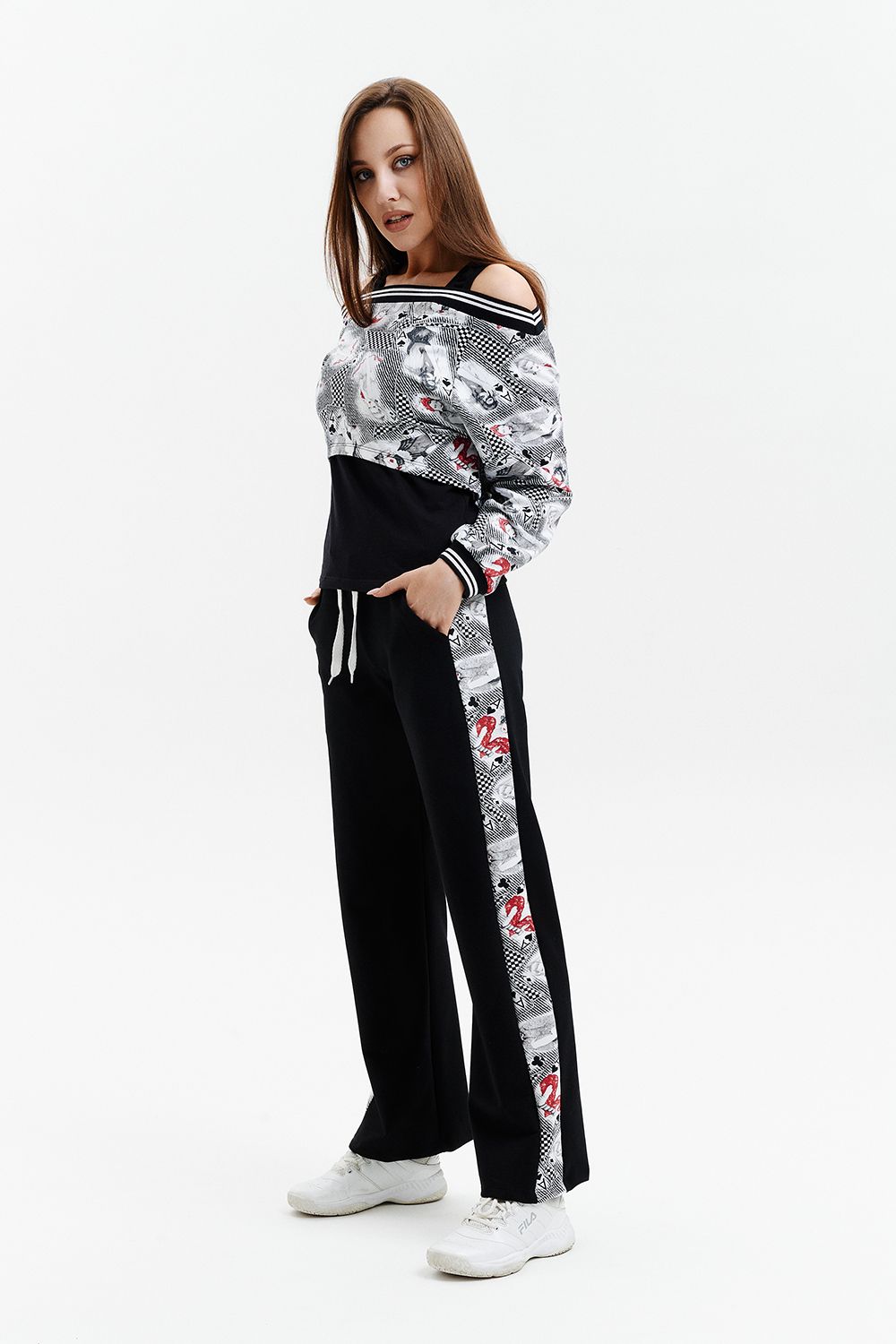 Костюм женский - тройка, состоит из майки прилегающего силуэта, широких, прямых брюк с цветной вставкой по бокам и короткого свитшота свободного силуэта со спущенной линией плеч. Оригинальный, модный костюм, который подойдет для прогулок, встреч с друзьями, активного отдыха и путешествий.