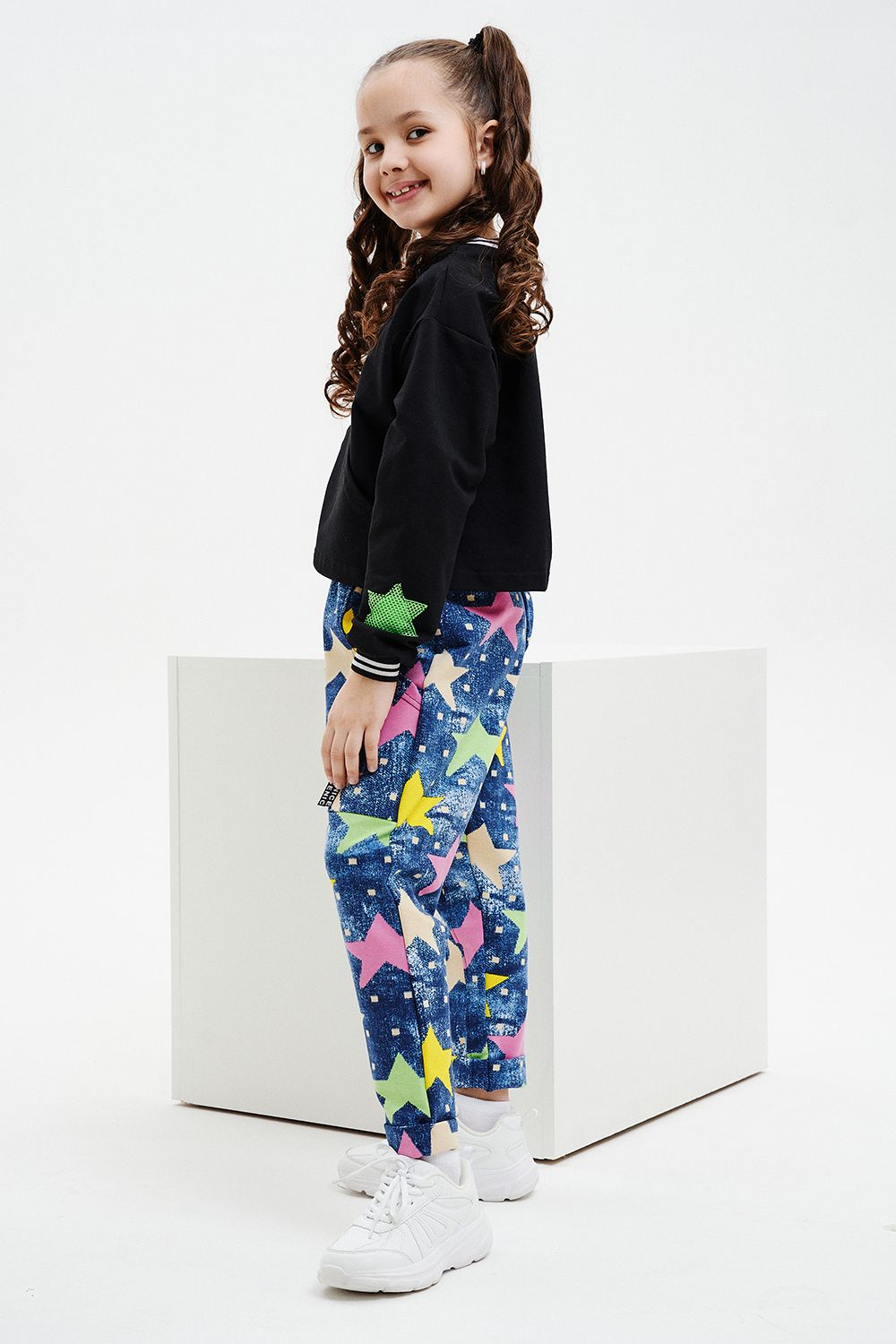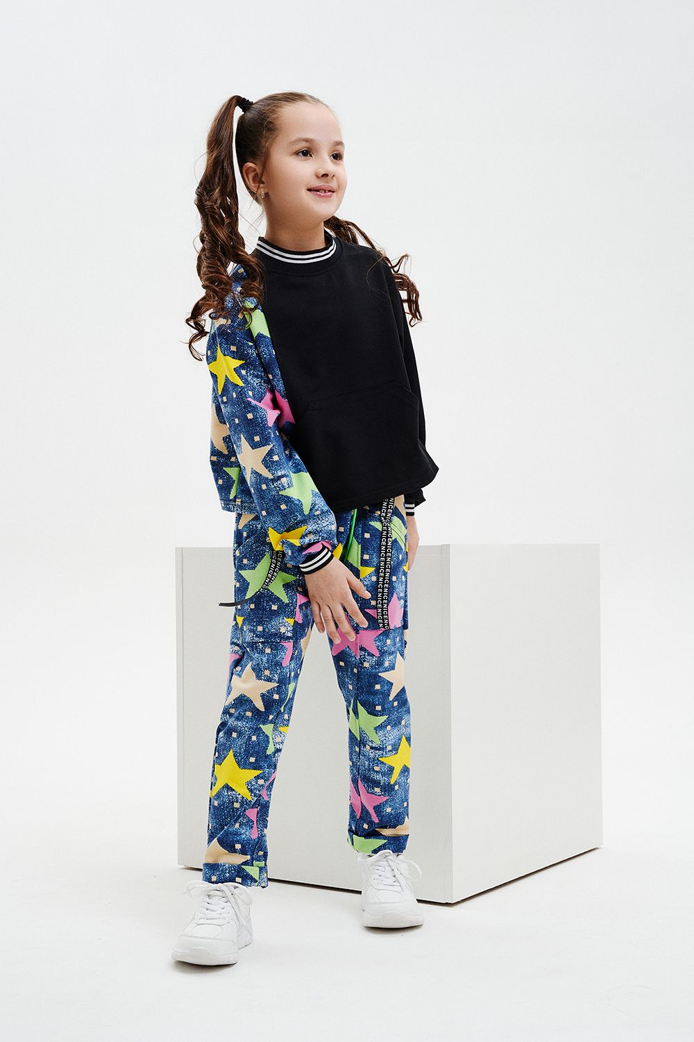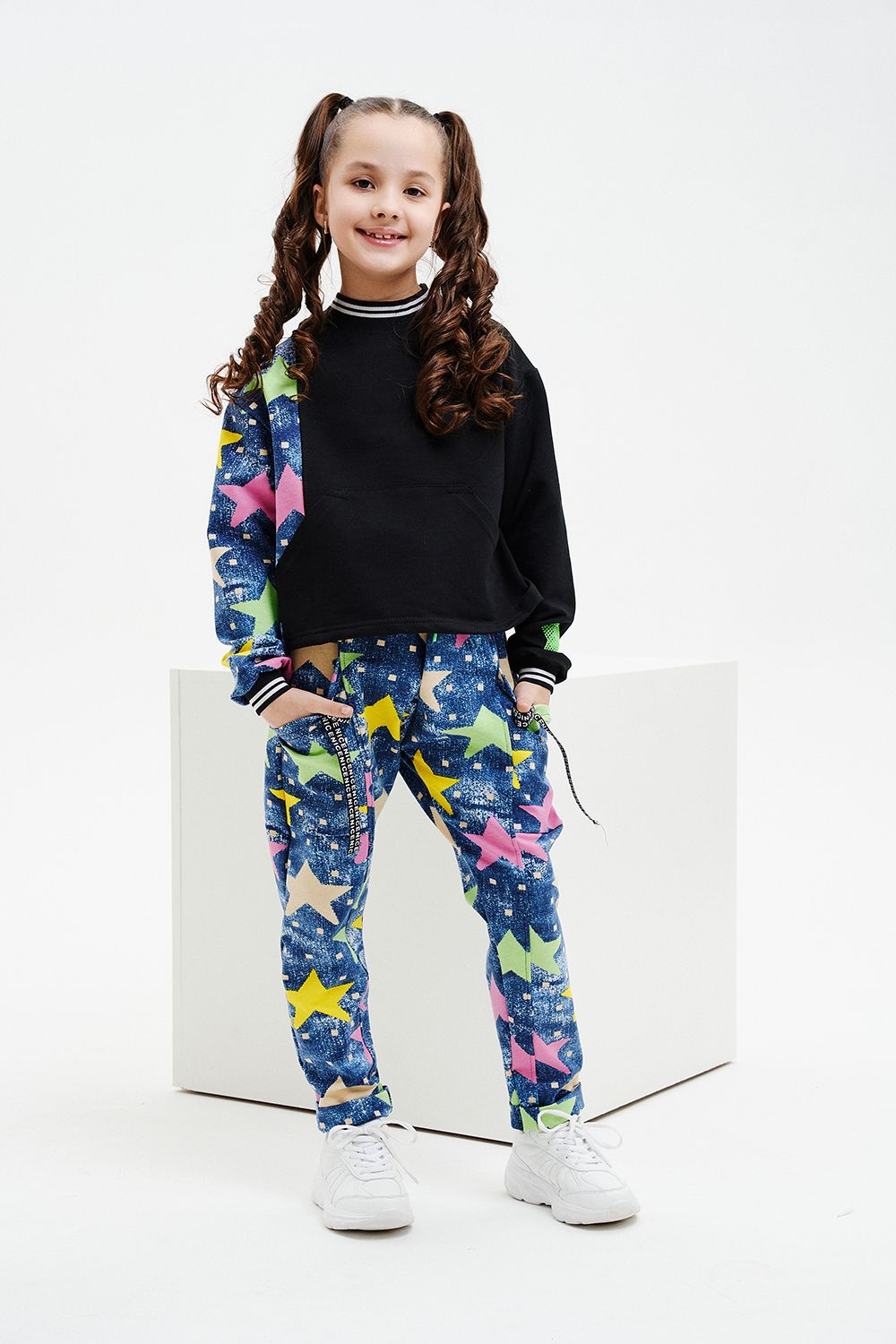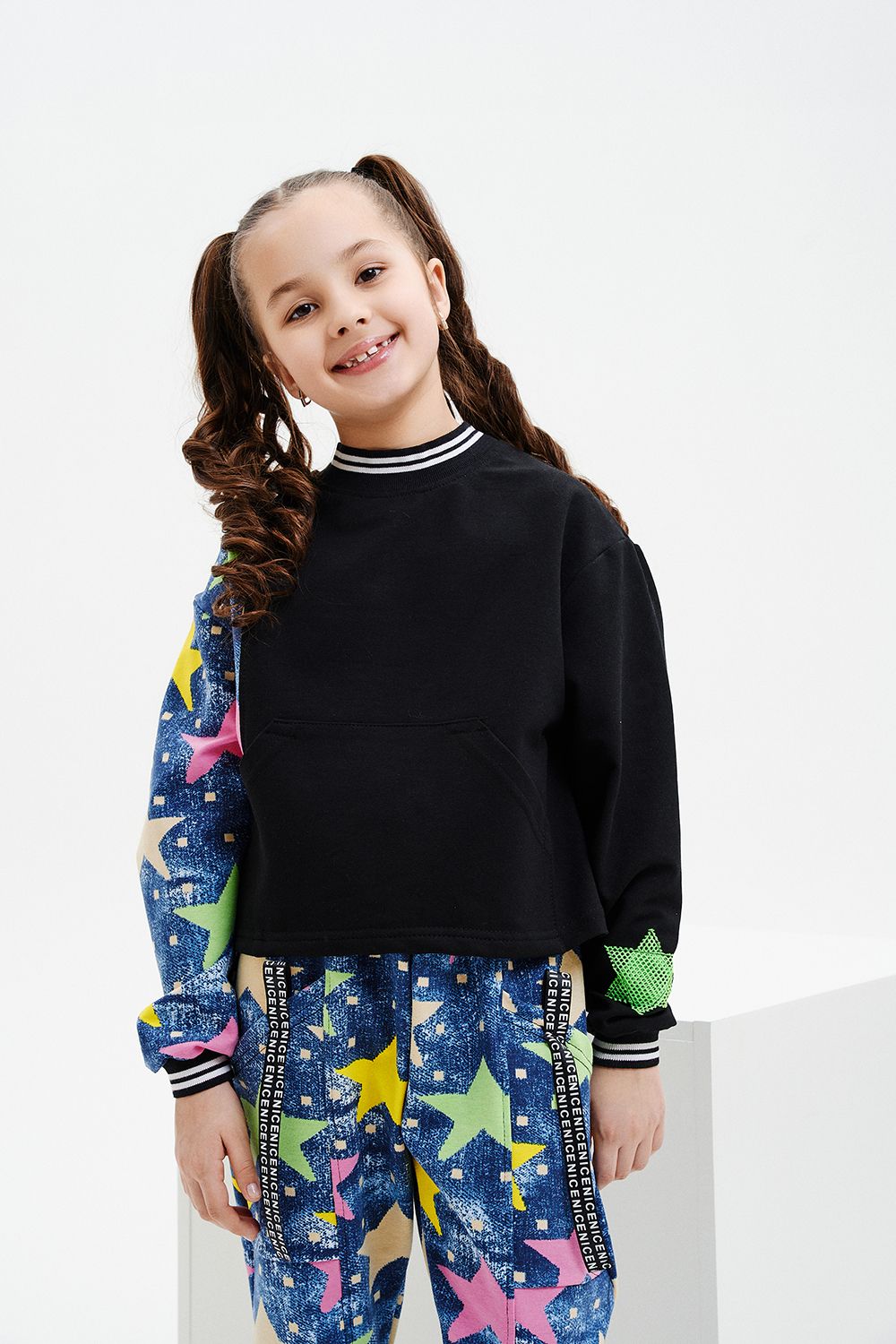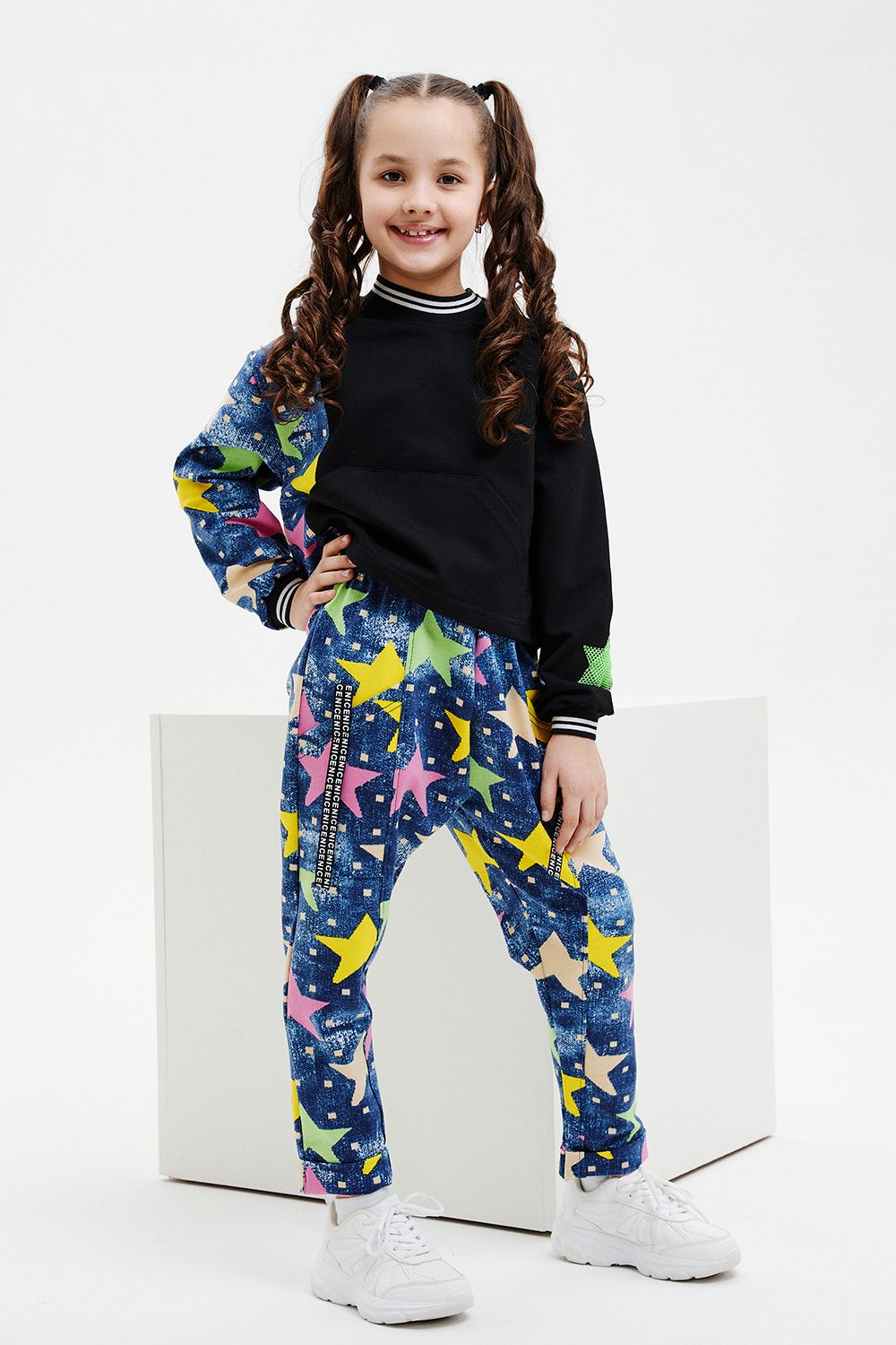 Костюм детский свободного силуэта, состоит из свитшота и брюк (шароваров). Свитшот укороченный с карманом кенгуру на полочке, на рукаве яркий декор в форме звезды. Горловина и низ рукавов обработаны эластичной рибаной. Брюки свободного кроя с карманами в швах оформленными декоративной тесьмой, имеют яркие элементы в виде звезды и шнурка. Низ брюк обработан манжетой с отворотом из основной ткани.