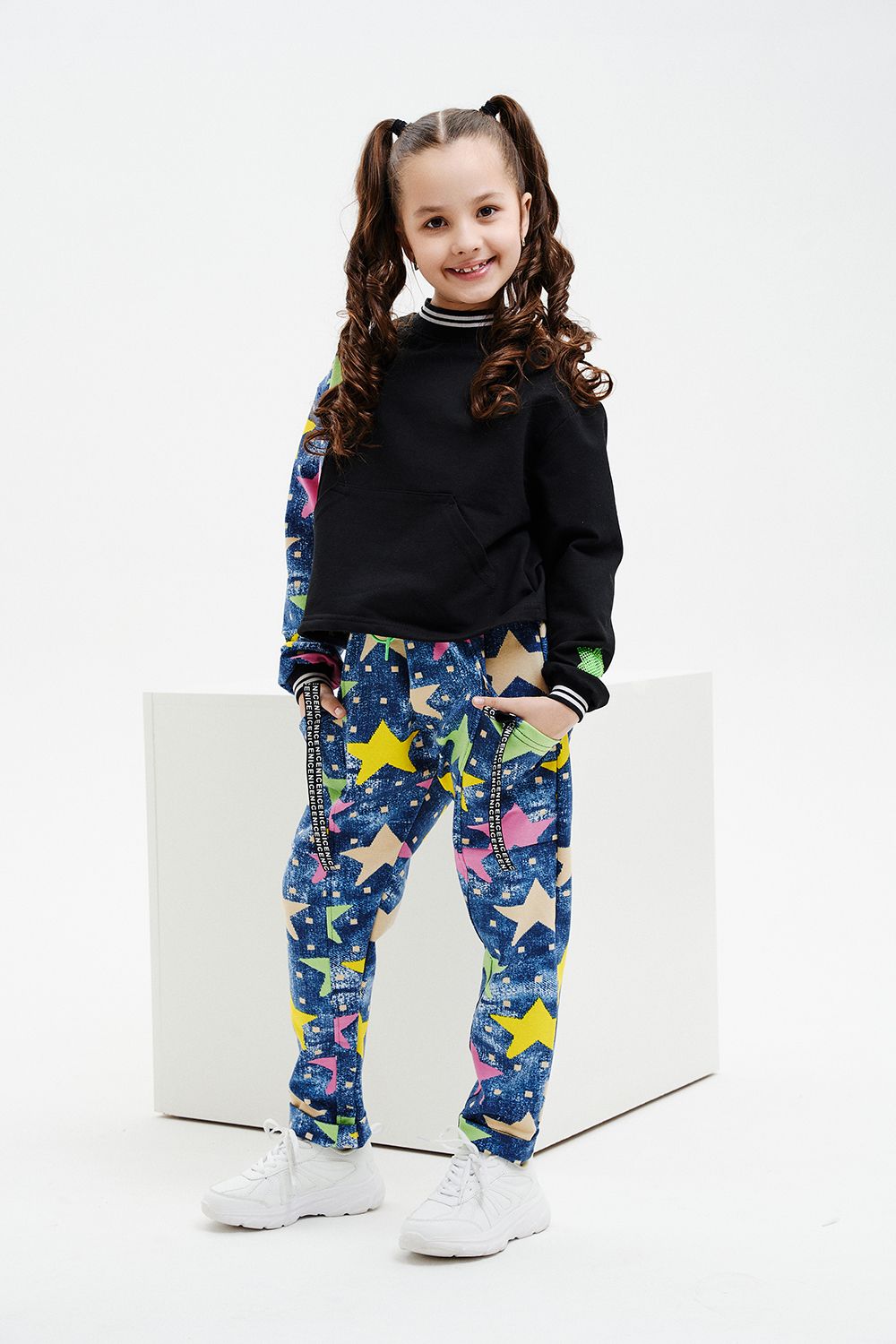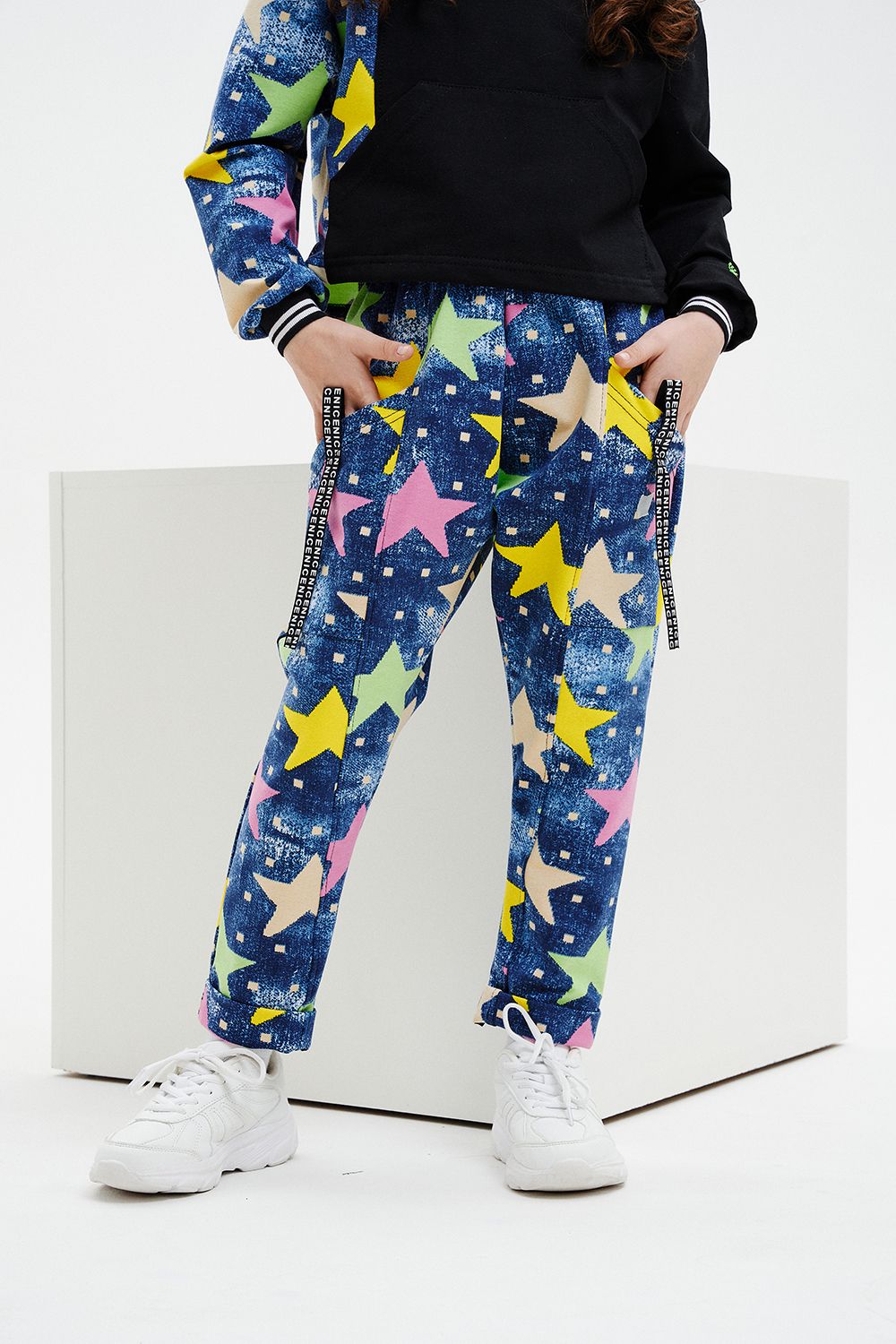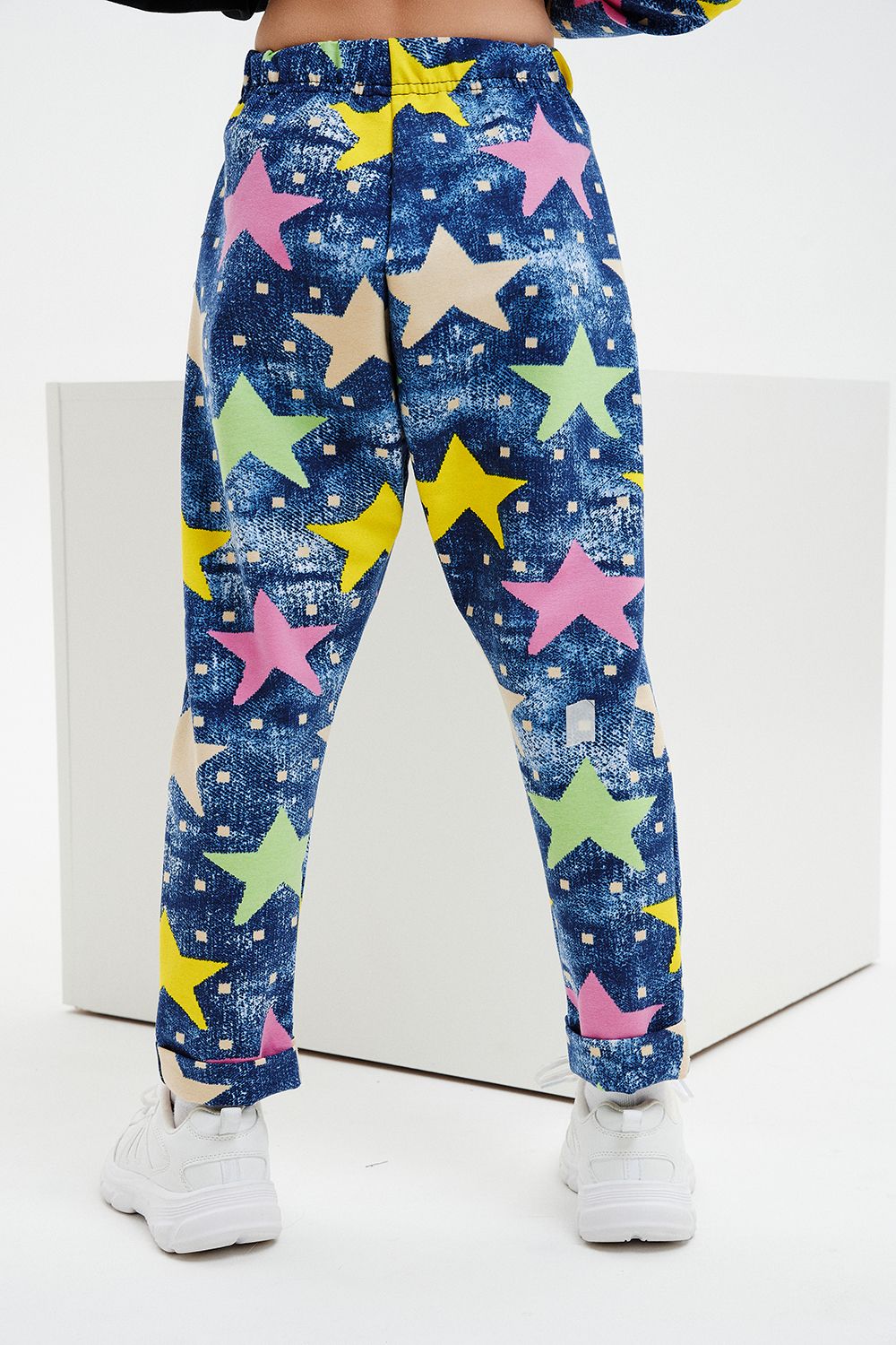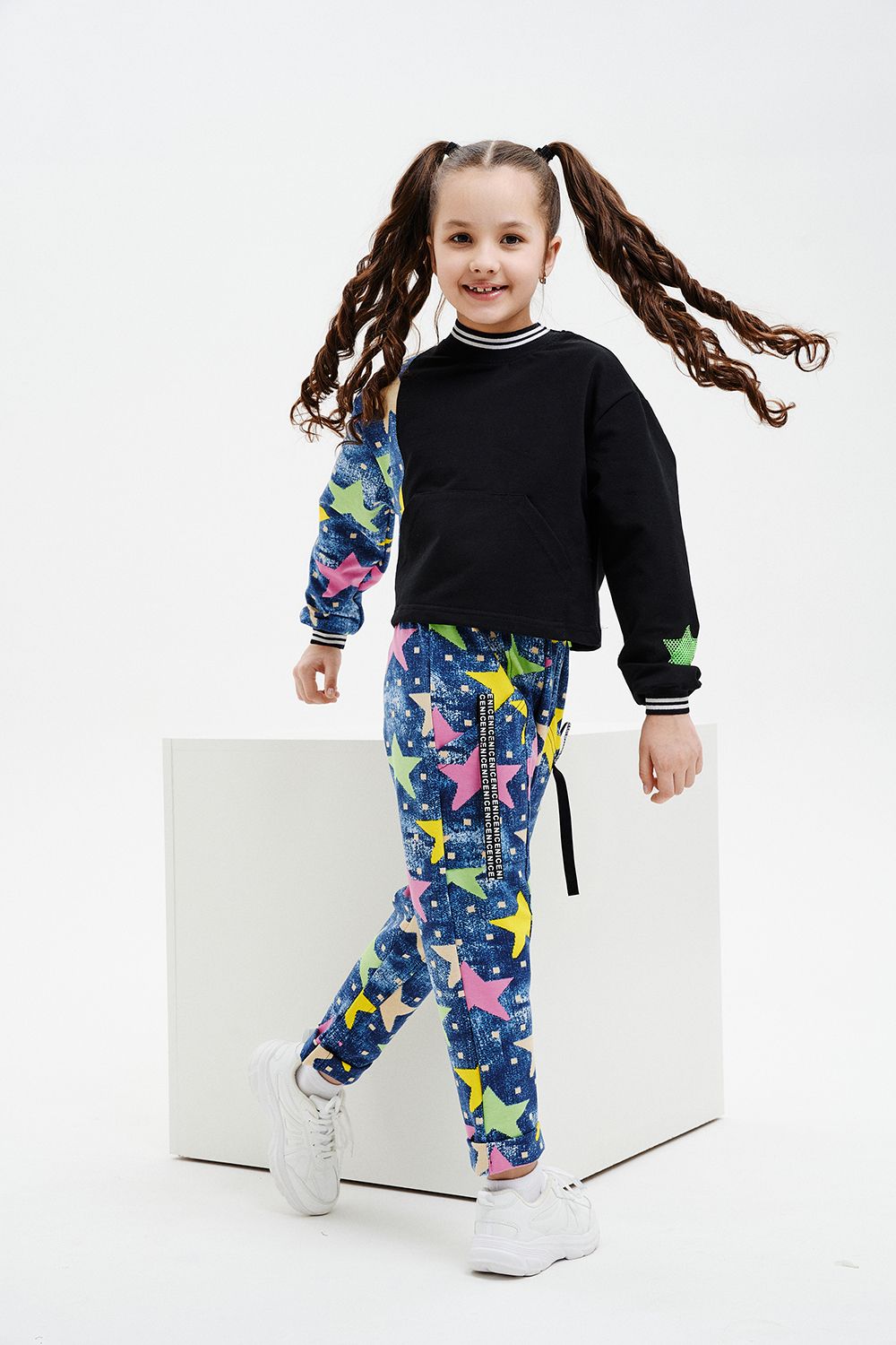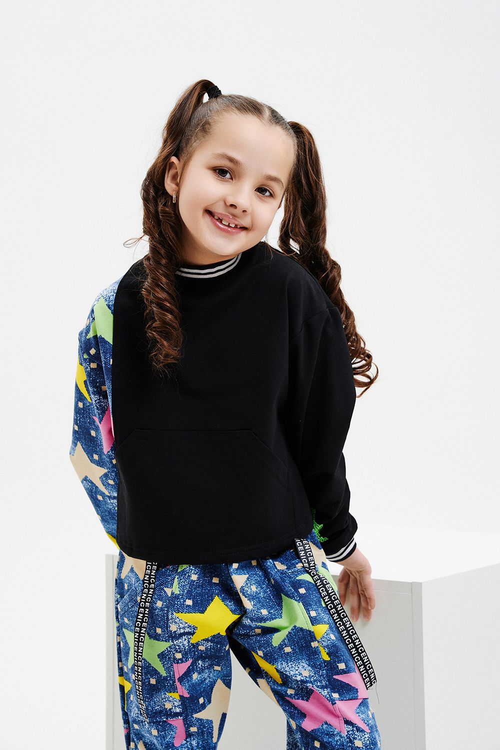 Костюм детский свободного силуэта, состоит из свитшота и брюк (шароваров). Свитшот укороченный с карманом кенгуру на полочке, на рукаве яркий декор в форме звезды. Горловина и низ рукавов обработаны эластичной рибаной. Брюки свободного кроя с карманами в швах оформленными декоративной тесьмой, имеют яркие элементы в виде звезды и шнурка. Низ брюк обработан манжетой с отворотом из основной ткани.