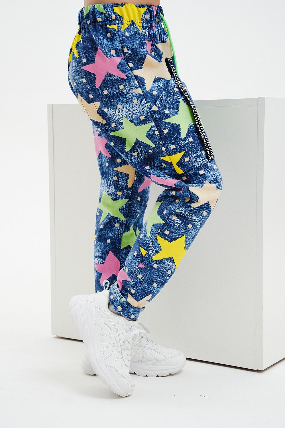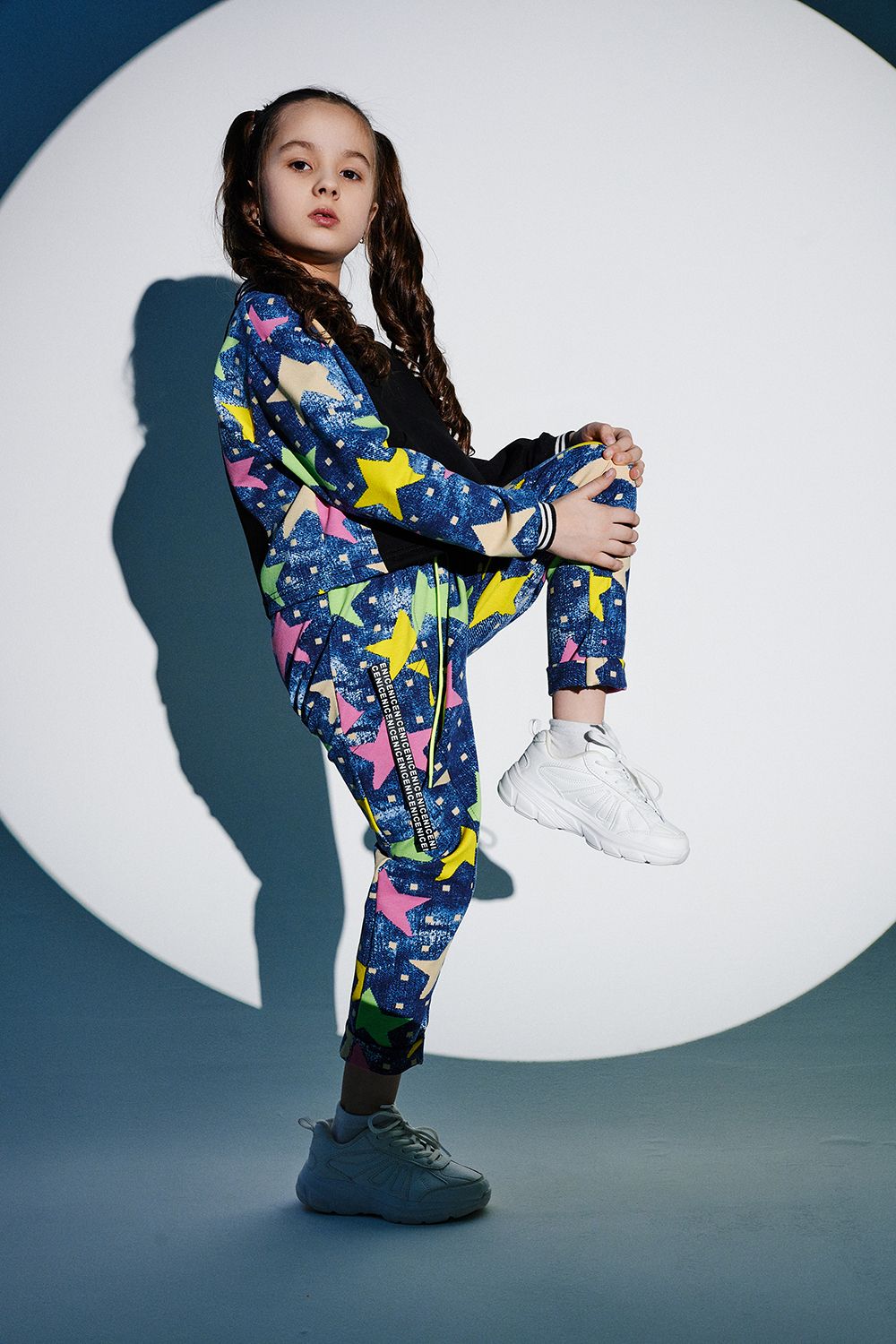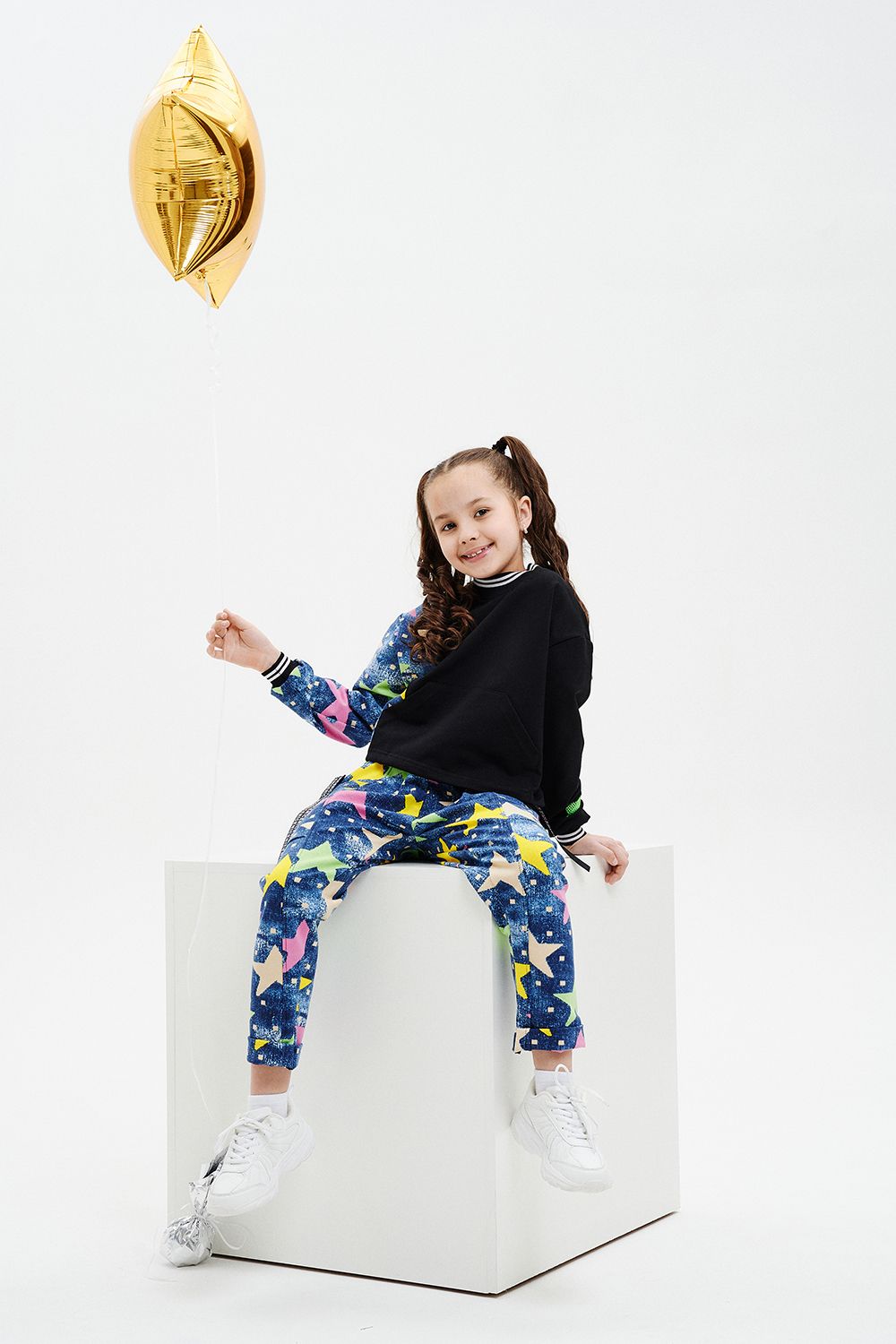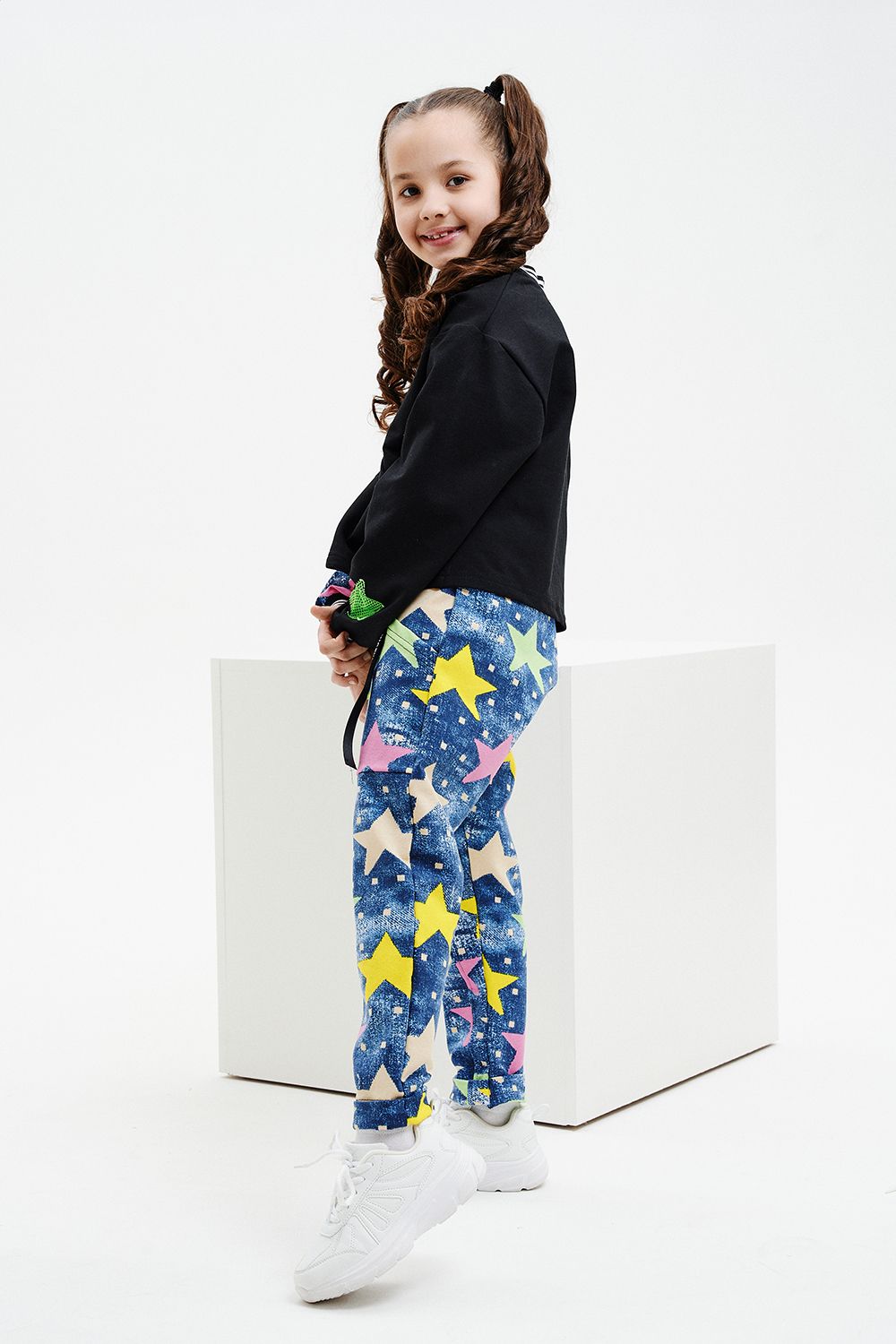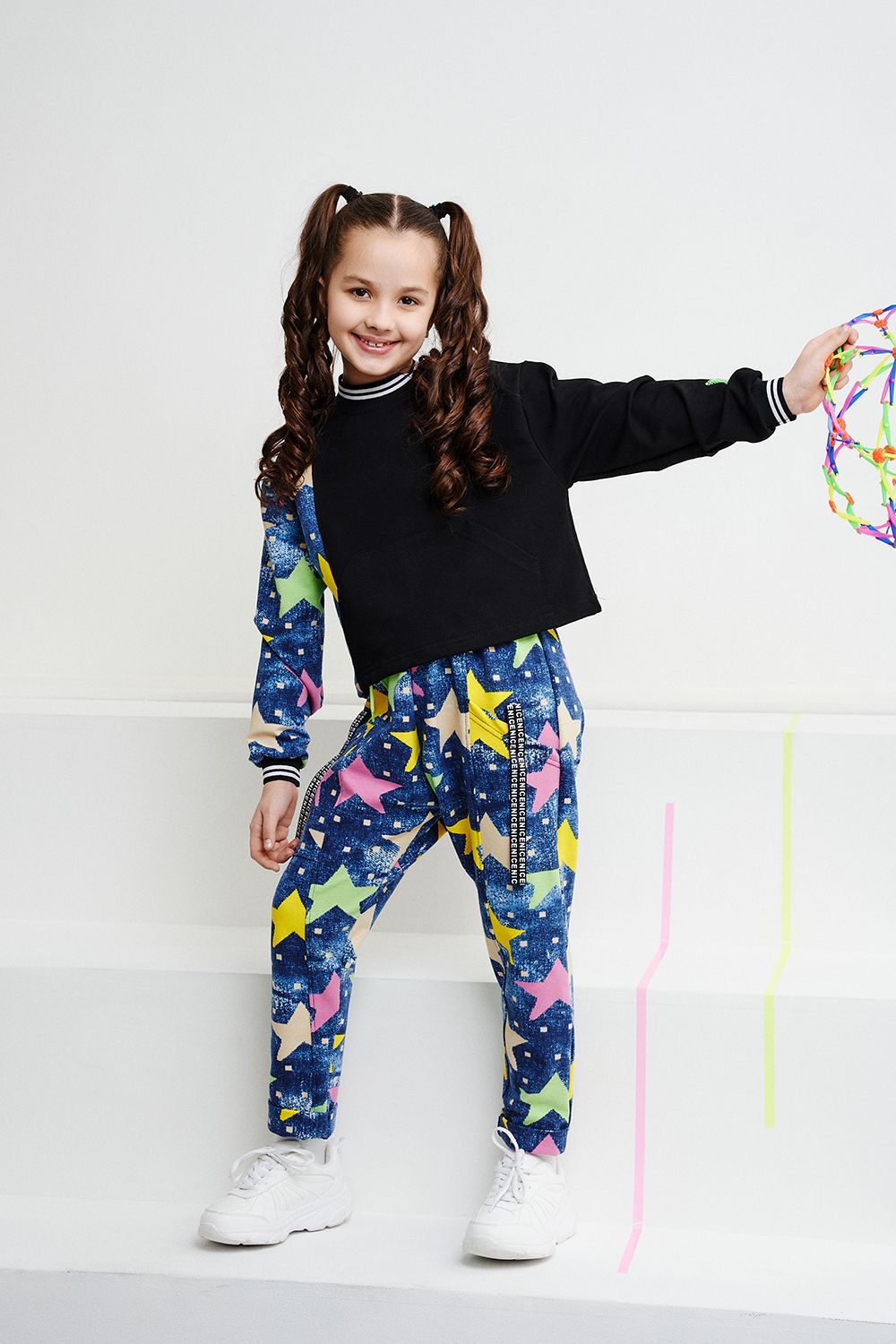 Костюм детский свободного силуэта, состоит из свитшота и брюк (шароваров). Свитшот укороченный с карманом кенгуру на полочке, на рукаве яркий декор в форме звезды. Горловина и низ рукавов обработаны эластичной рибаной. Брюки свободного кроя с карманами в швах оформленными декоративной тесьмой, имеют яркие элементы в виде звезды и шнурка. Низ брюк обработан манжетой с отворотом из основной ткани.