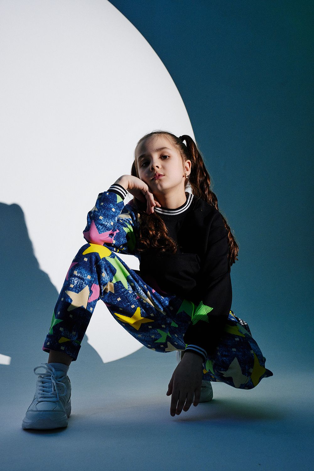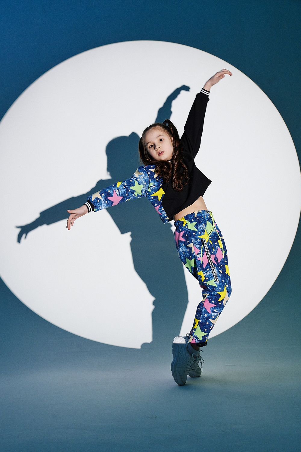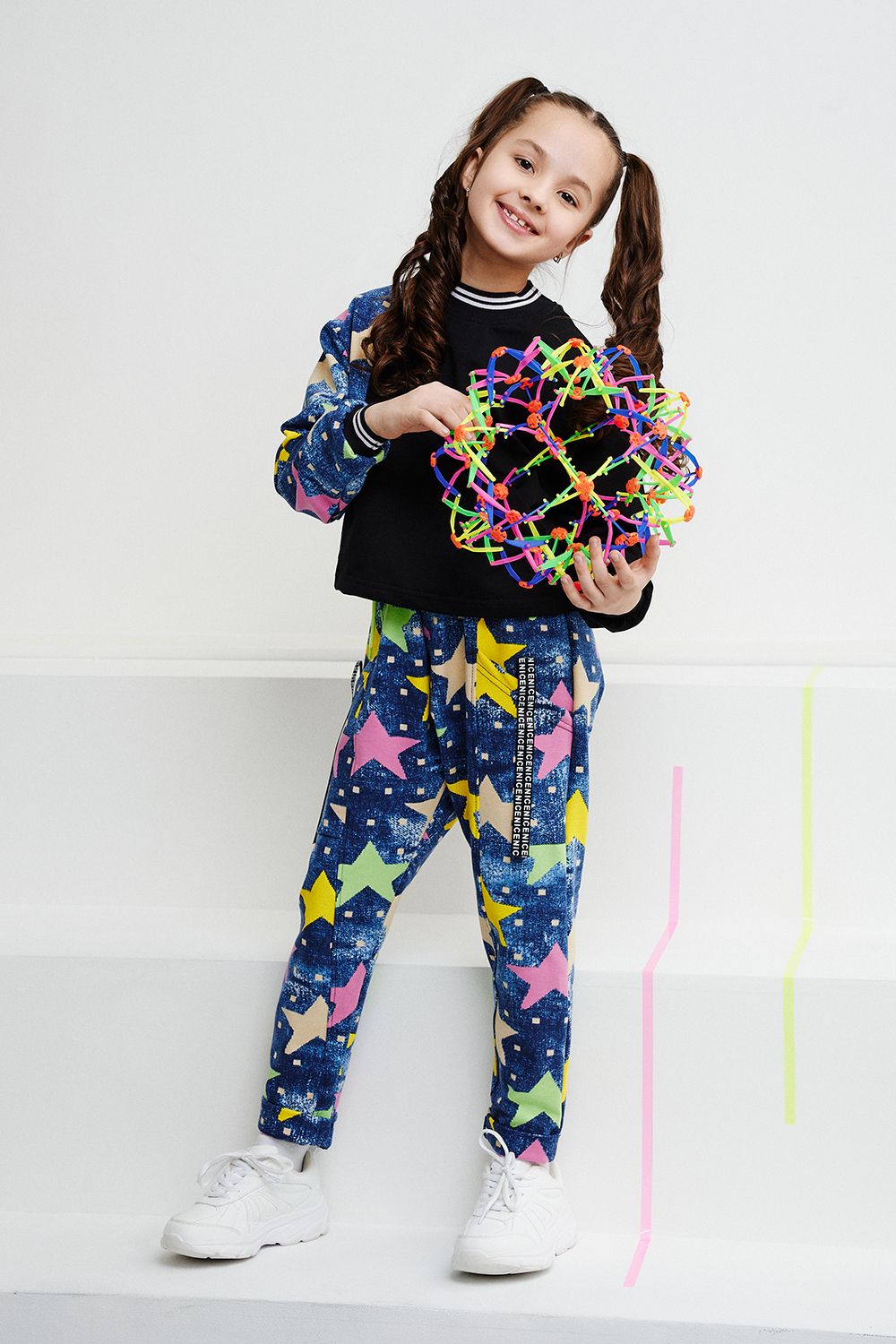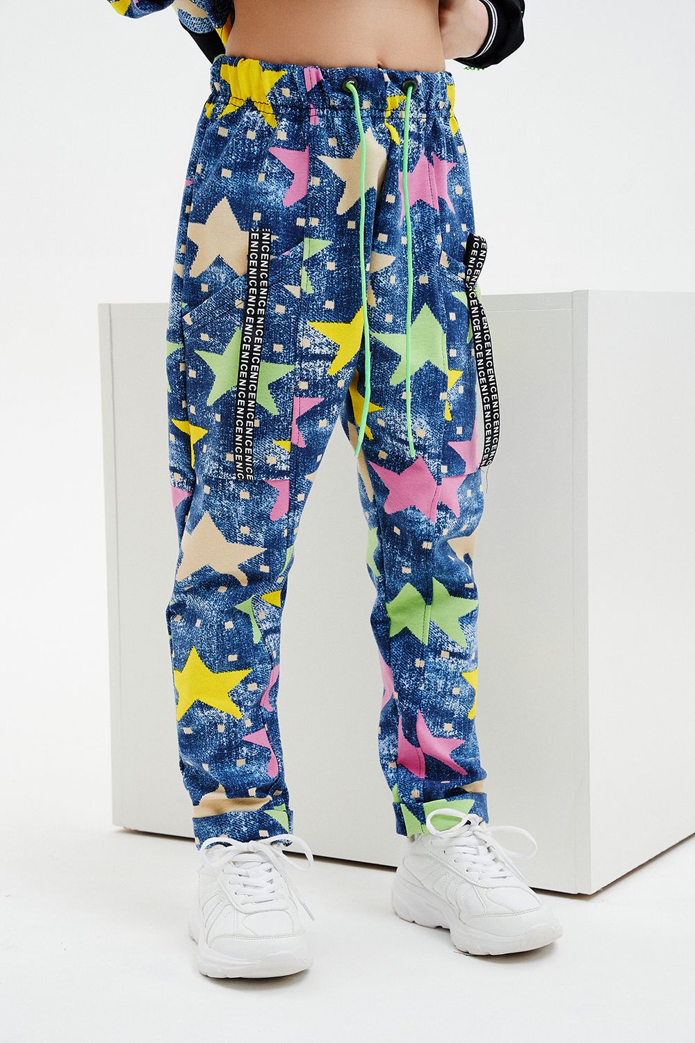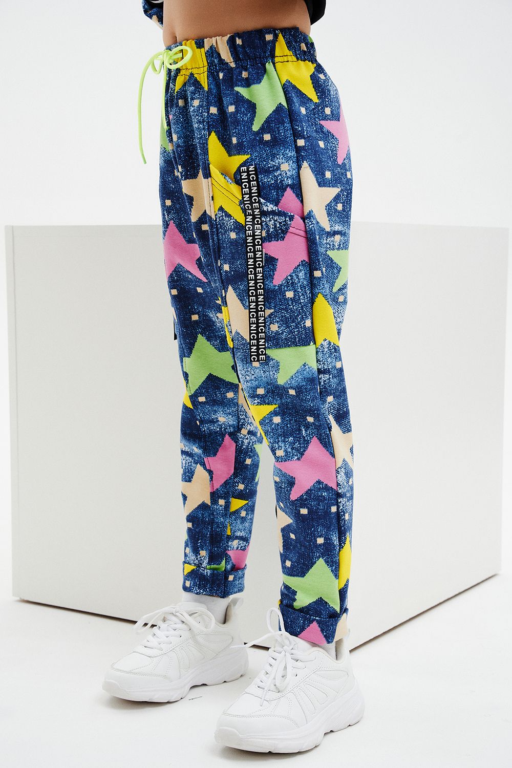Костюм детский свободного силуэта, состоит из свитшота и брюк (шароваров). Свитшот укороченный с карманом кенгуру на полочке, на рукаве яркий декор в форме звезды. Горловина и низ рукавов обработаны эластичной рибаной. Брюки свободного кроя с карманами в швах оформленными декоративной тесьмой, имеют яркие элементы в виде звезды и шнурка. Низ брюк обработан манжетой с отворотом из основной ткани.