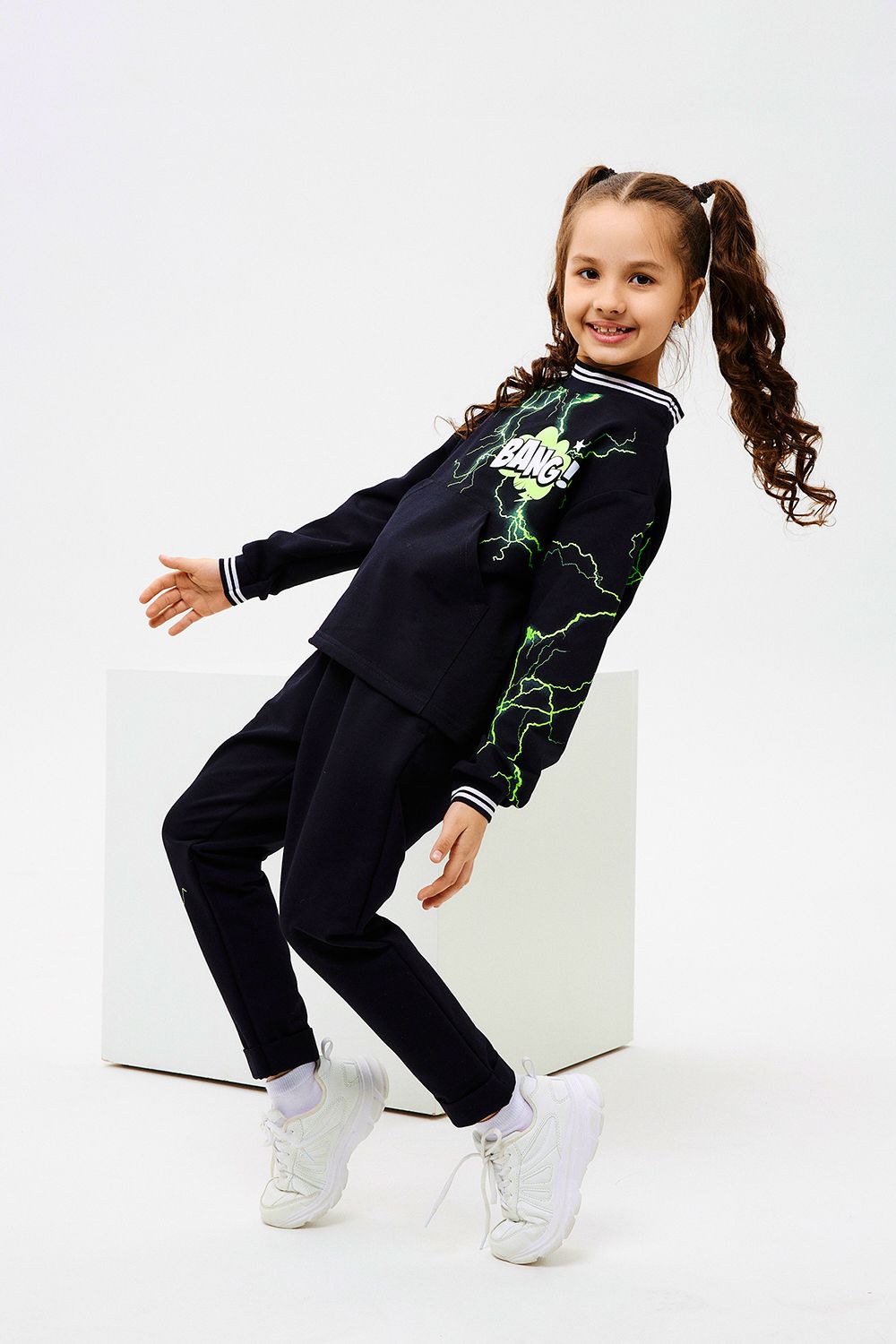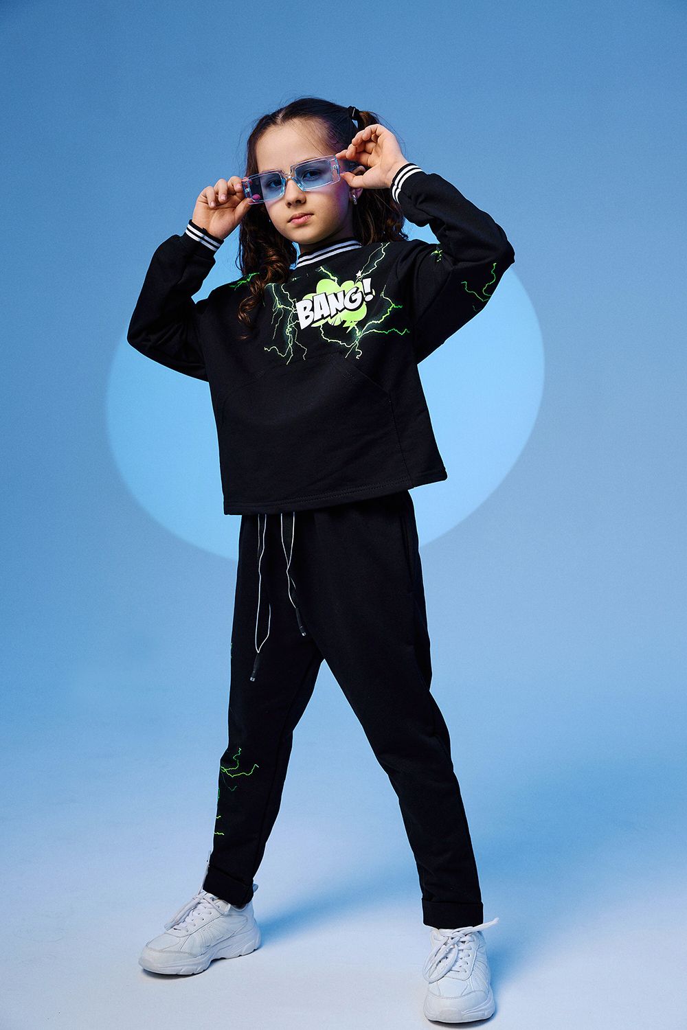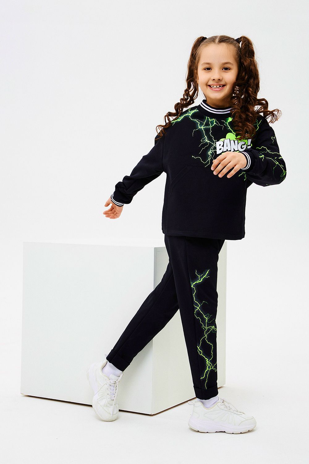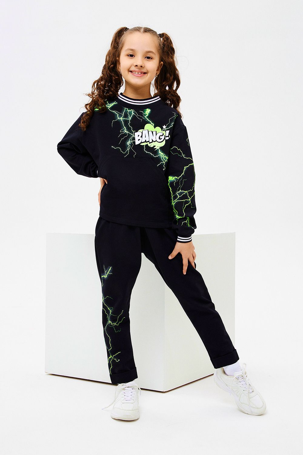 Стильный детский костюм свободного силуэта, состоит из толстовки и брюк с ярким принтом.