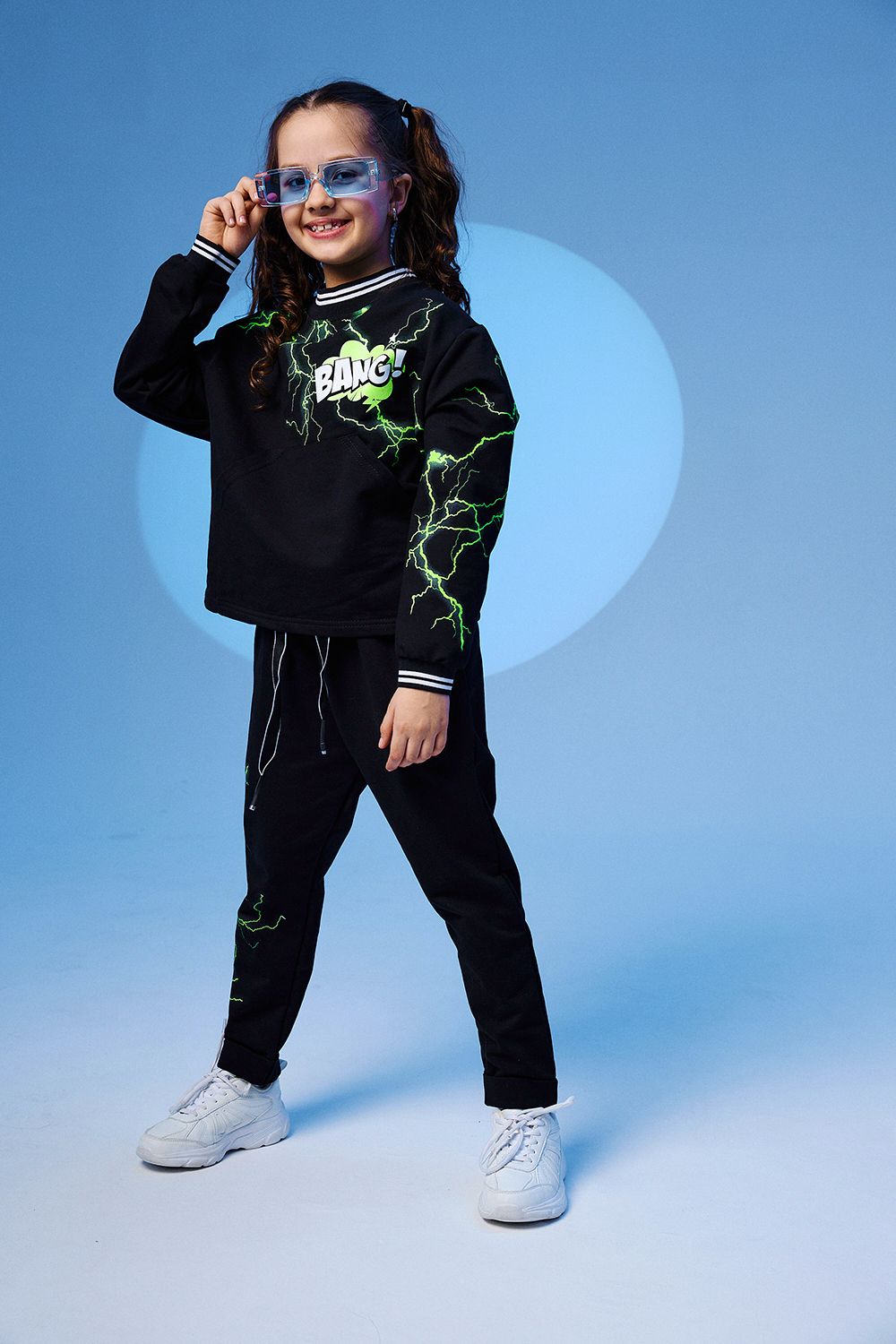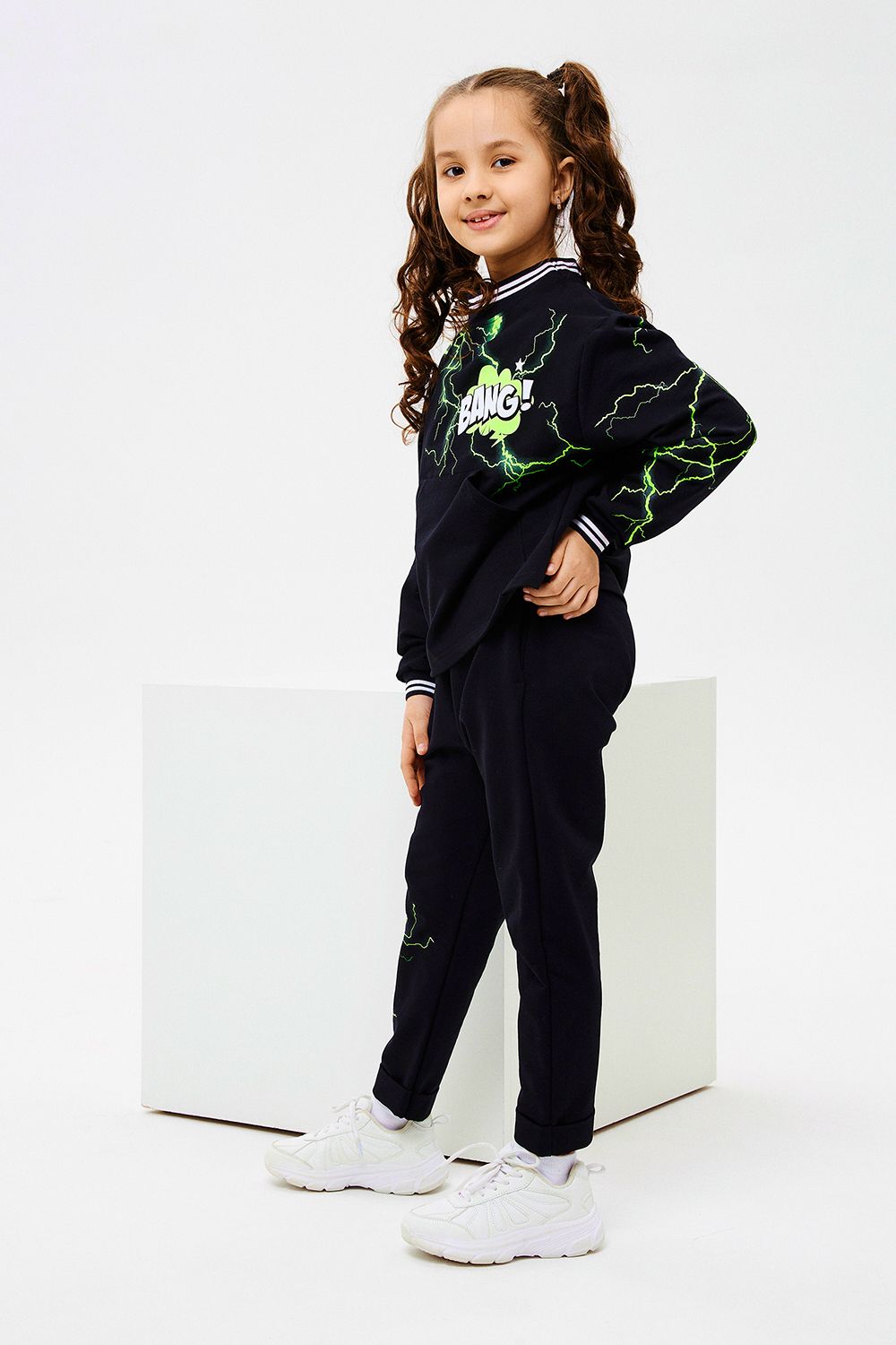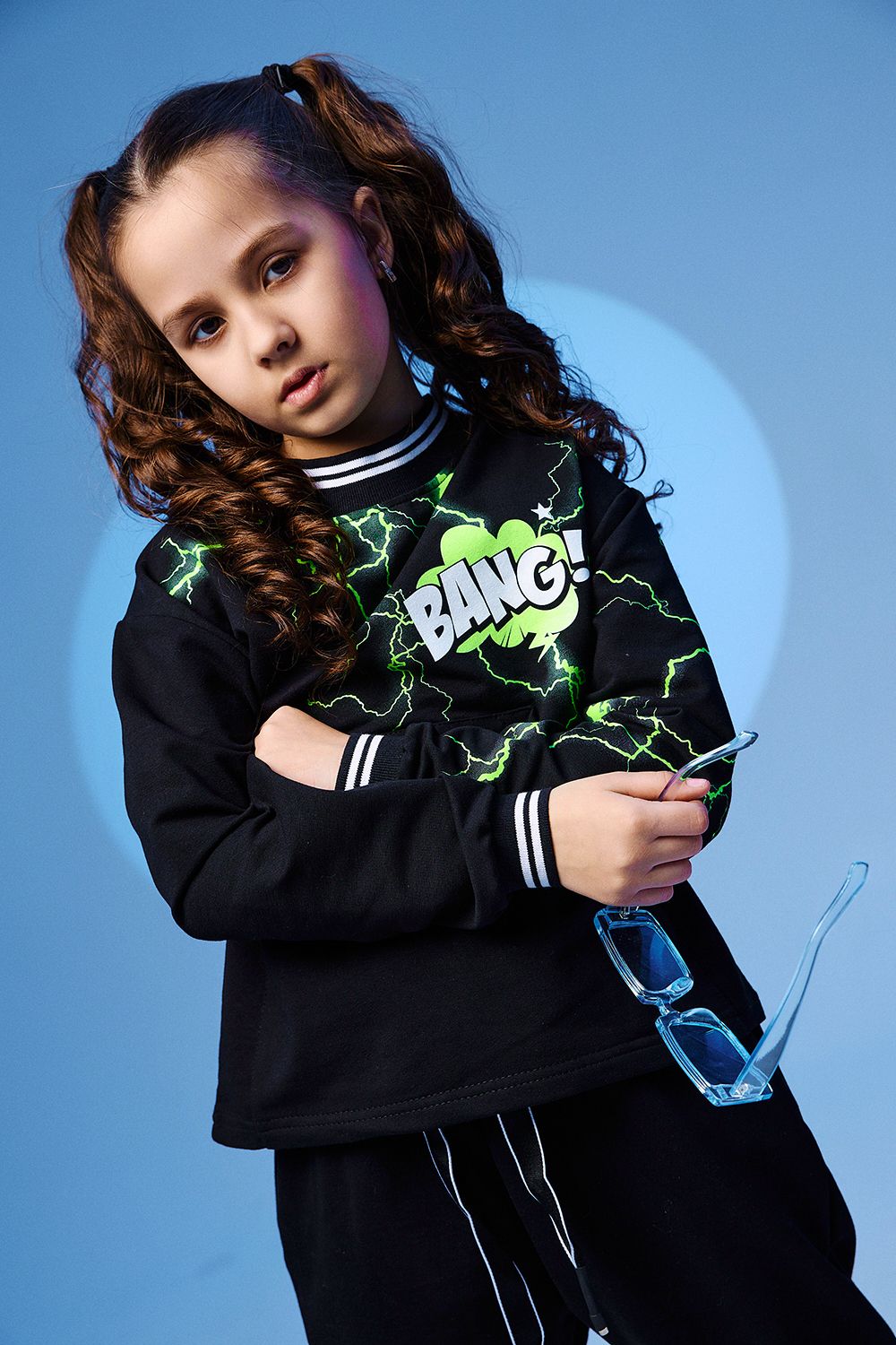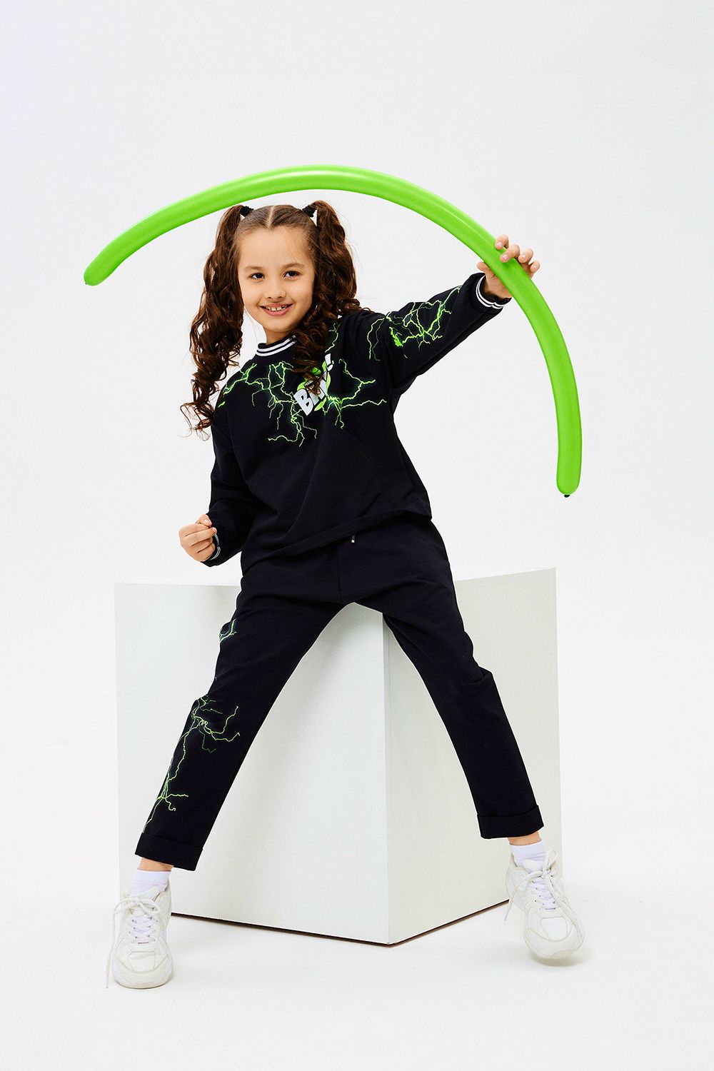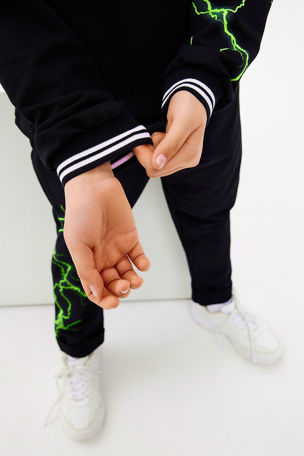 Стильный детский костюм свободного силуэта, состоит из толстовки и брюк с ярким принтом.