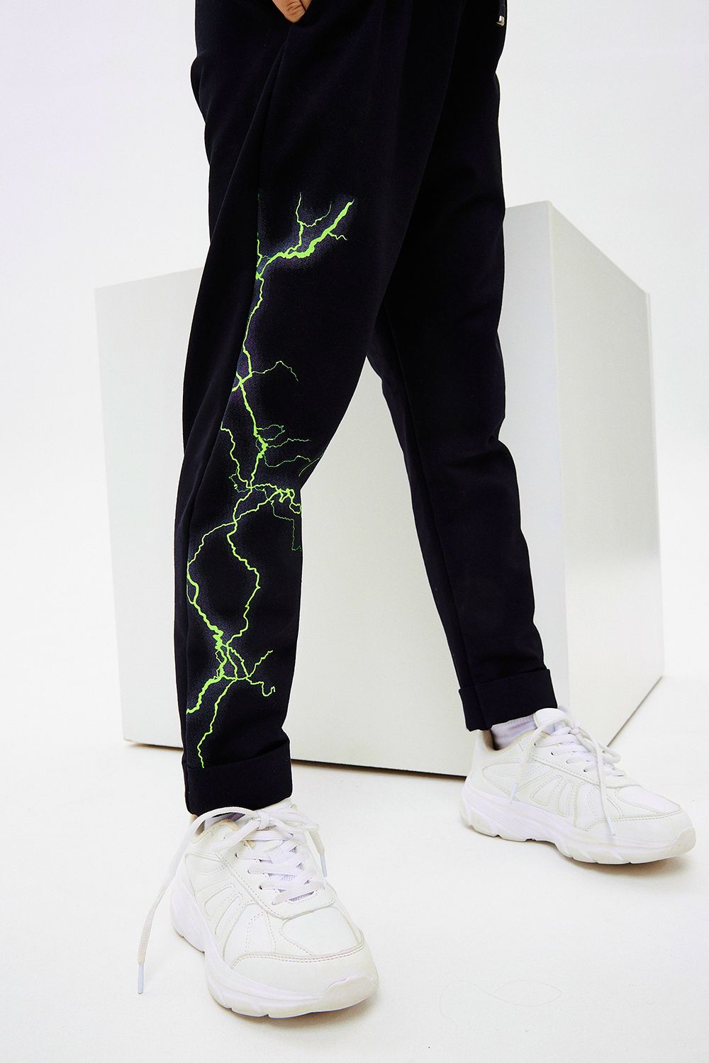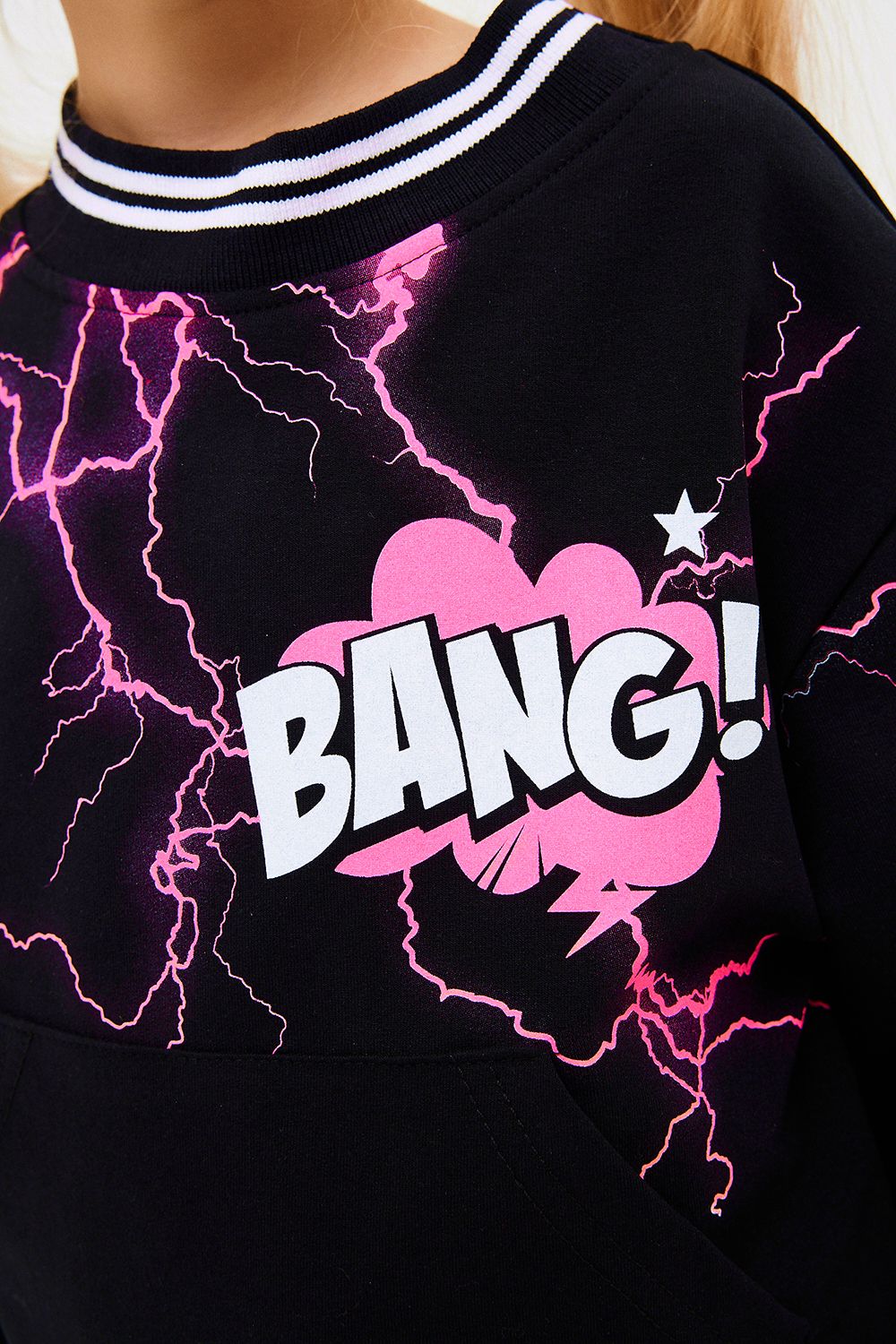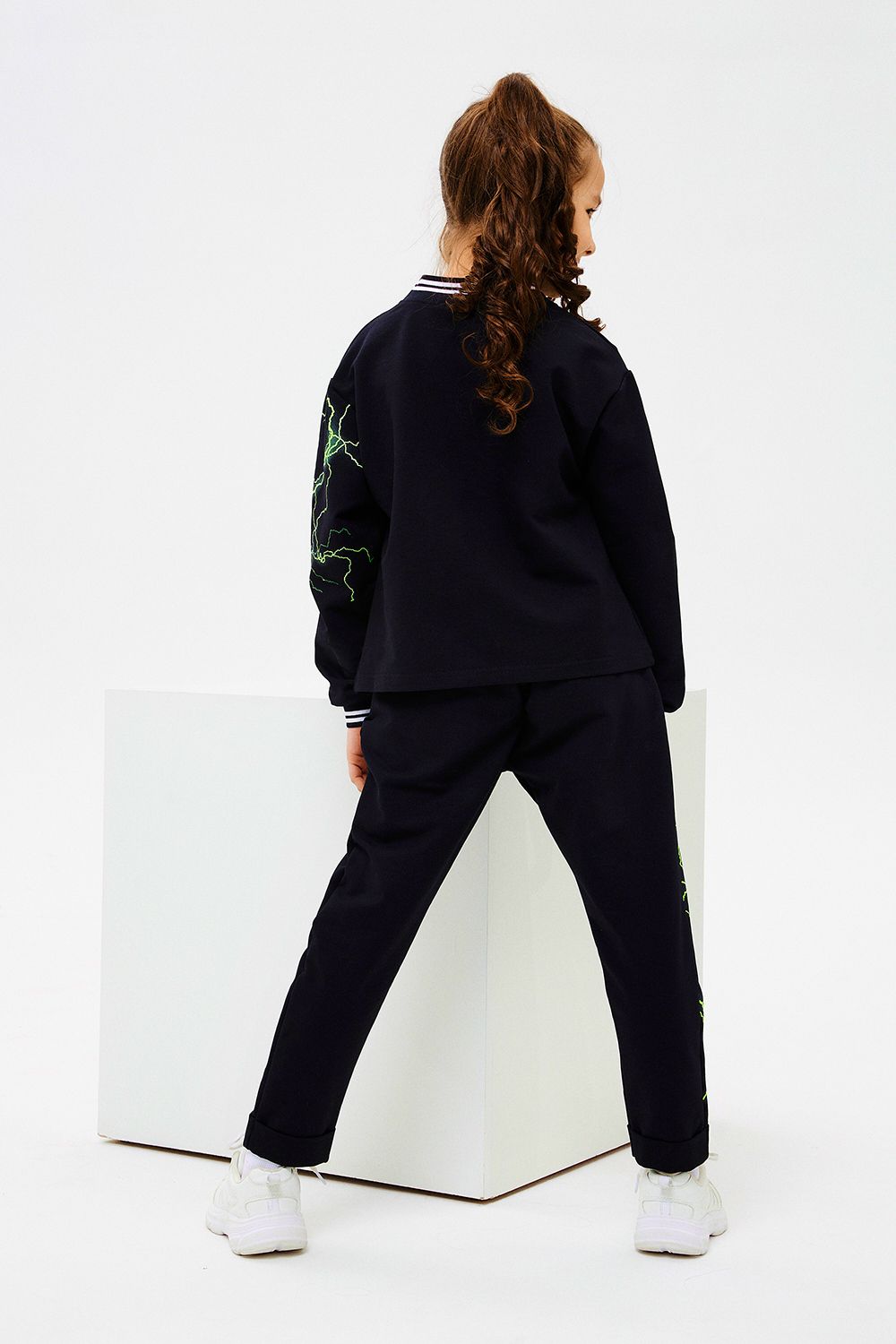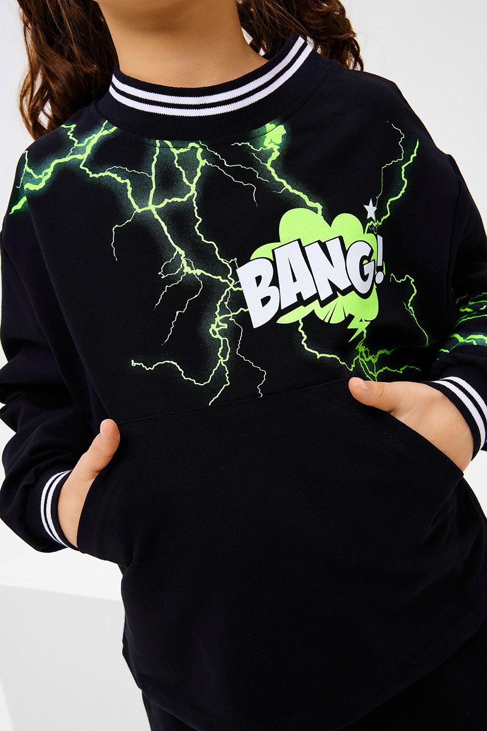 Стильный детский костюм свободного силуэта, состоит из толстовки и брюк с ярким принтом.