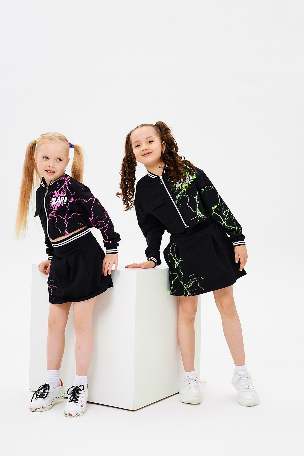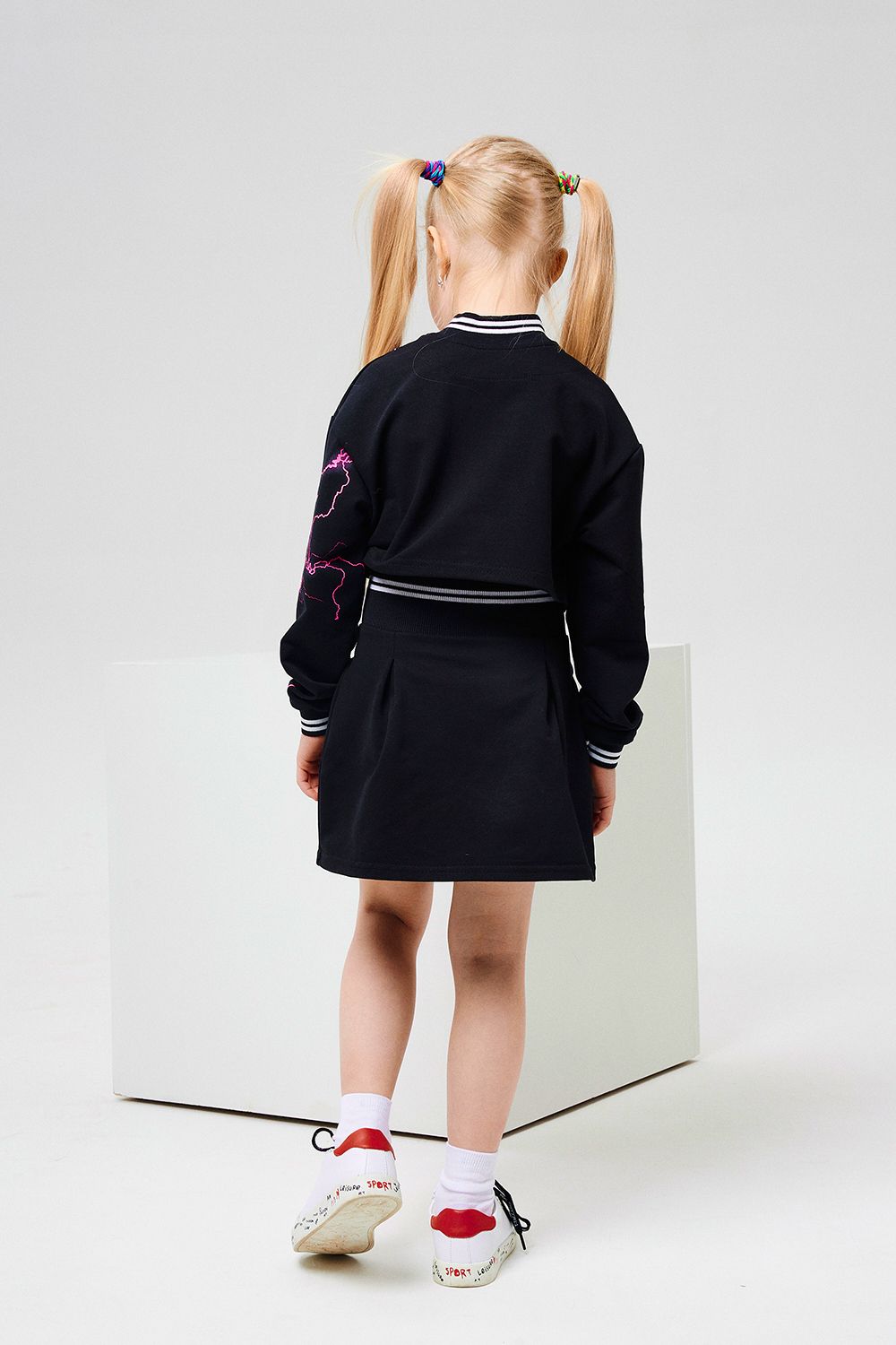 Стильный детский костюм состоит из бомбера и юбки с ярким принтом.