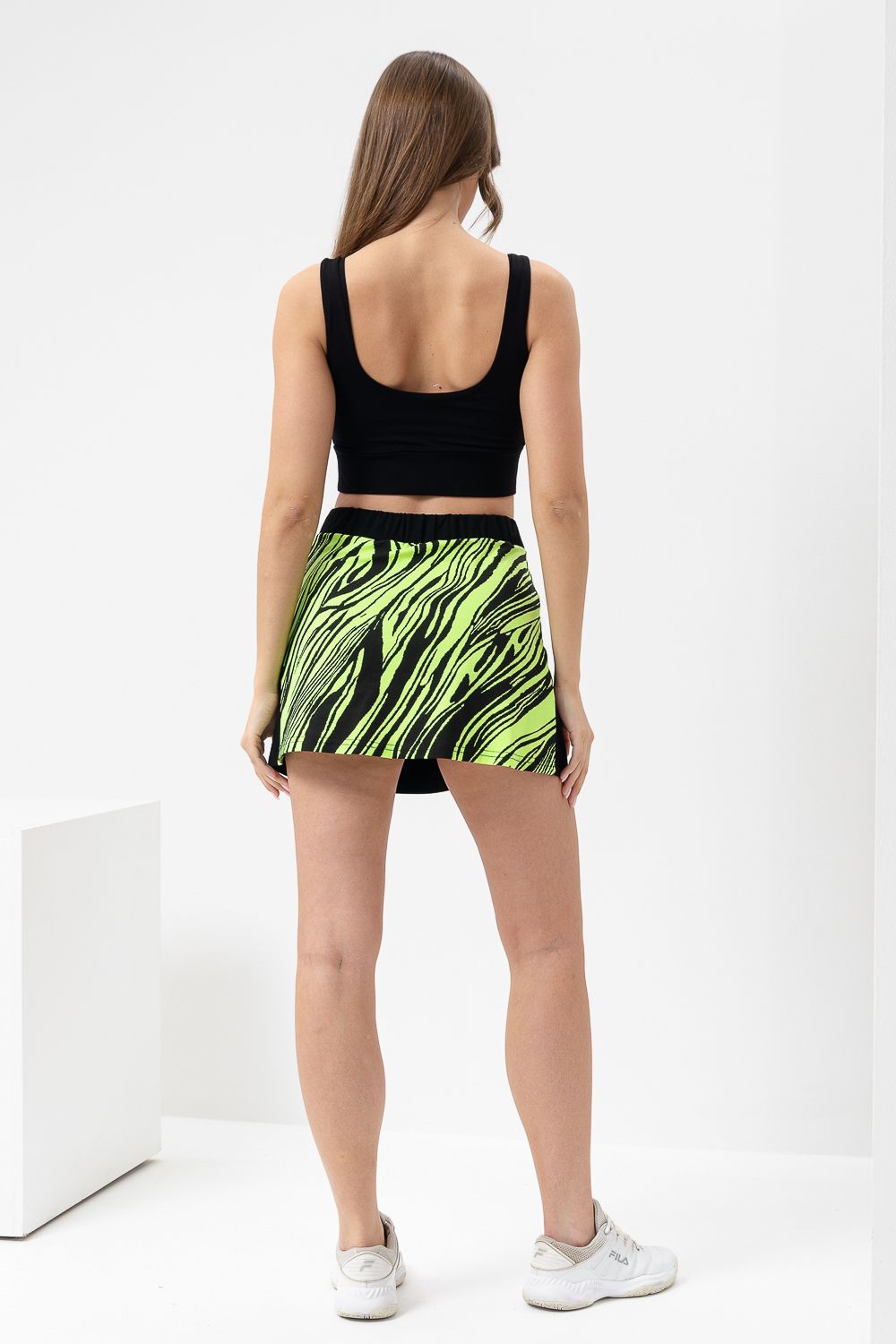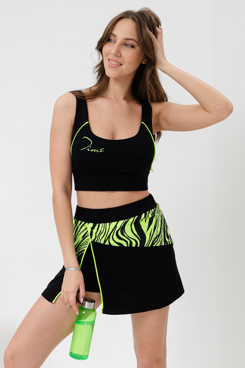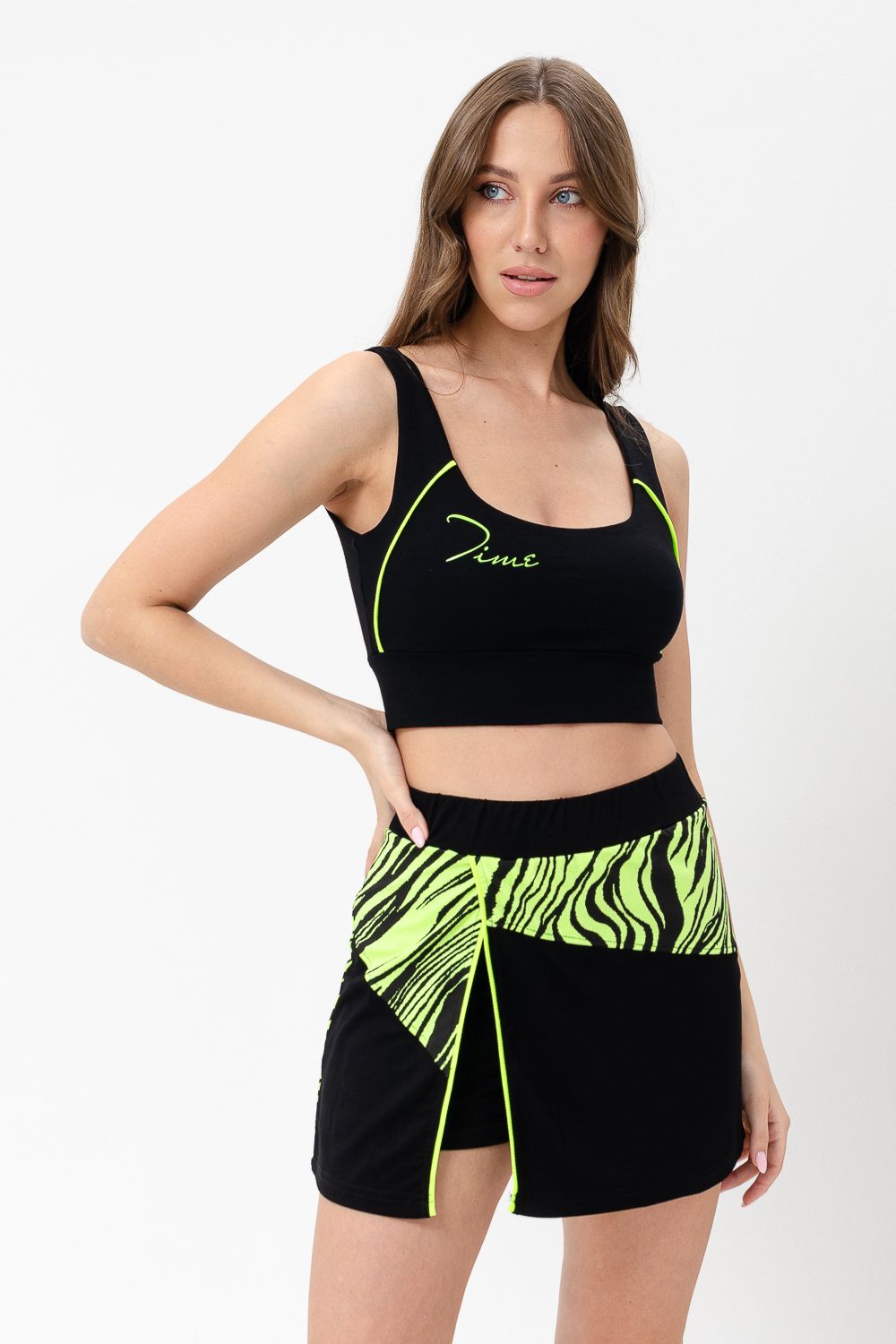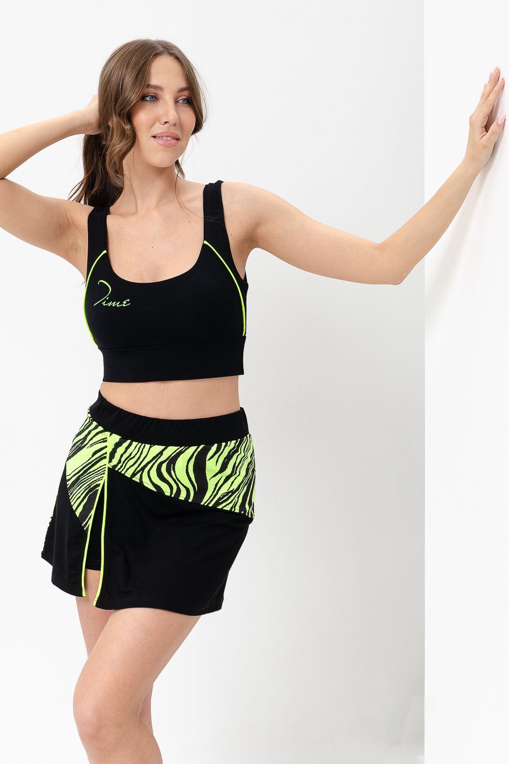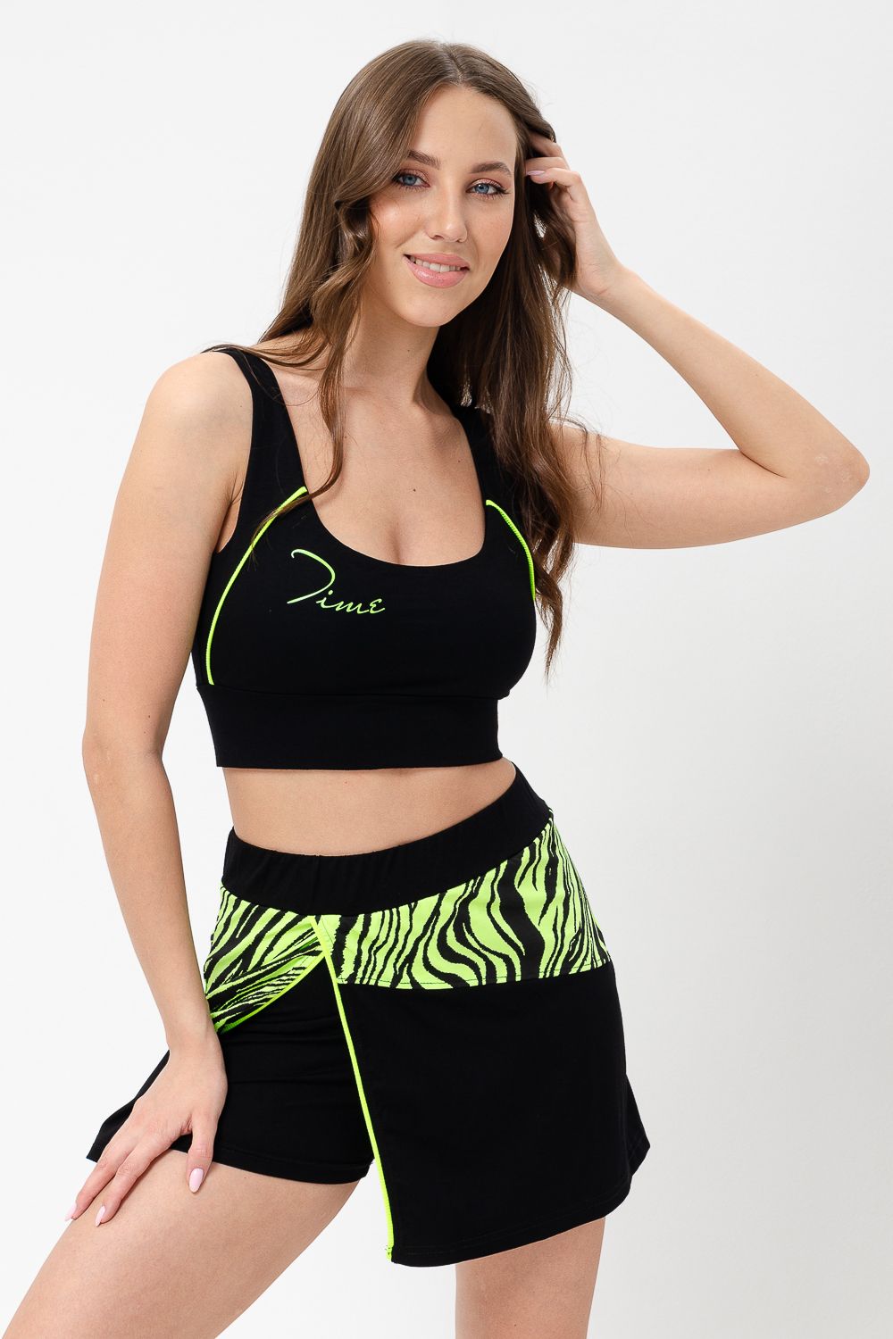 Костюм женский спортивный состоит из укороченного топа и юбки - шорт, с принтом и отделкой из яркого канта. Подходит для активного отдыха и занятий спортом. Очень удобен для езды на велосипеде.