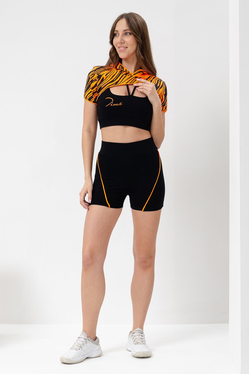 Костюм женский спортивный - тройка, состоит из худи с капюшоном, укороченного топа на тонких бретелях и шорт с широкой эластичной резинкой в поясе.