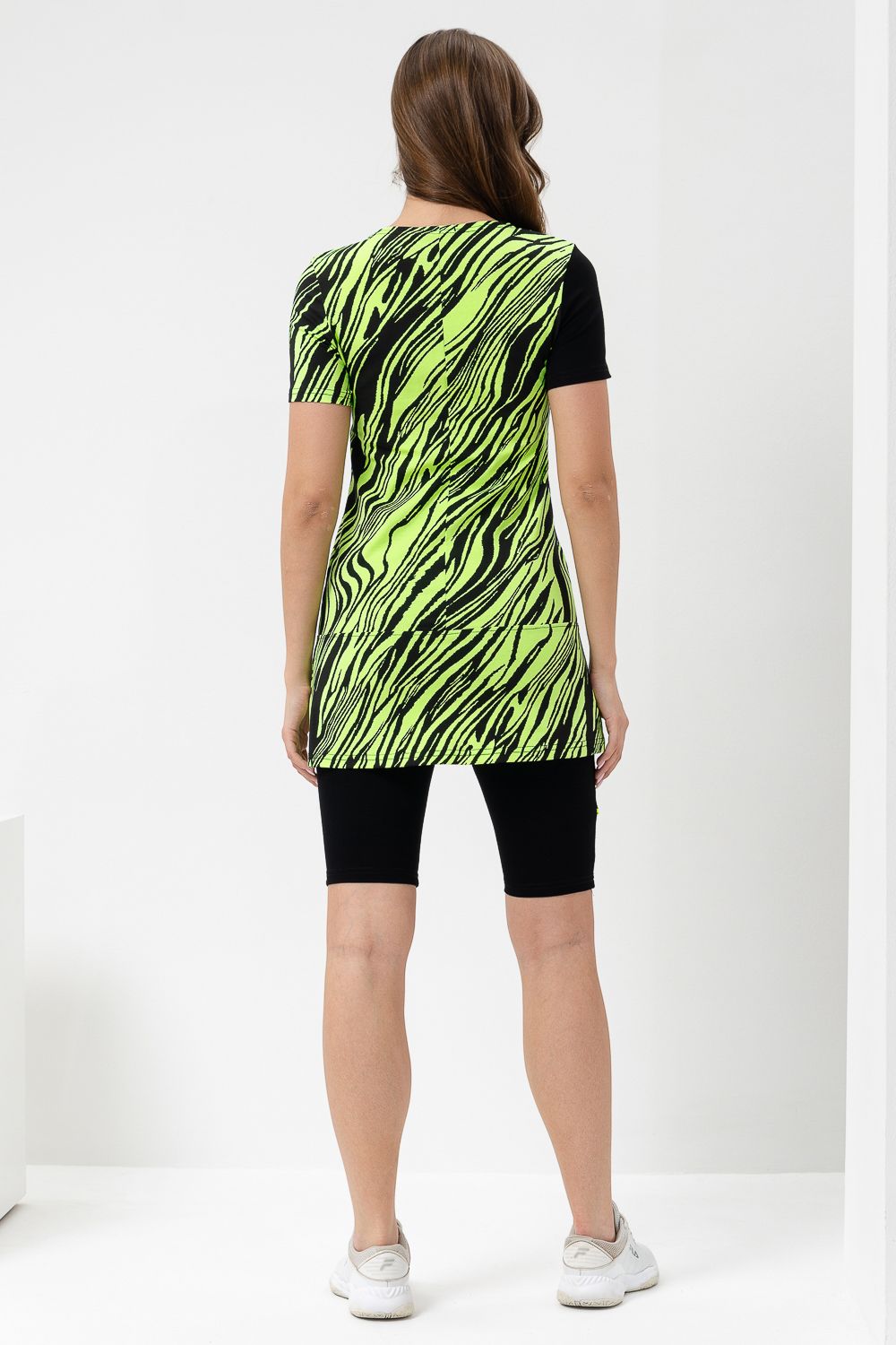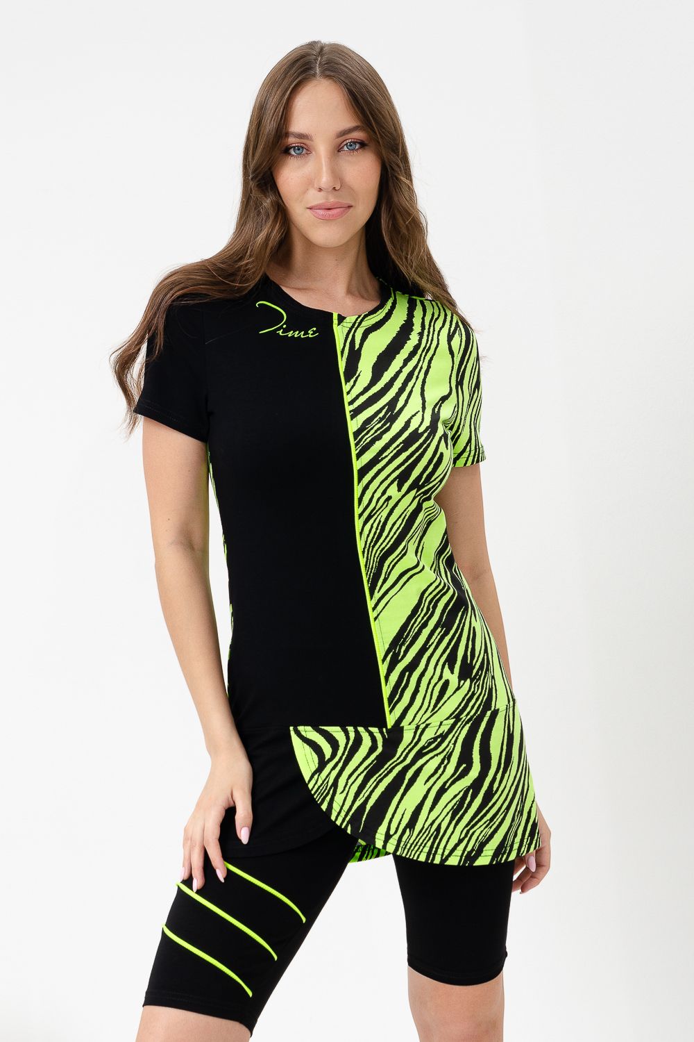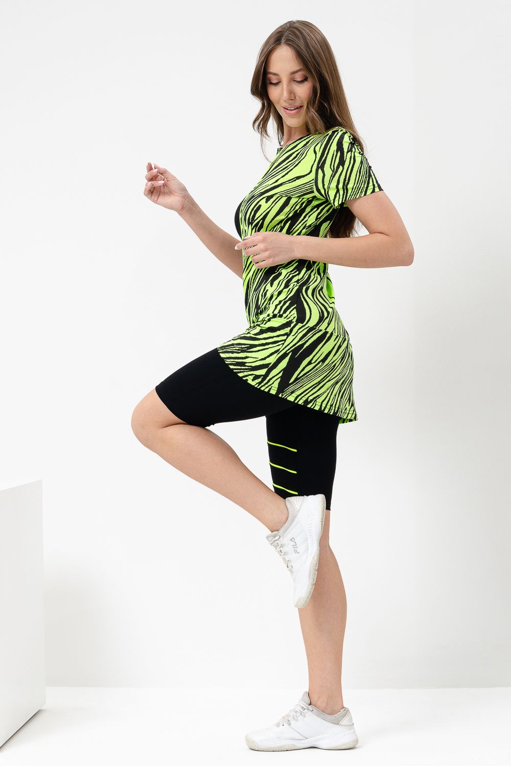 Костюм женский состоит из туники и велосипедок, туника полуприлегающего силуэта с принтом на полочке с коротким втачным рукавом, велосипедки с широкой эластичной резинкой на поясе с ярким кантом на передней половинке.