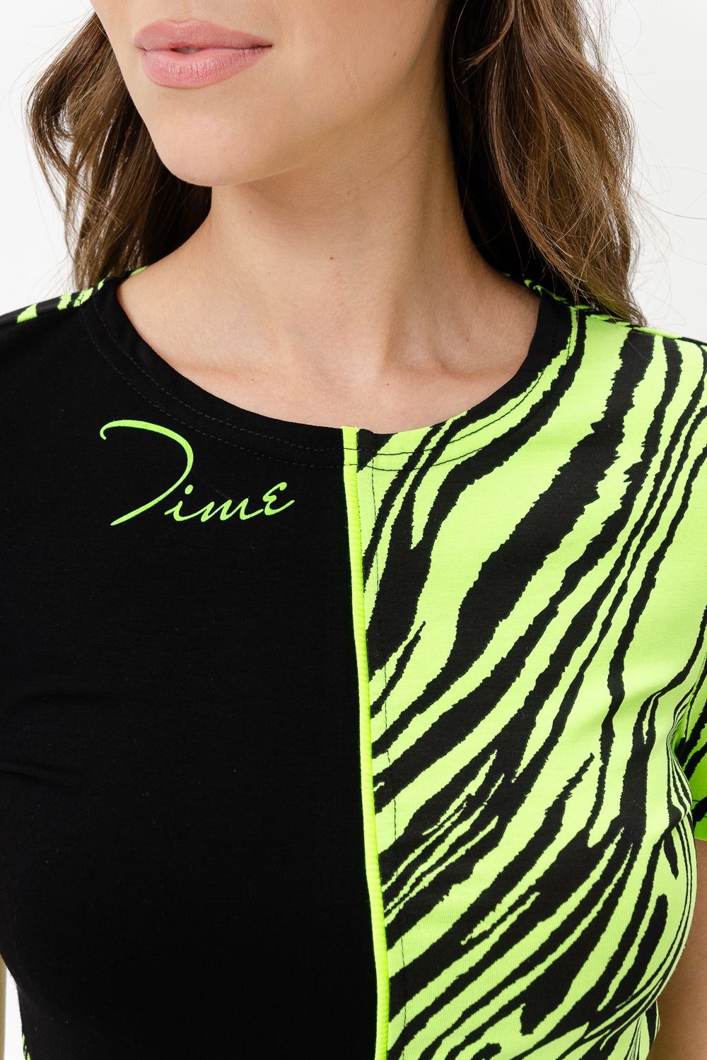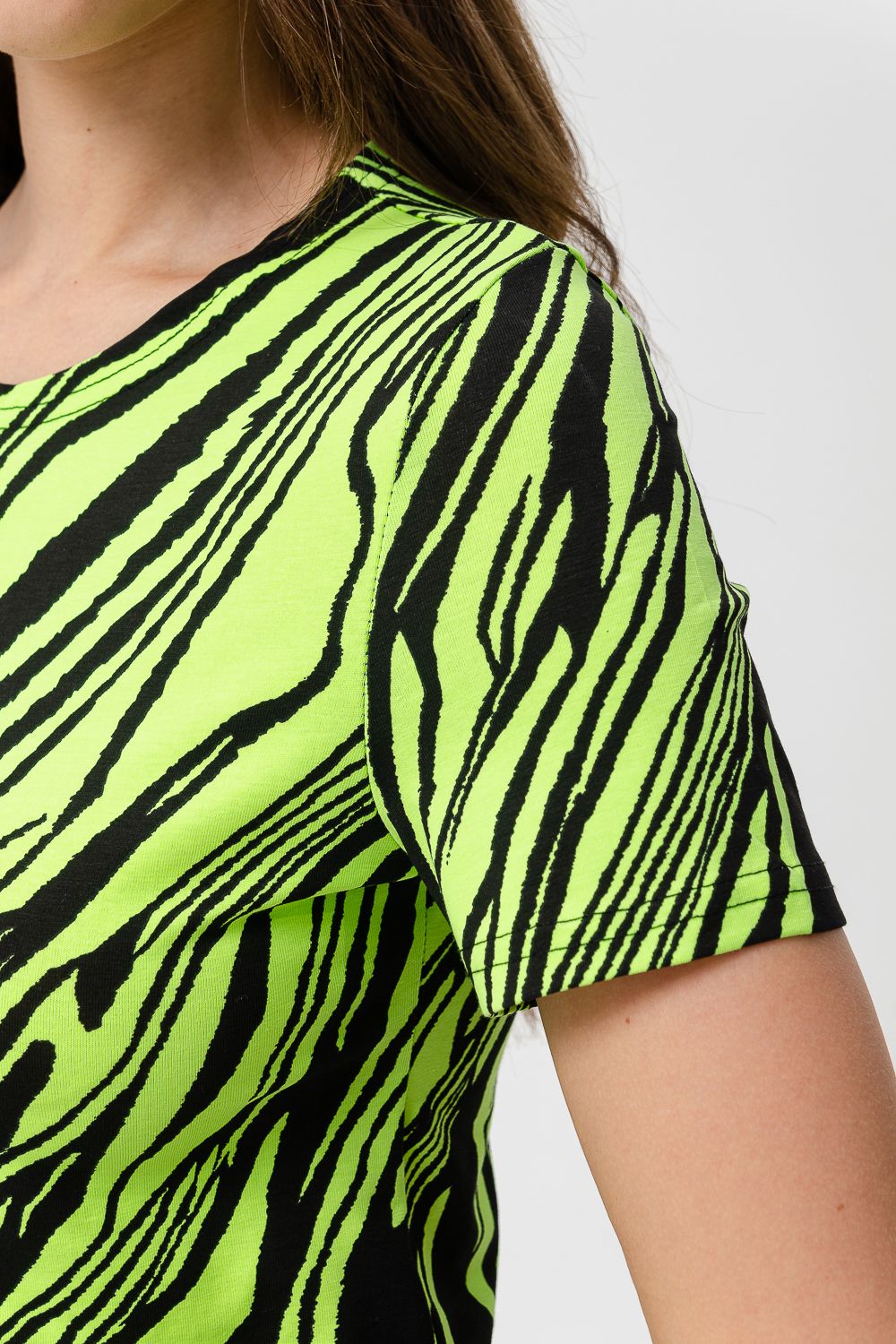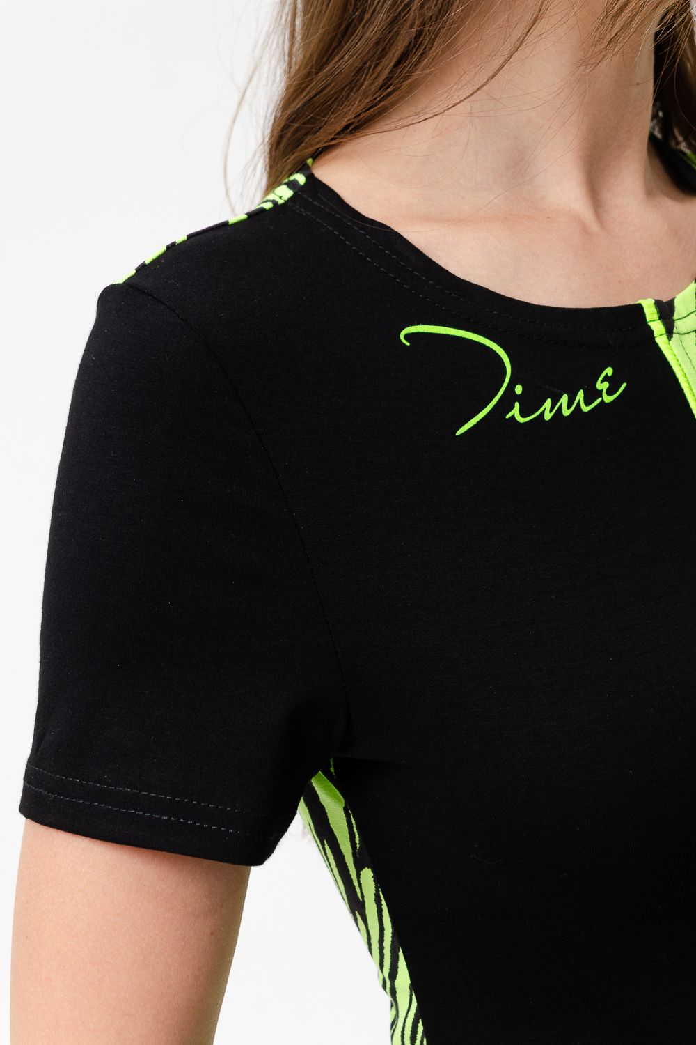 Костюм женский состоит из туники и велосипедок, туника полуприлегающего силуэта с принтом на полочке с коротким втачным рукавом, велосипедки с широкой эластичной резинкой на поясе с ярким кантом на передней половинке.