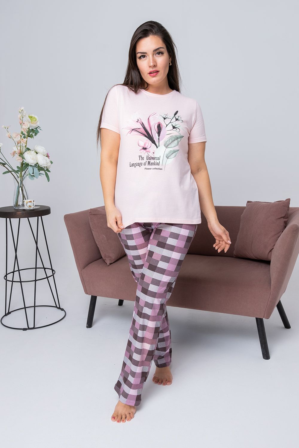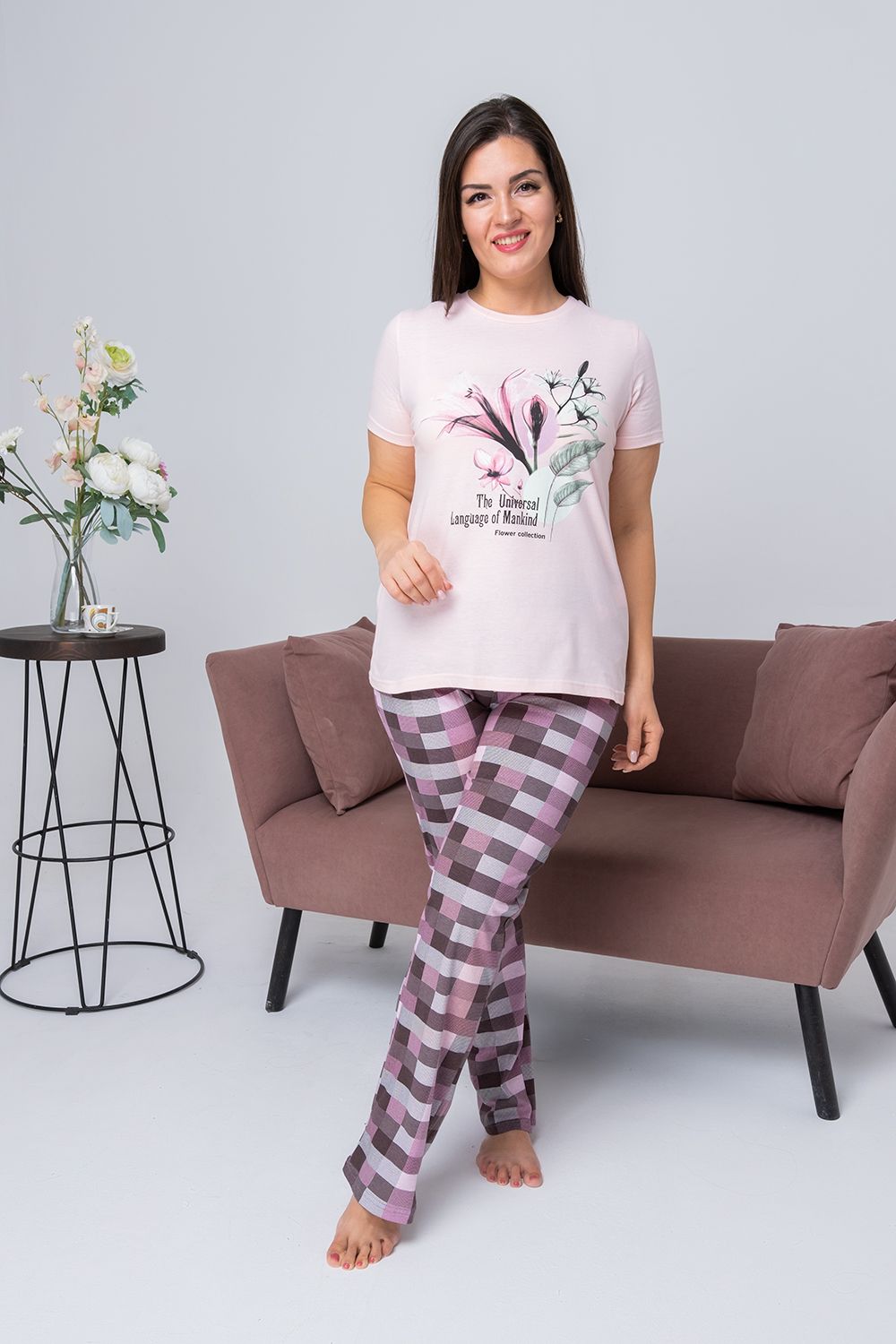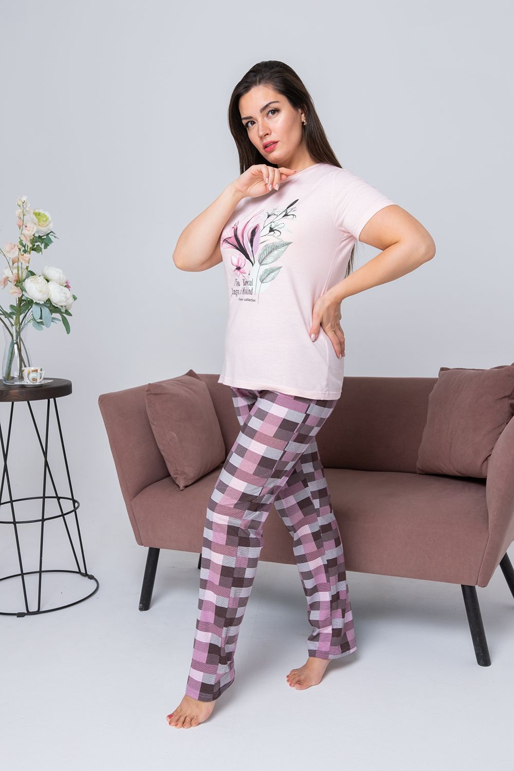 Костюм женский состоит из футболки с коротким рукавом из ткани кулирка гладь, на полочке красивый принт, и брюк из ткани кулирка, принт - клетка. Костюм для дома, отдыха, комфортный, удобный, не меняет цвет после стирки.