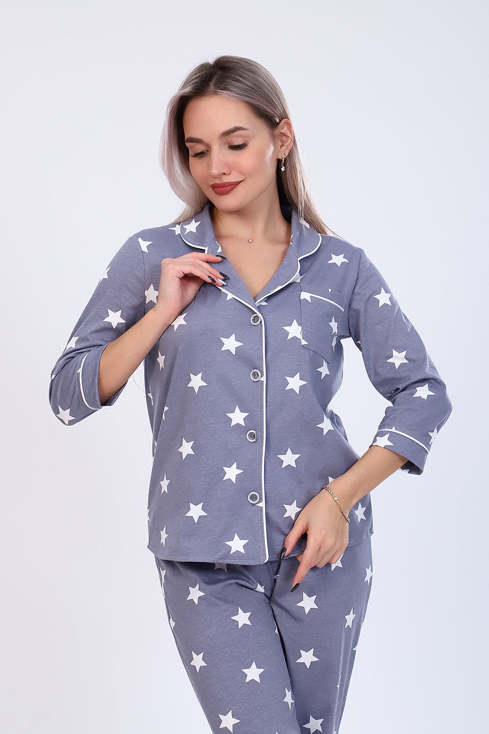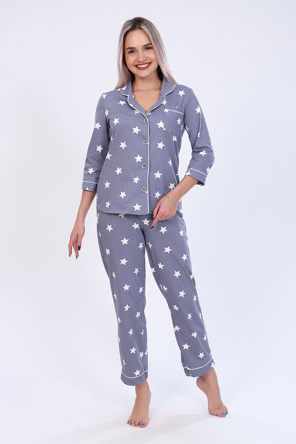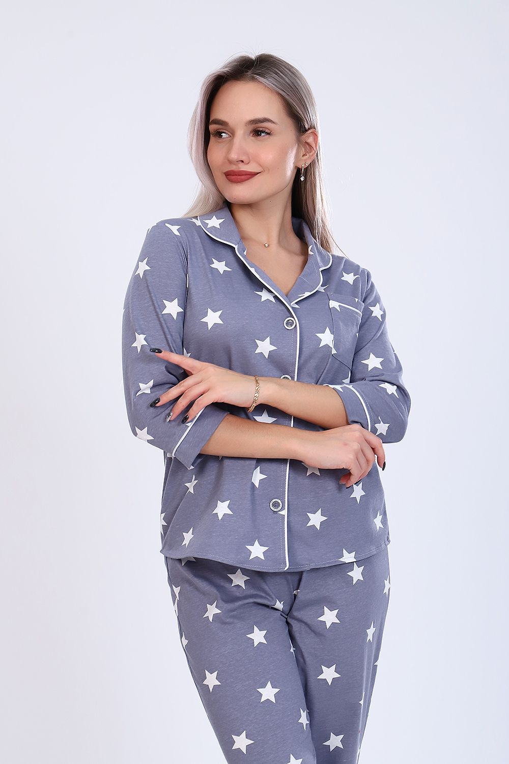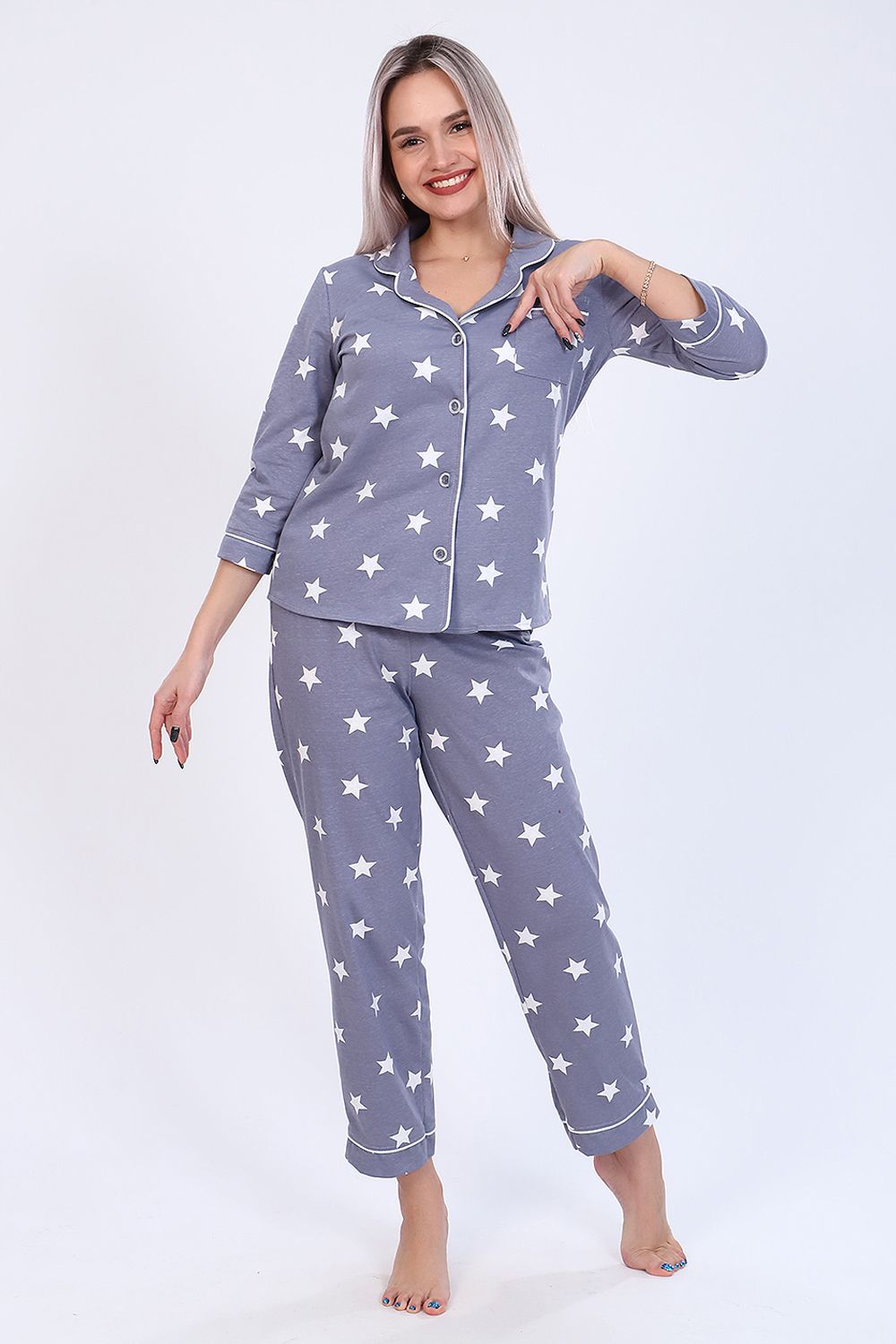Уютная стильная пижама женская состоит из брюк и рубашки. Рубашка с 3/4 рукав, полуприлегающего силуэта, на пуговицах, с воротником в английском стиле обработан атласным кантом. Классическая расцветка, натуральная ткань, полуприлегающий силуэт. Комплект женский может использоваться и как домашняя пижама. Он также станет отличным приобретением для беременных и кормящих женщин, в подарок, маме, сестре, бабушке, подруге, женщинам больших размеров.