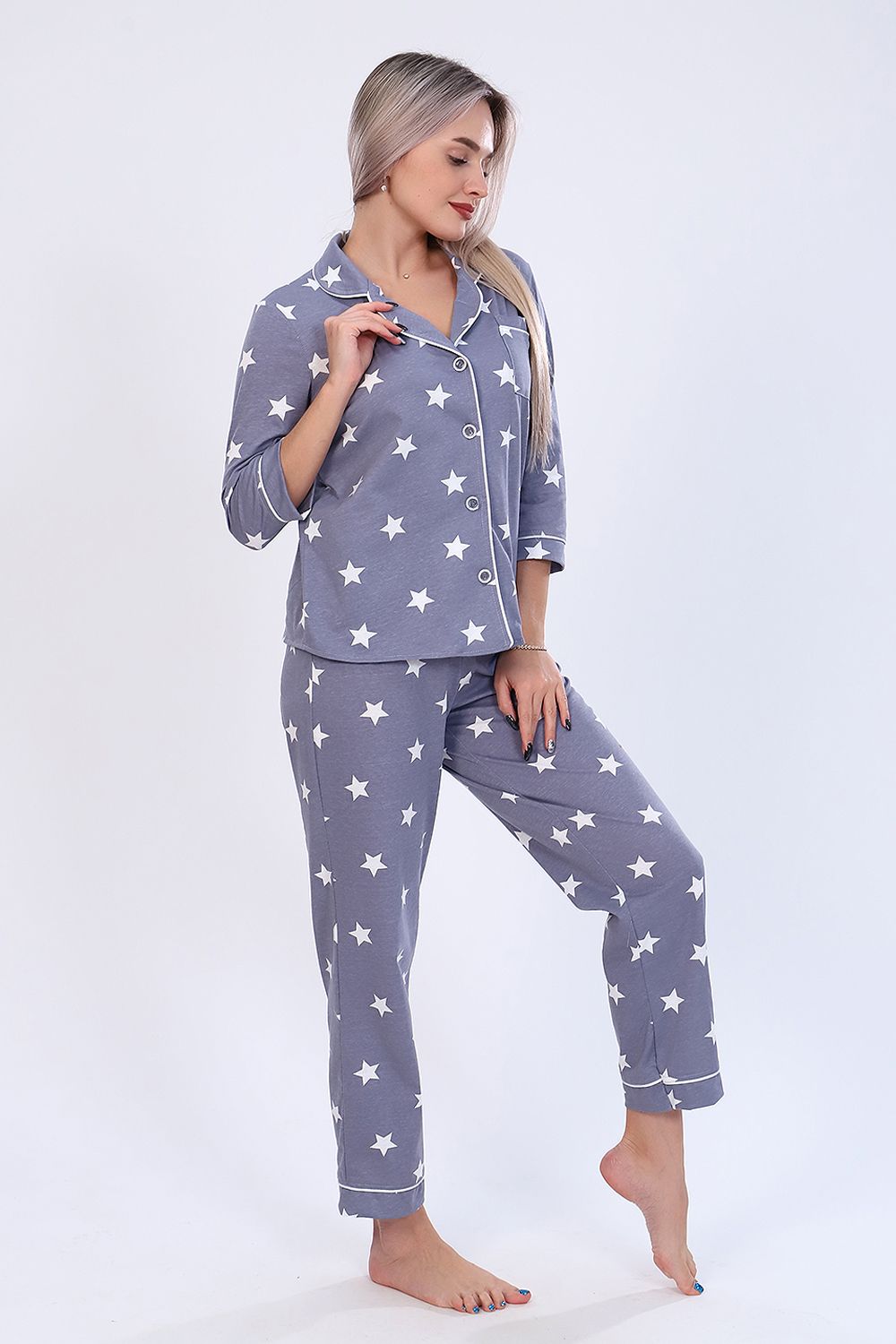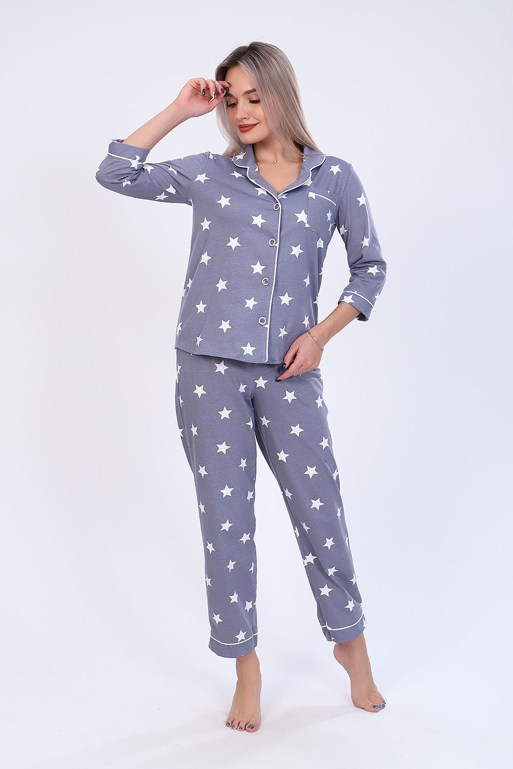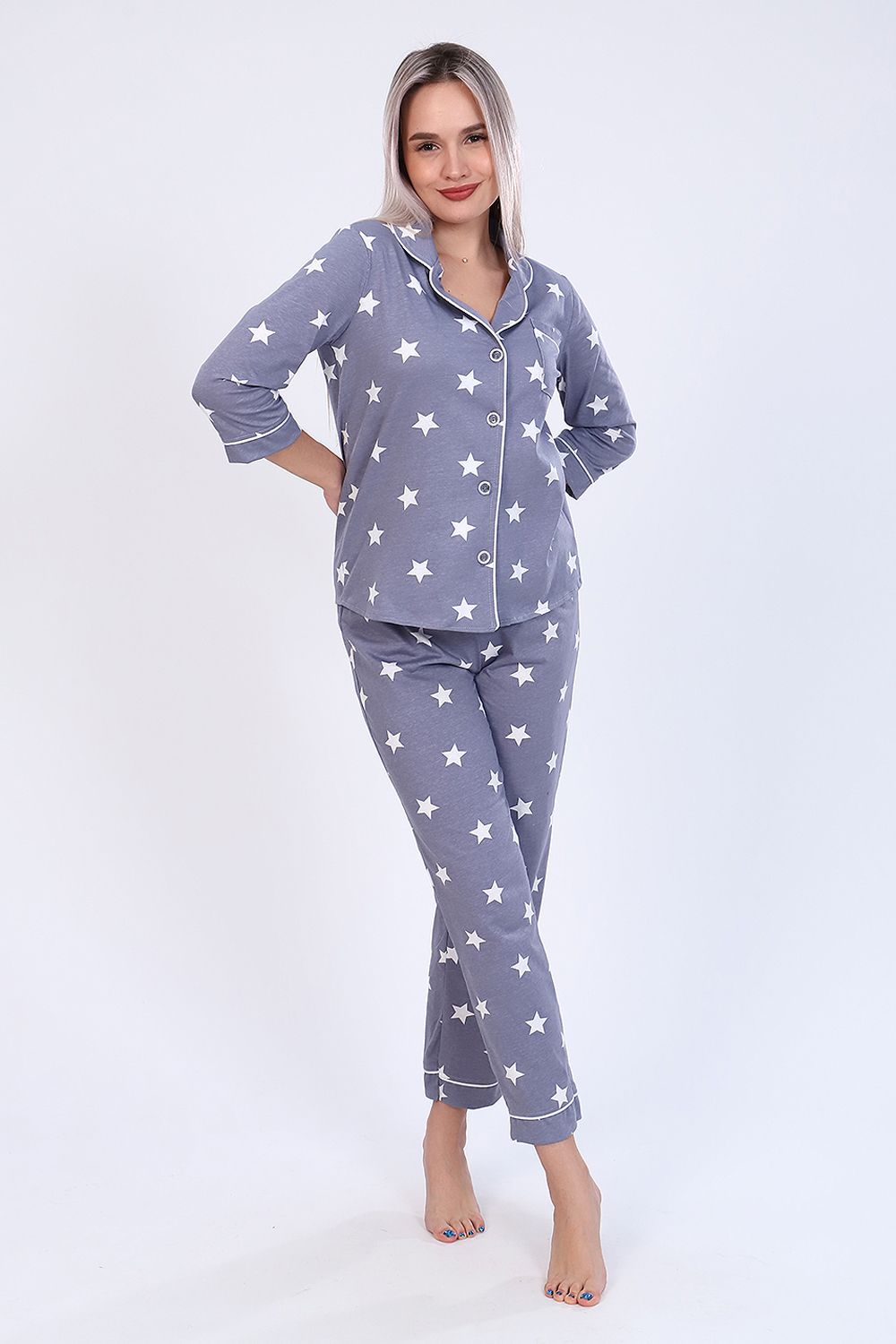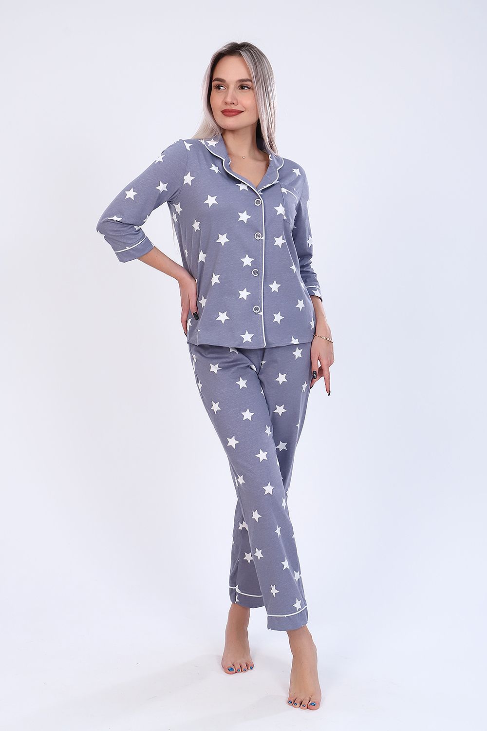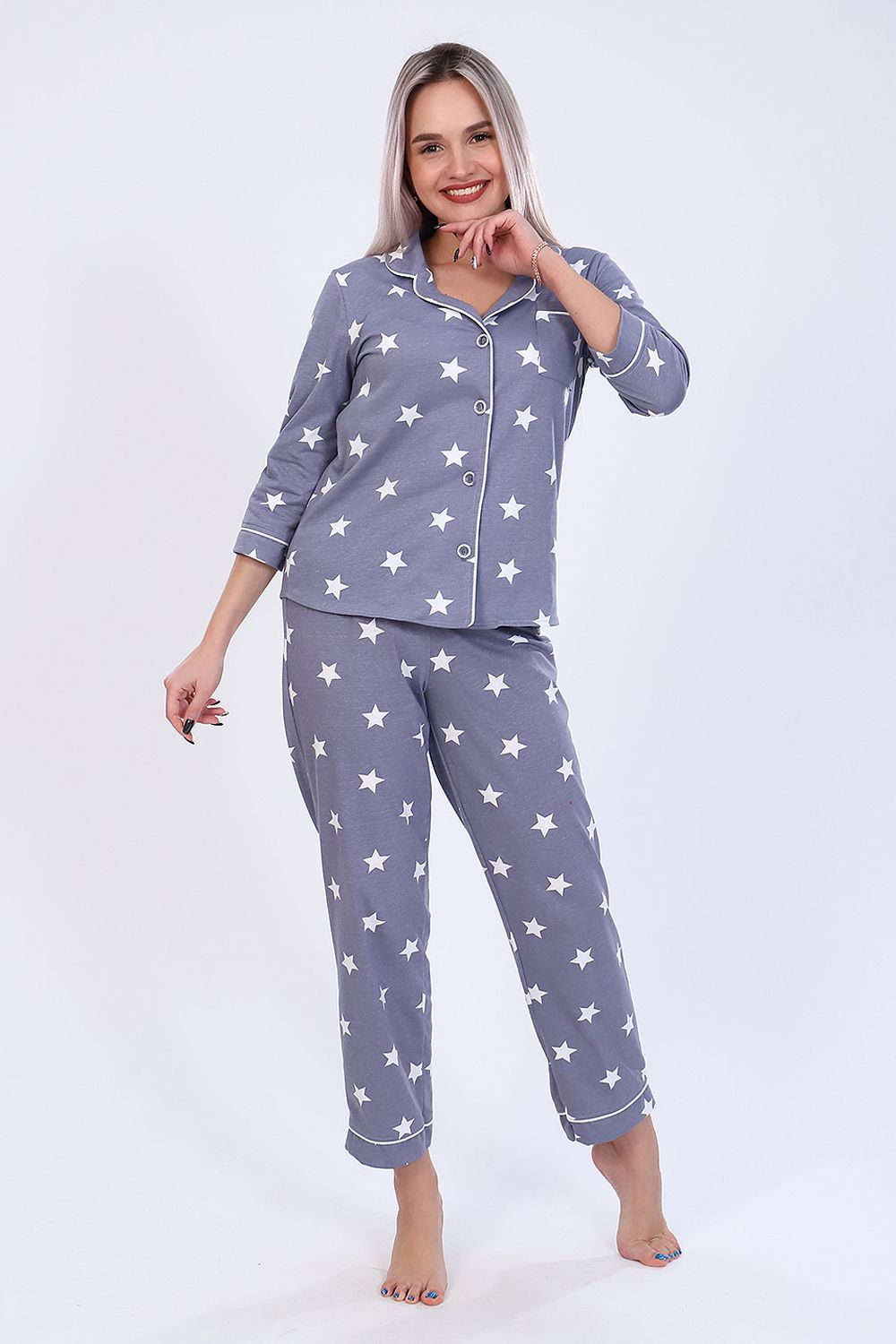 Уютная стильная пижама женская состоит из брюк и рубашки. Рубашка с 3/4 рукав, полуприлегающего силуэта, на пуговицах, с воротником в английском стиле обработан атласным кантом. Классическая расцветка, натуральная ткань, полуприлегающий силуэт. Комплект женский может использоваться и как домашняя пижама. Он также станет отличным приобретением для беременных и кормящих женщин, в подарок, маме, сестре, бабушке, подруге, женщинам больших размеров.