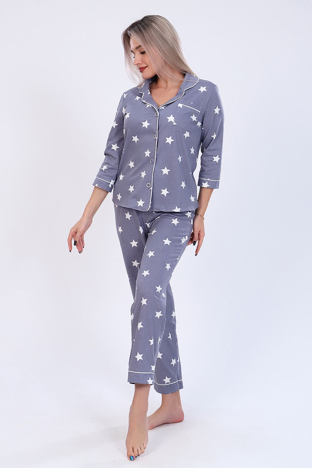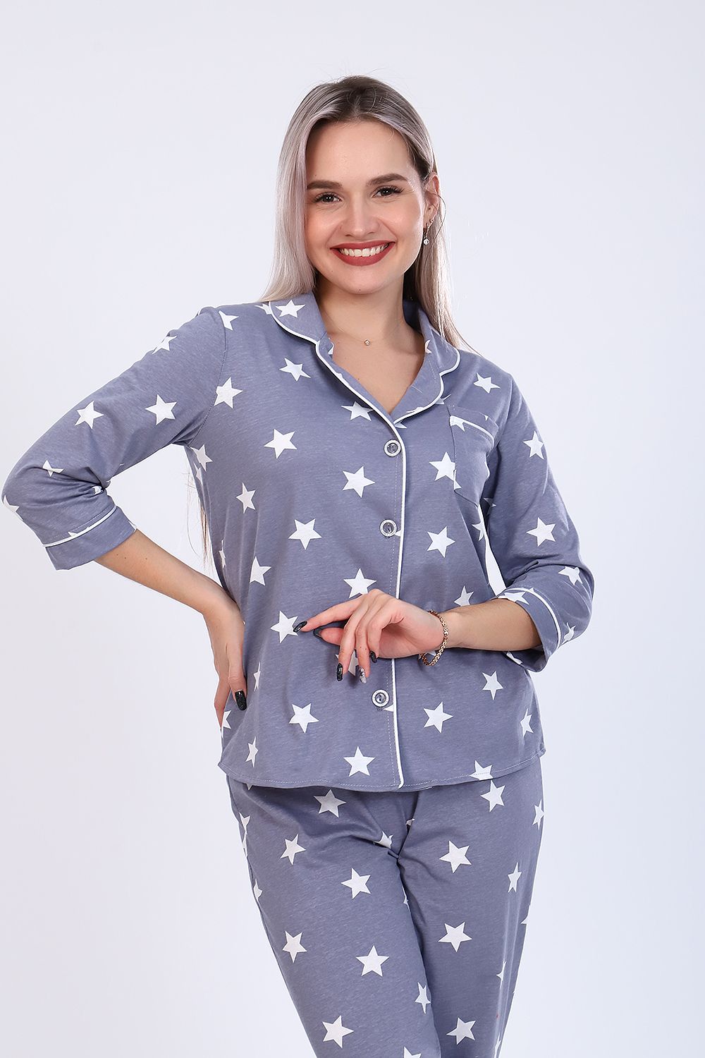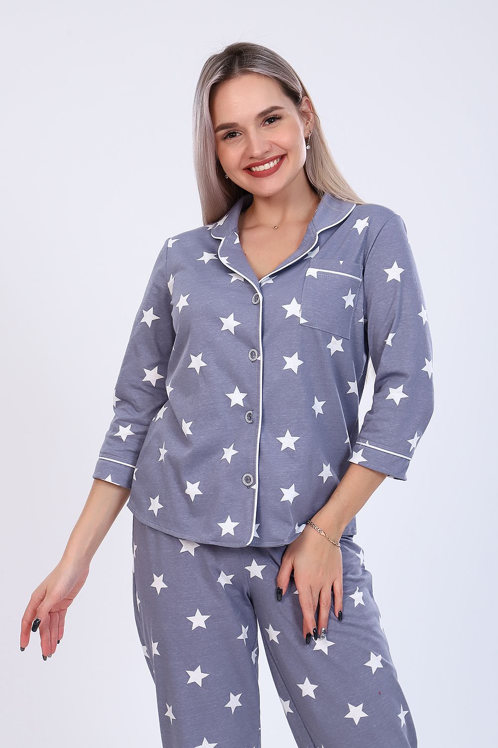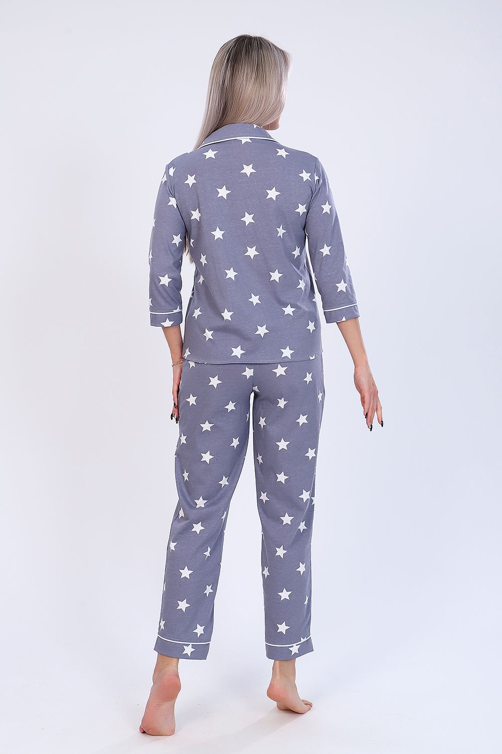 Уютная стильная пижама женская состоит из брюк и рубашки. Рубашка с 3/4 рукав, полуприлегающего силуэта, на пуговицах, с воротником в английском стиле обработан атласным кантом. Классическая расцветка, натуральная ткань, полуприлегающий силуэт. Комплект женский может использоваться и как домашняя пижама. Он также станет отличным приобретением для беременных и кормящих женщин, в подарок, маме, сестре, бабушке, подруге, женщинам больших размеров.