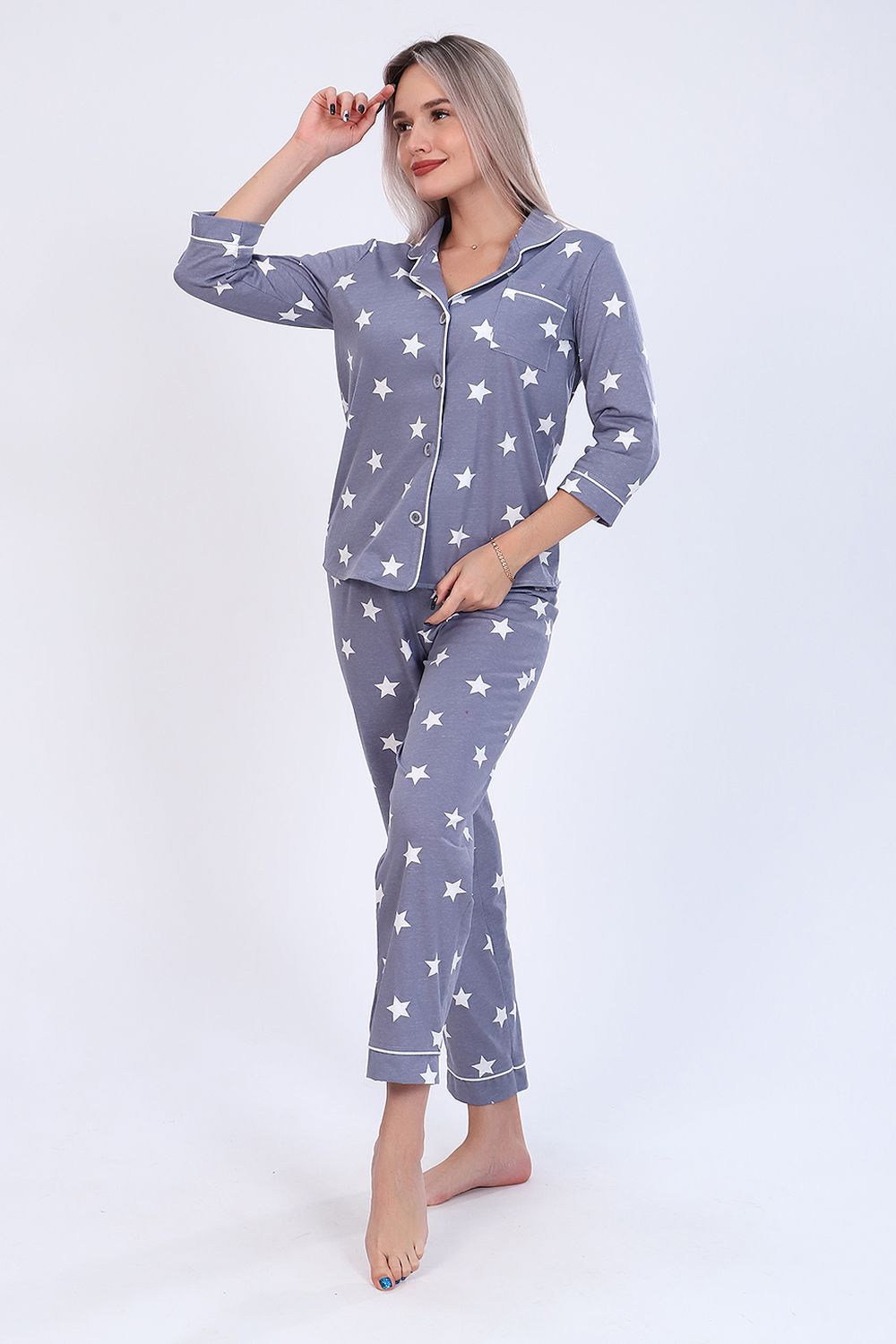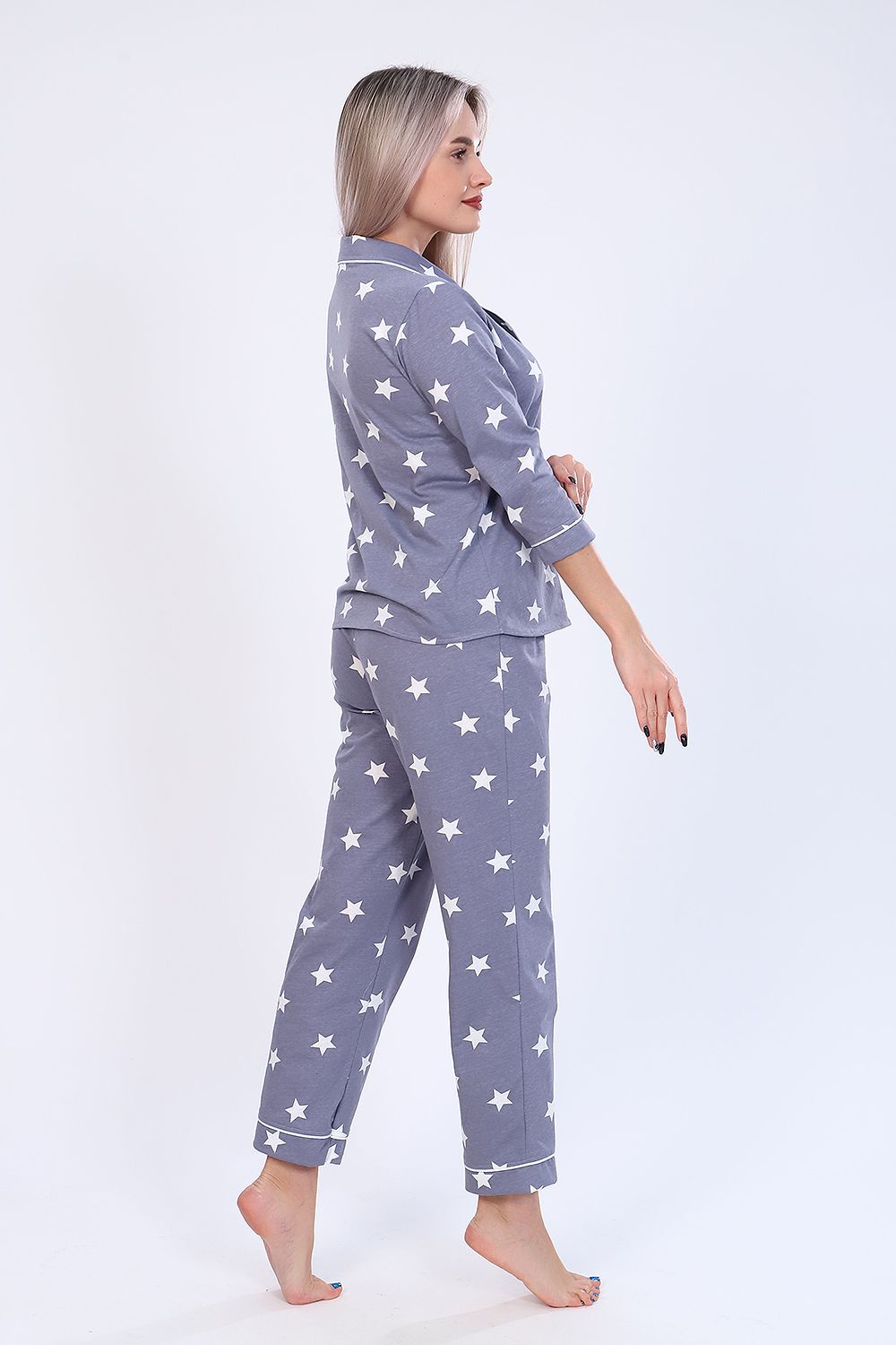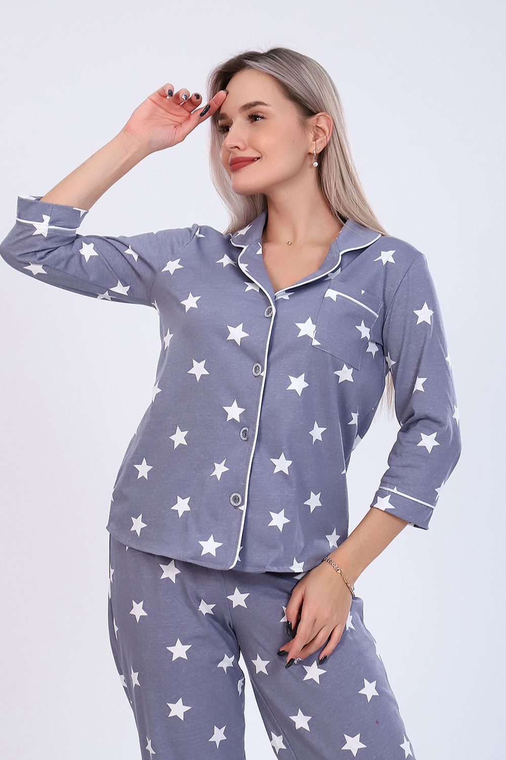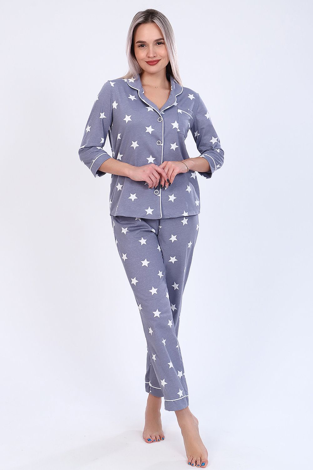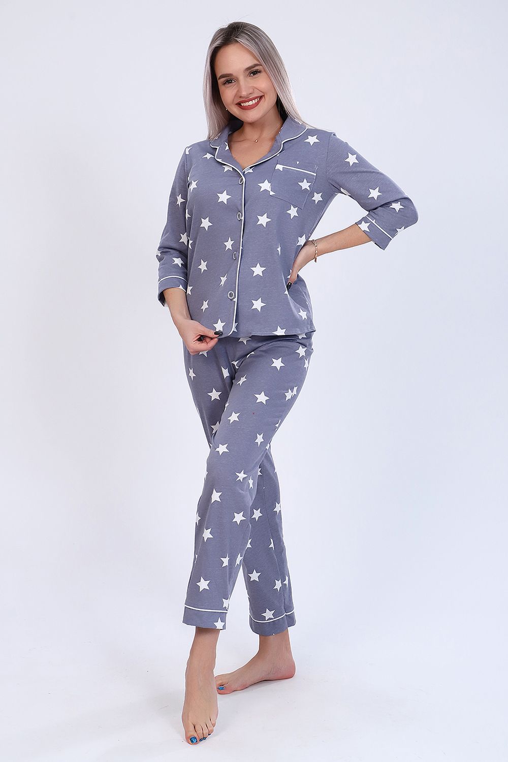 Уютная стильная пижама женская состоит из брюк и рубашки. Рубашка с 3/4 рукав, полуприлегающего силуэта, на пуговицах, с воротником в английском стиле обработан атласным кантом. Классическая расцветка, натуральная ткань, полуприлегающий силуэт. Комплект женский может использоваться и как домашняя пижама. Он также станет отличным приобретением для беременных и кормящих женщин, в подарок, маме, сестре, бабушке, подруге, женщинам больших размеров.
