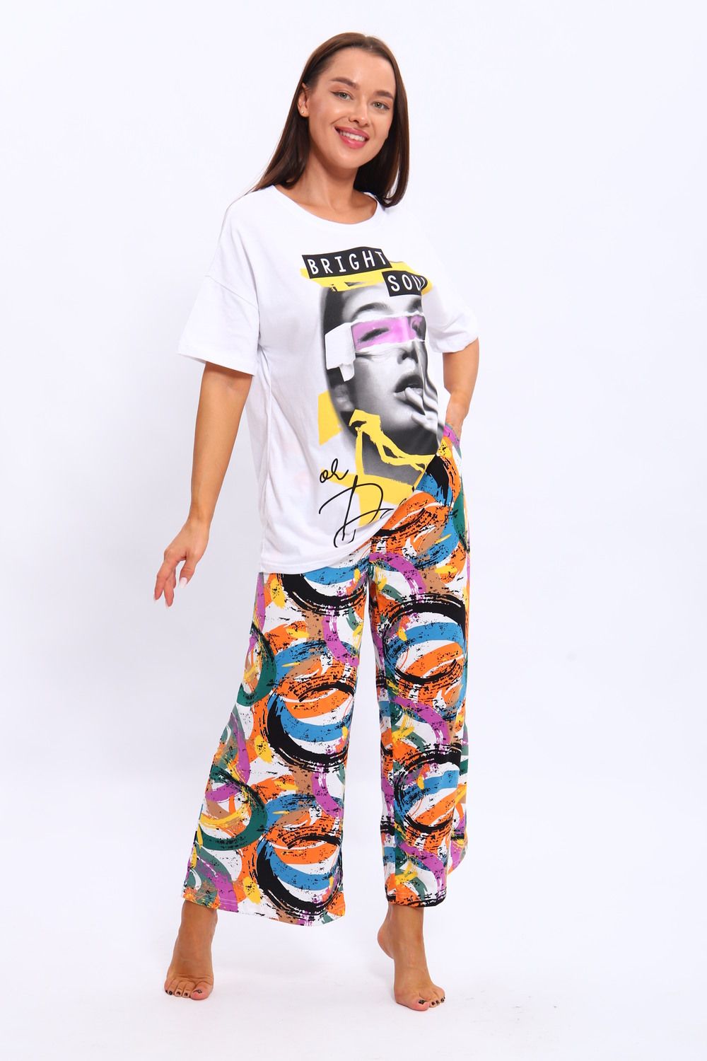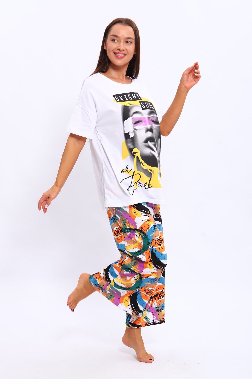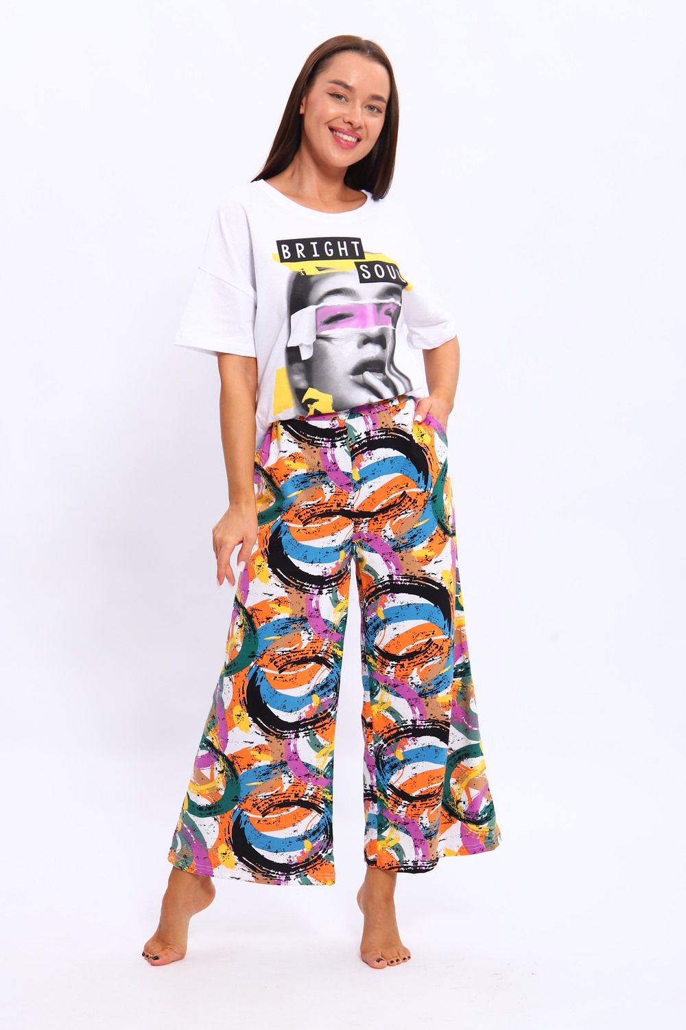 Костюм из кулирки . Футболка и брюки выполнены из мягкого и дышащего 100% хлопка. Большие размеры, футболка со спущенным рукавом с принтом а брюки набивание широкие с карманами.