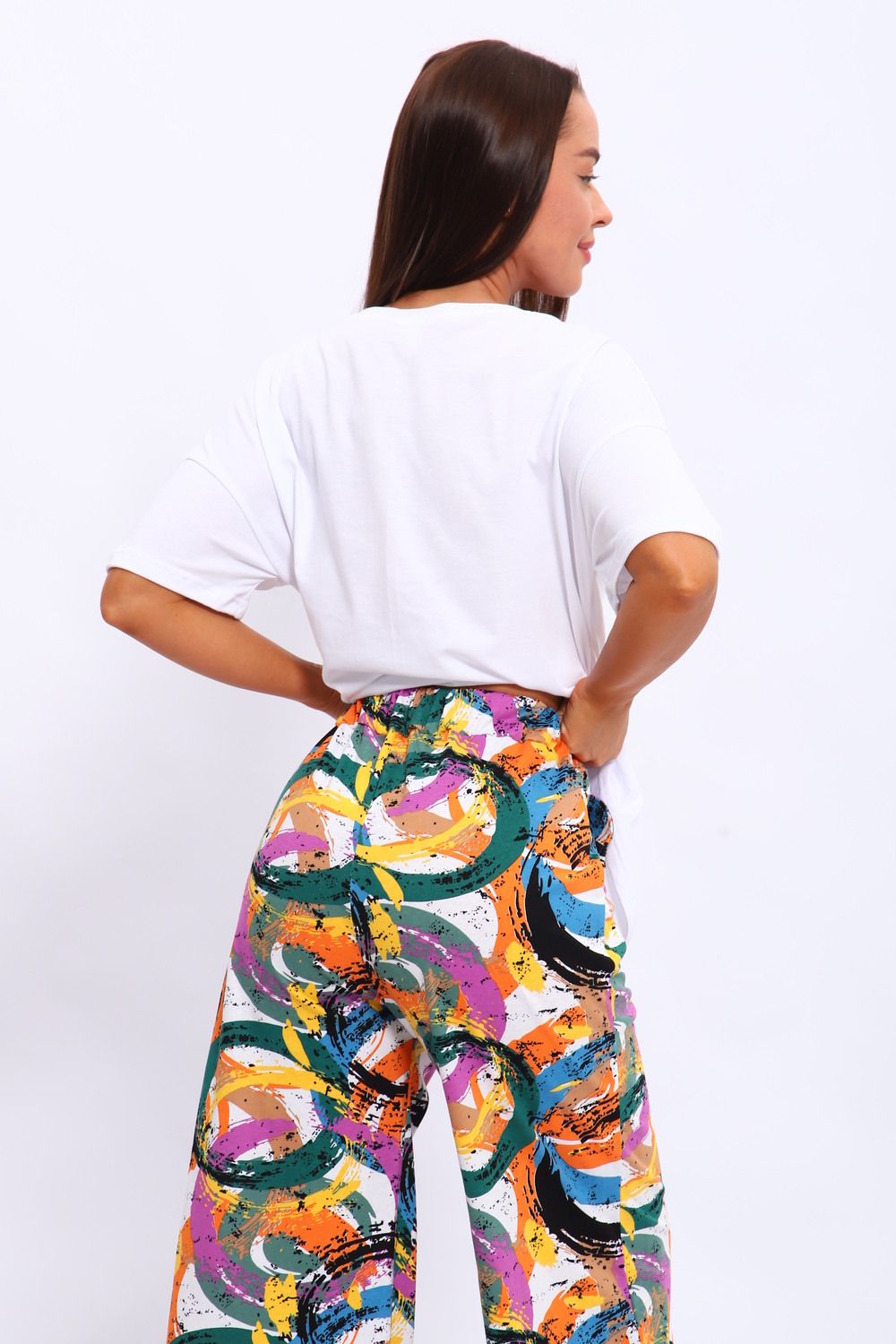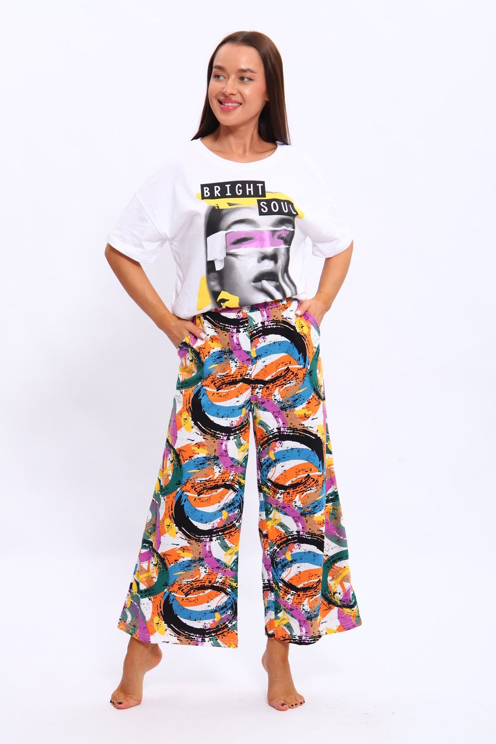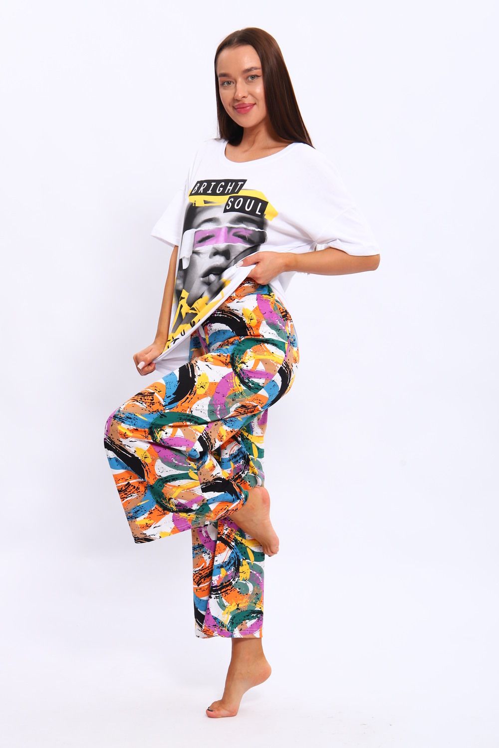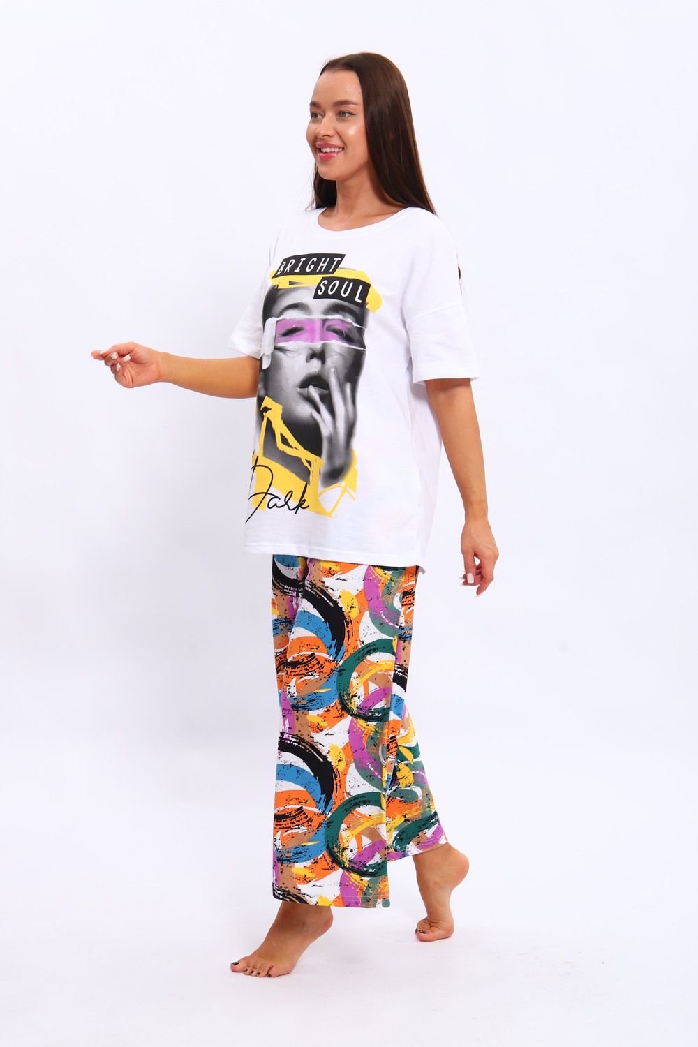 Костюм из кулирки . Футболка и брюки выполнены из мягкого и дышащего 100% хлопка. Большие размеры, футболка со спущенным рукавом с принтом а брюки набивание широкие с карманами.