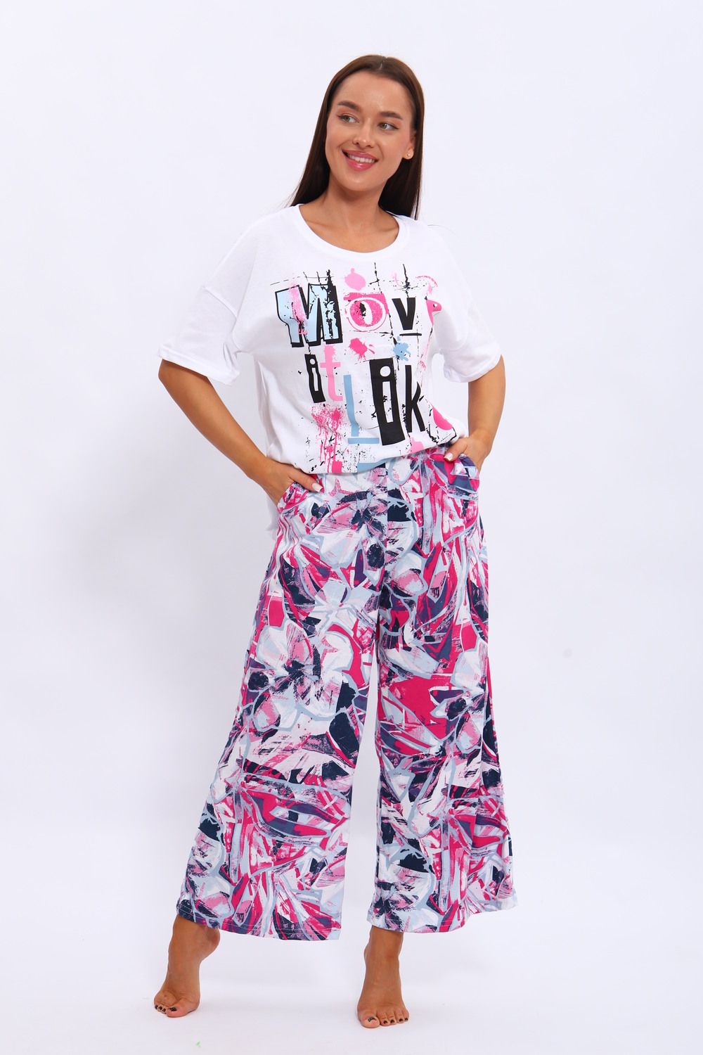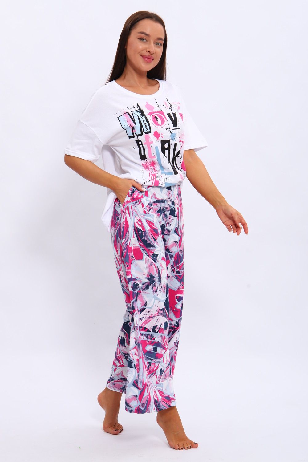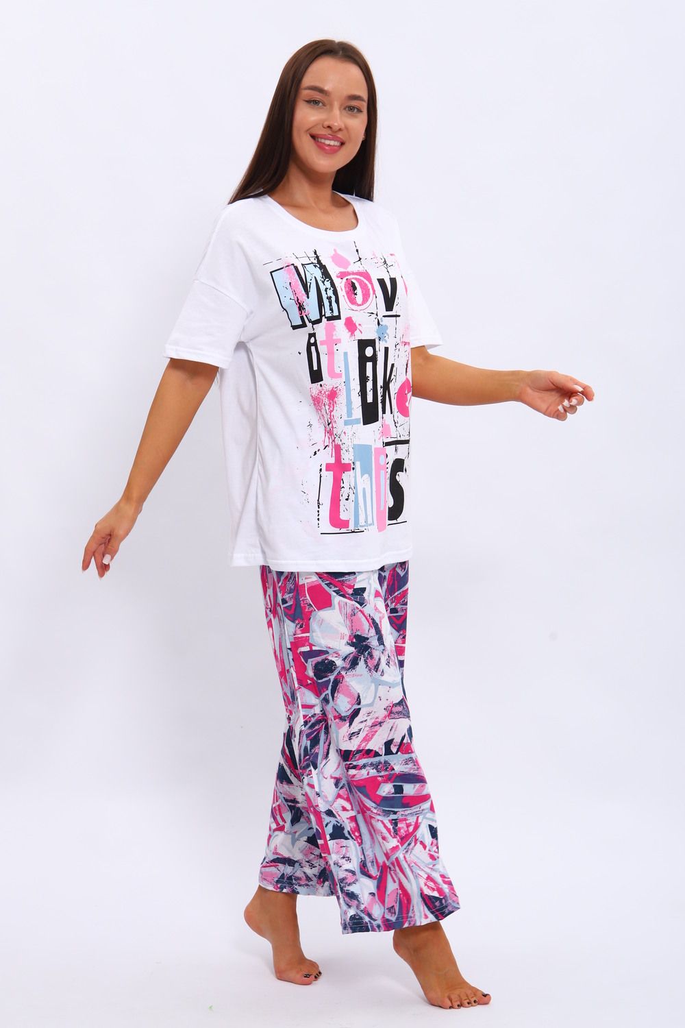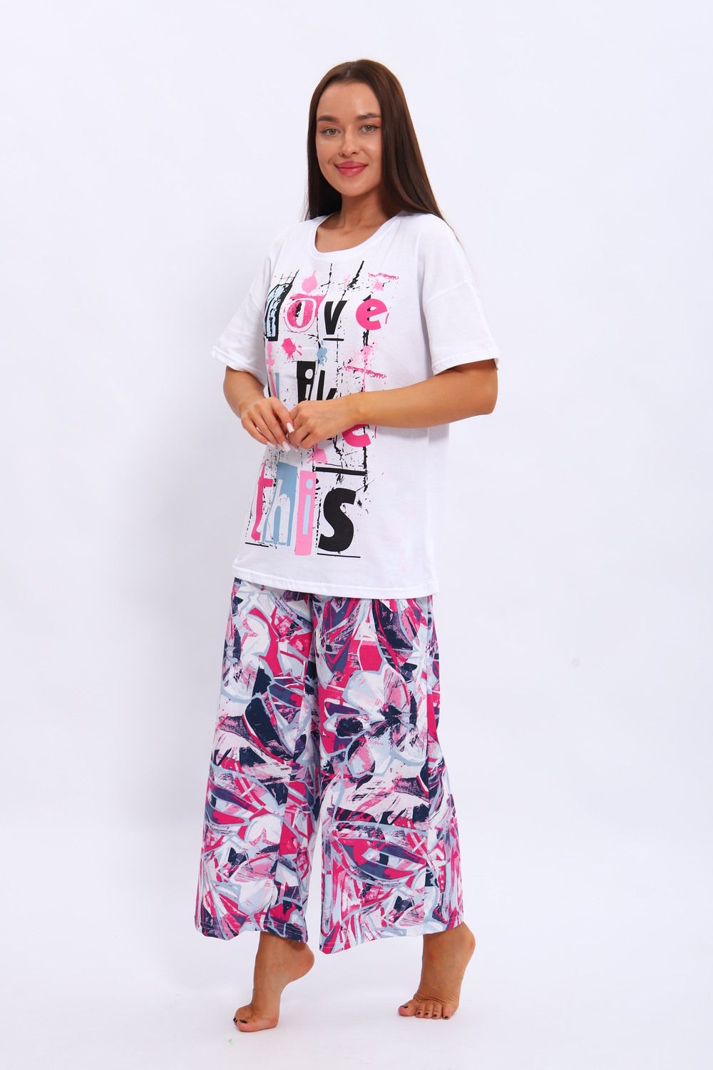 Костюм из кулирки . Футболка и брюки выполнены из мягкого и дышащего 100% хлопка. Большие размеры, футболка со спущенным рукавом с принтом, а брюки набивание широкие с карманами.