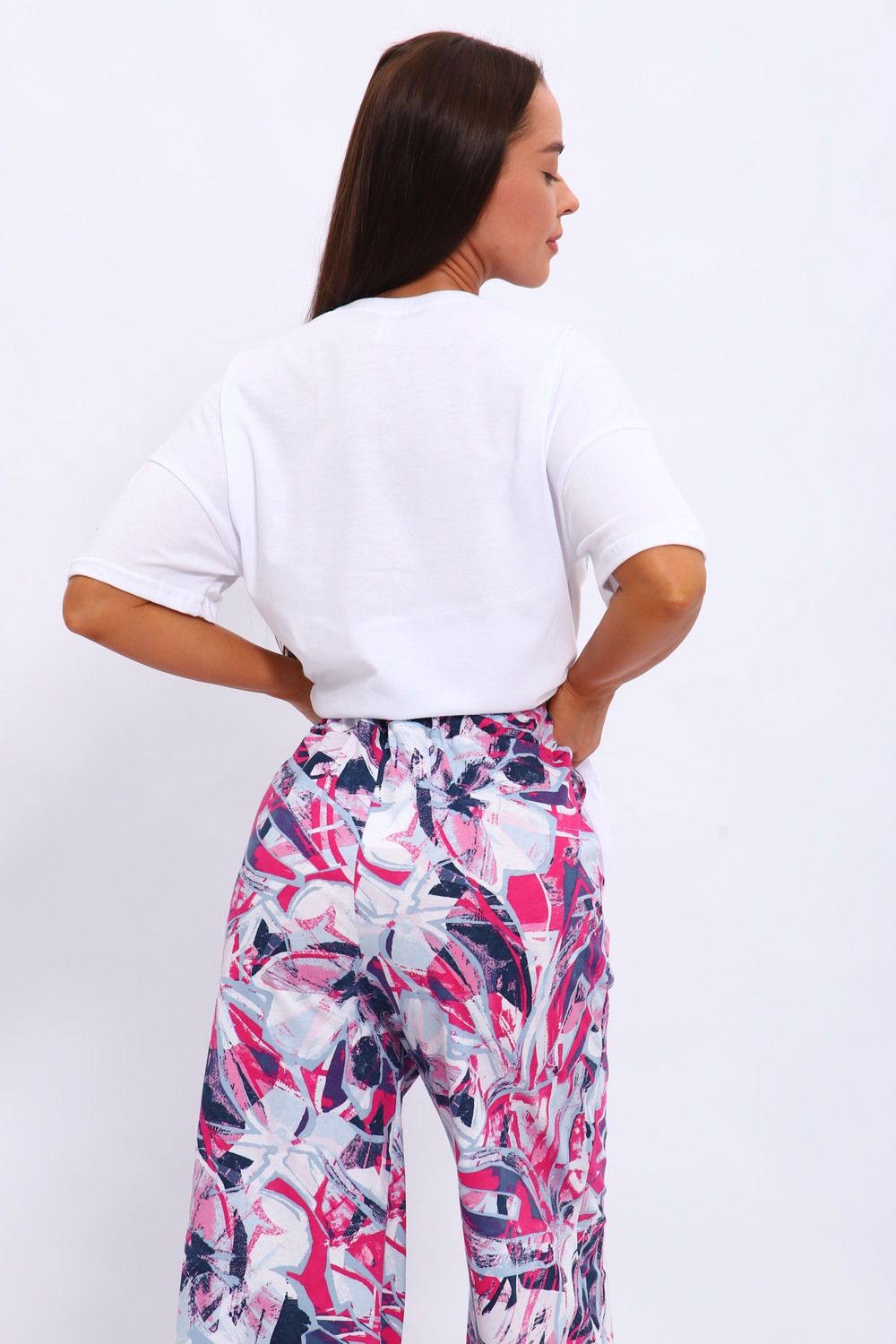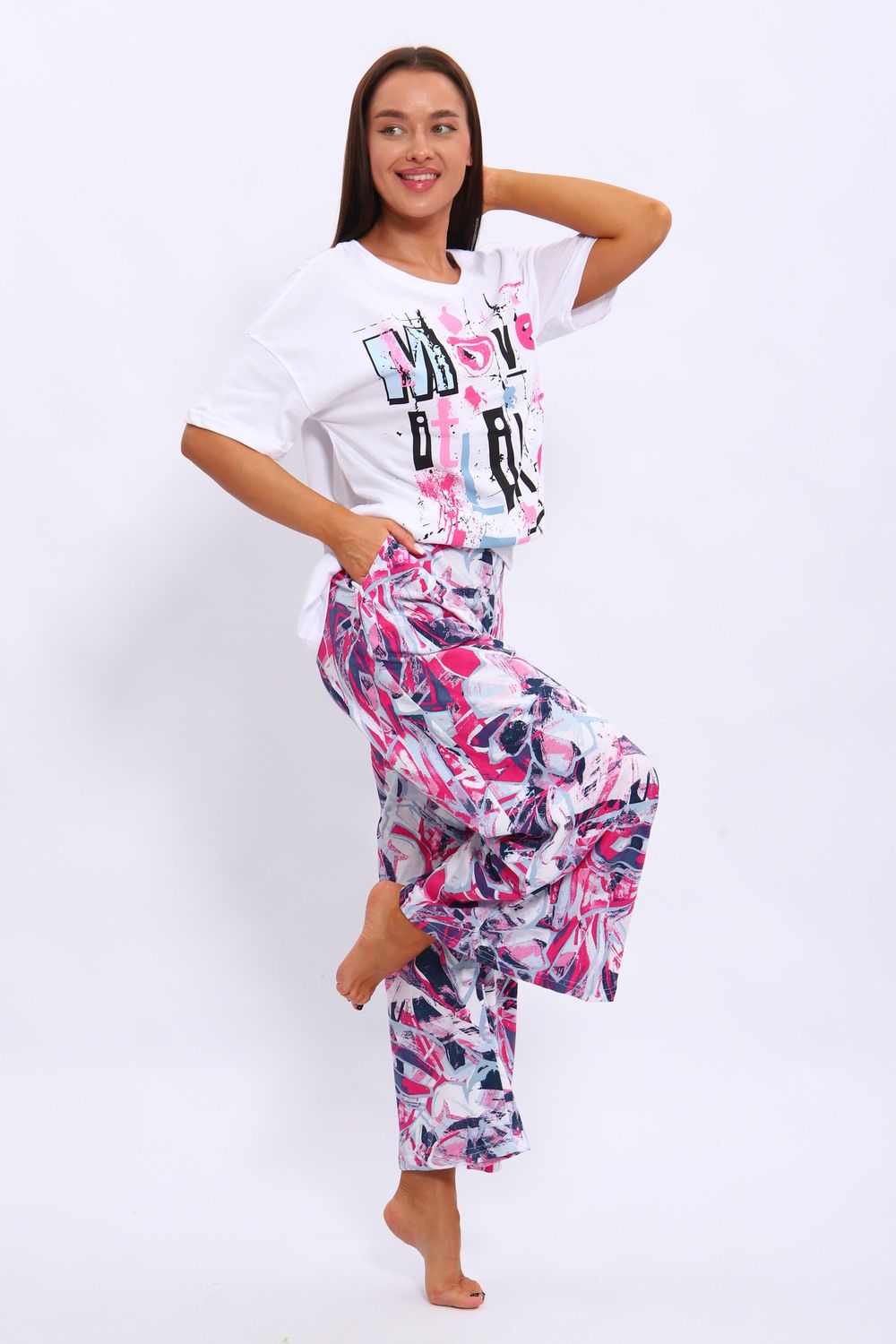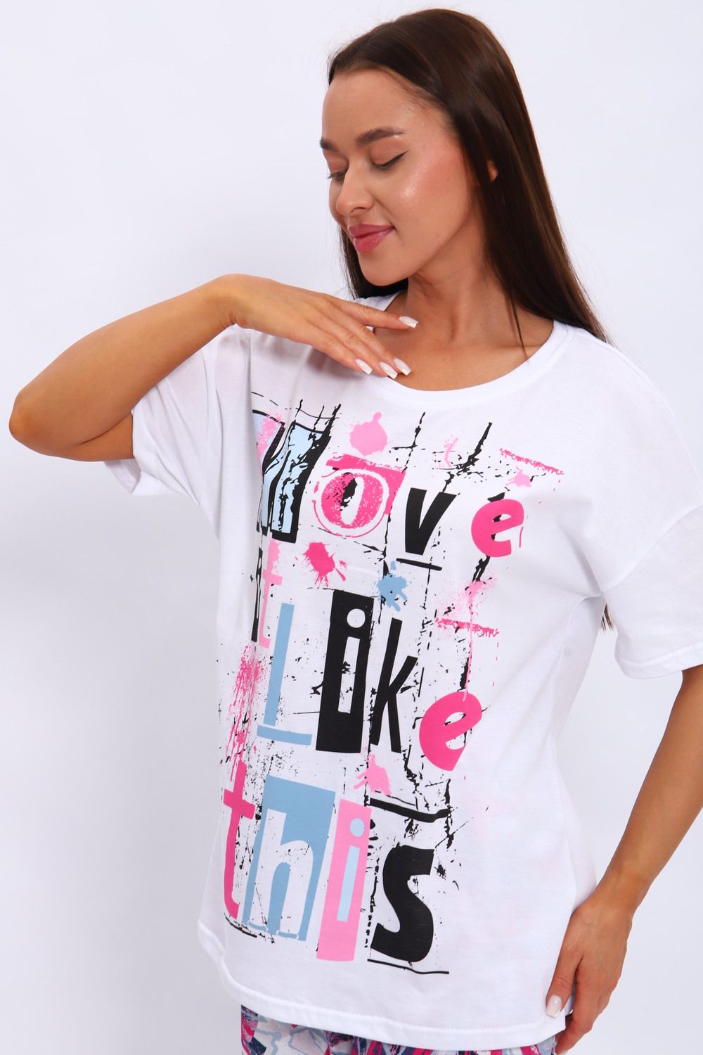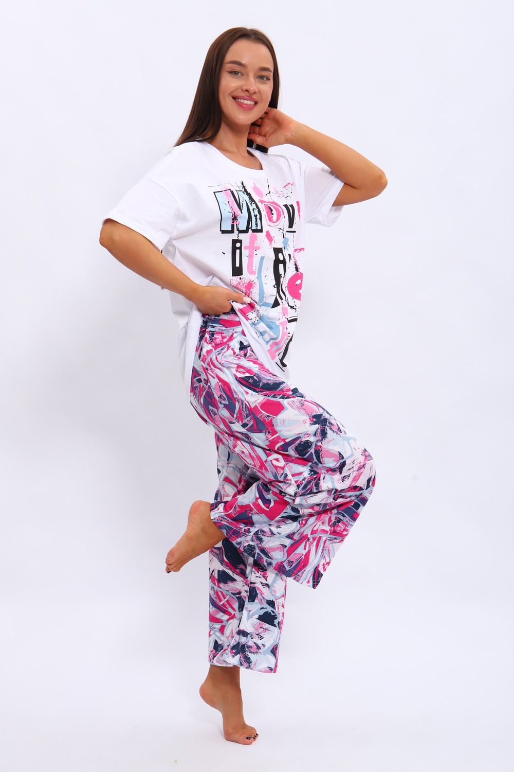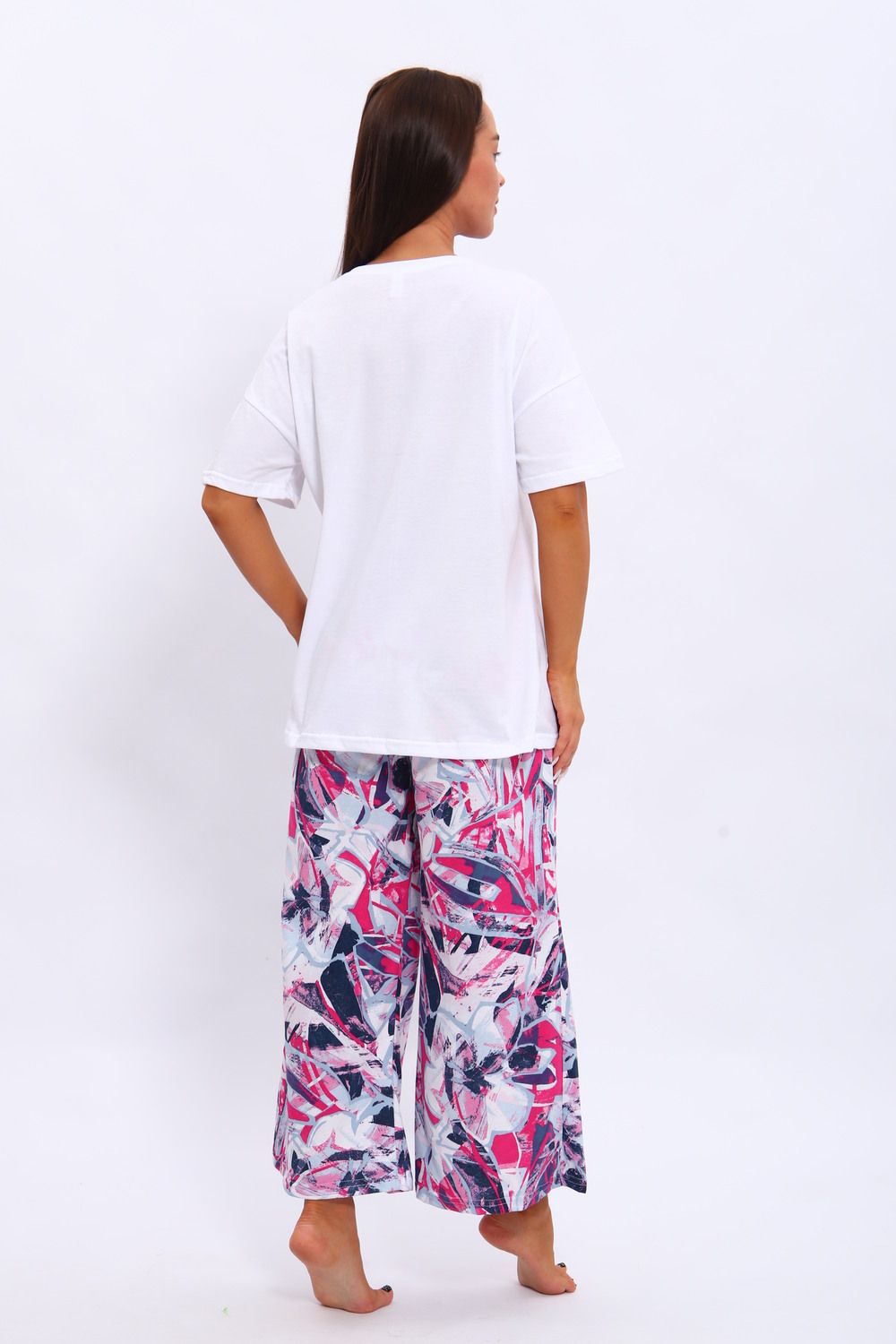 Костюм из кулирки . Футболка и брюки выполнены из мягкого и дышащего 100% хлопка. Большие размеры, футболка со спущенным рукавом с принтом, а брюки набивание широкие с карманами.