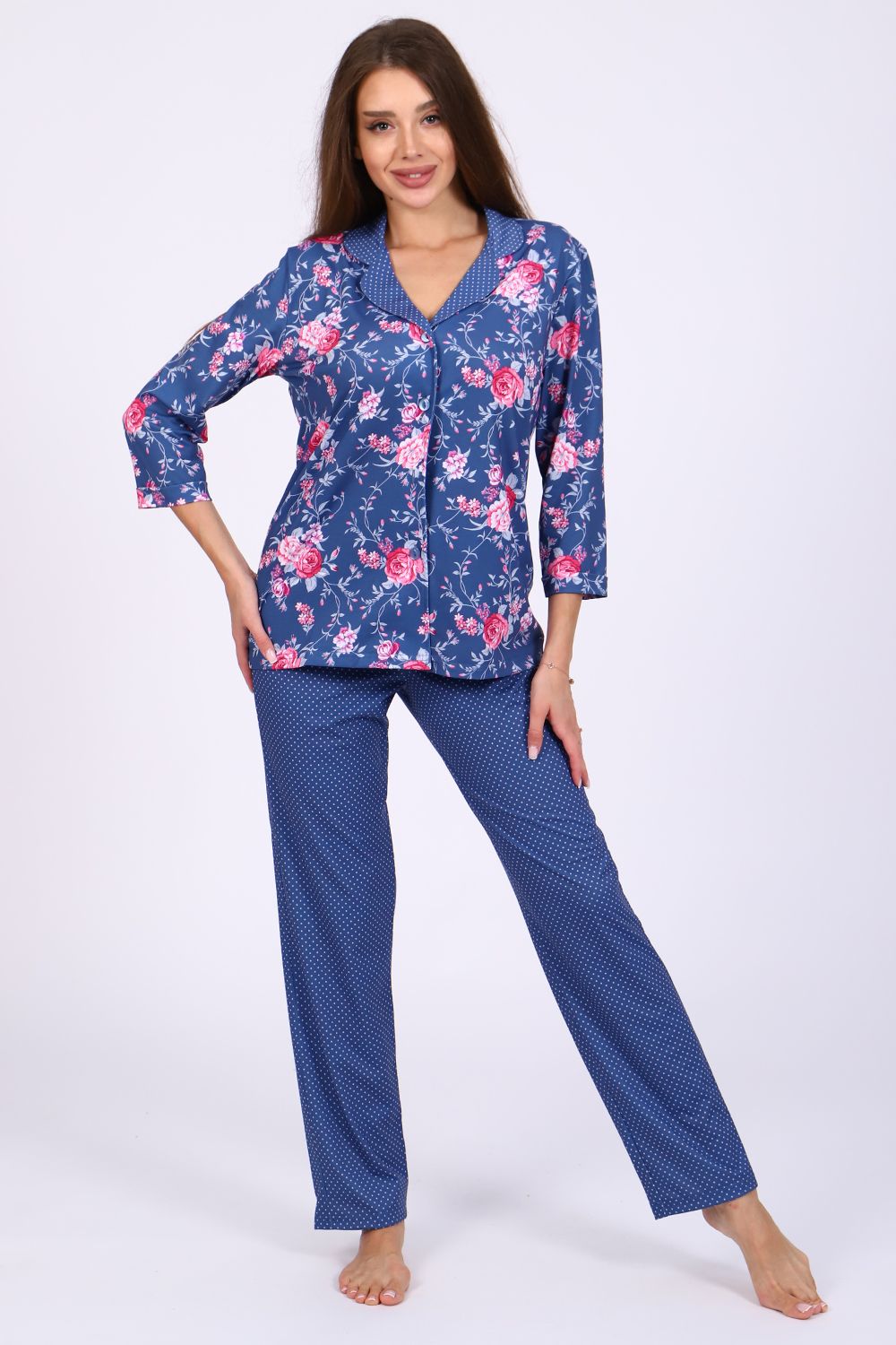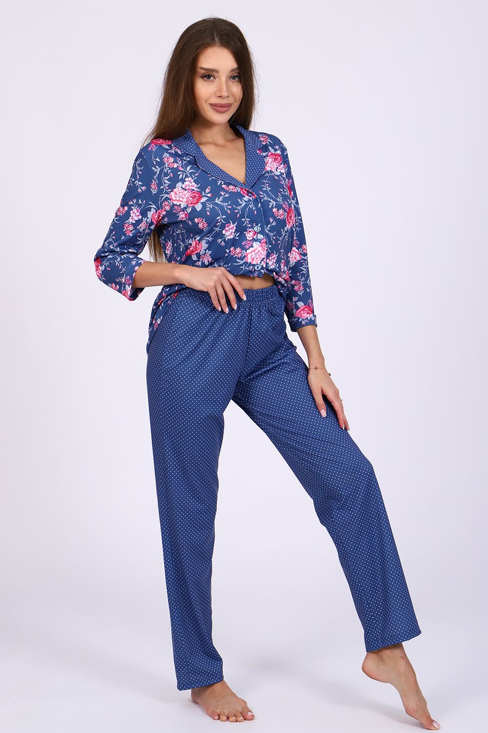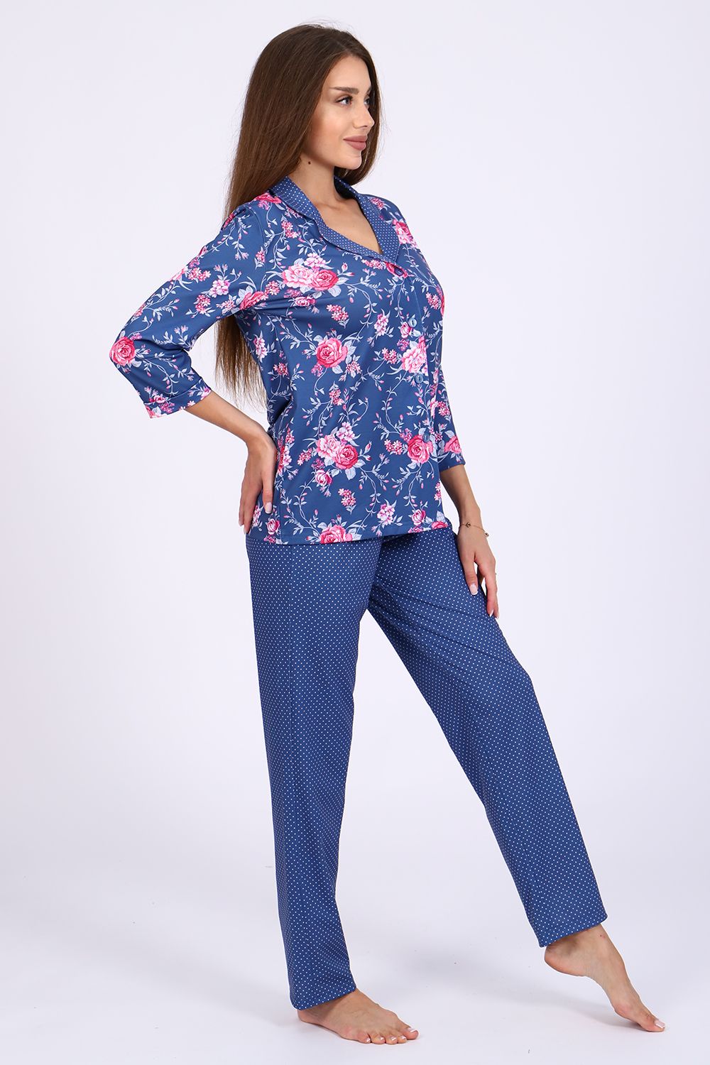 Женский костюм-пижама, состоящий из рубашки и брюк. Комплект сшит из трикотажного полотна нового поколения с цифровой печатью, которая не меняет цвет рисунка в процессе стирки. Содержание полиэстера в ткани позволяет изделию не менять свою форму в процессе носки и практически не мнется. Усадка костюма минимальна. Жакет-рубашка на пуговицах, воротник в английском стиле из ткани компаньона. Рукав 3/4, низ с имитацией манжета. Брюки на широкой резинке, низ брюк выполнен с имитацией манжета. Широкий размерный ряд с 44 по 56, большой ассортимент ярких расцветок на любой вкус. Можно носить, как домашний костюм и как пижаму. Рубашка свободного кроя для удобства домашнего ношения. Любителям носить в обтяжку рекомендуется брать на размер меньше (см. параметры в сантиметрах). Рекомендована стирка при 30-40 градусах в стиральной машине. Отличный подарок любимым женщинам.