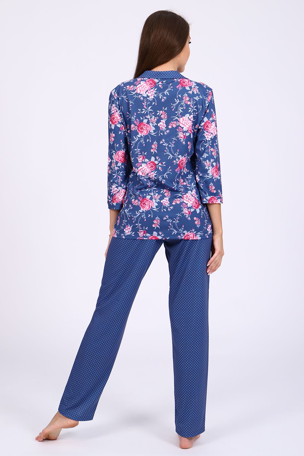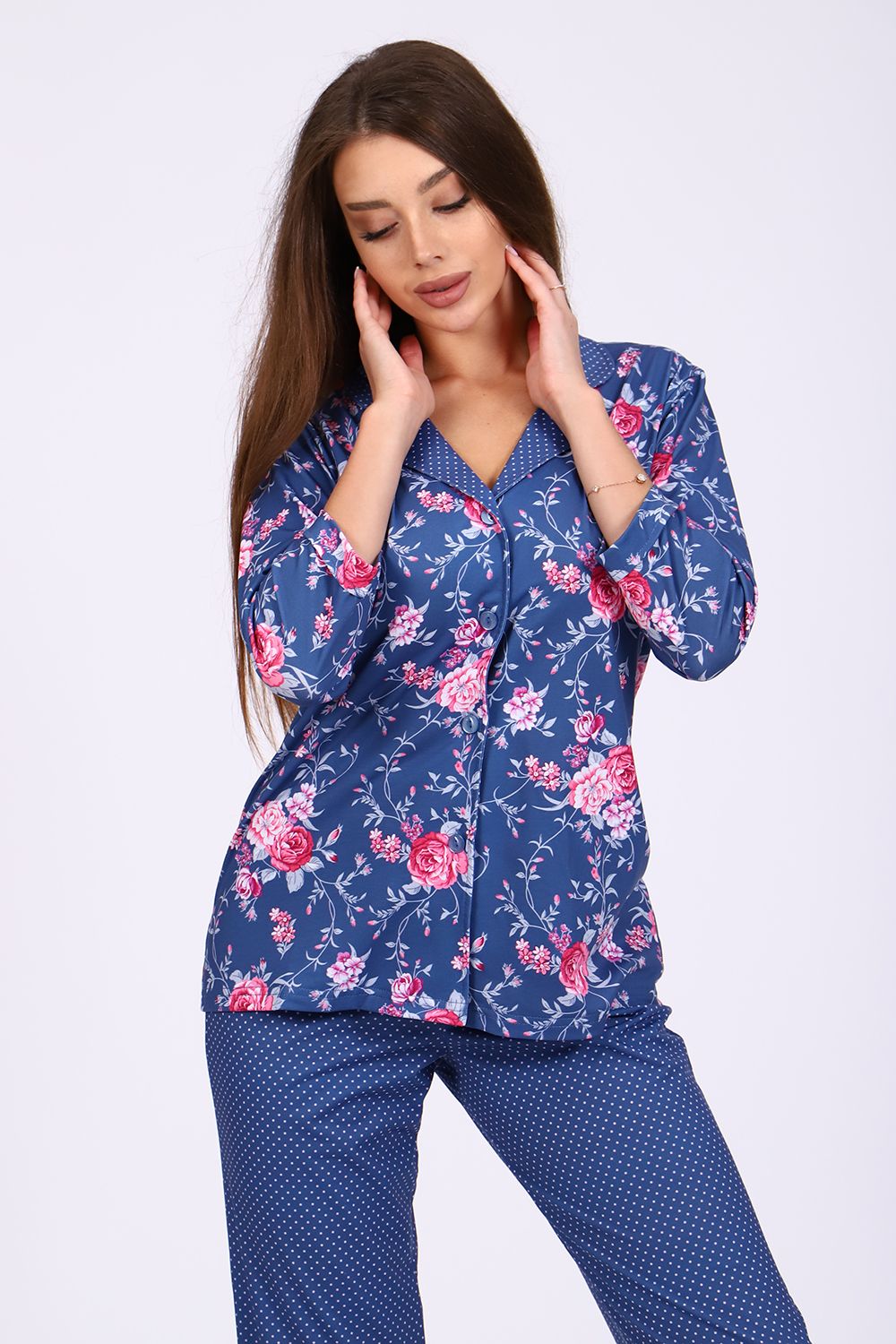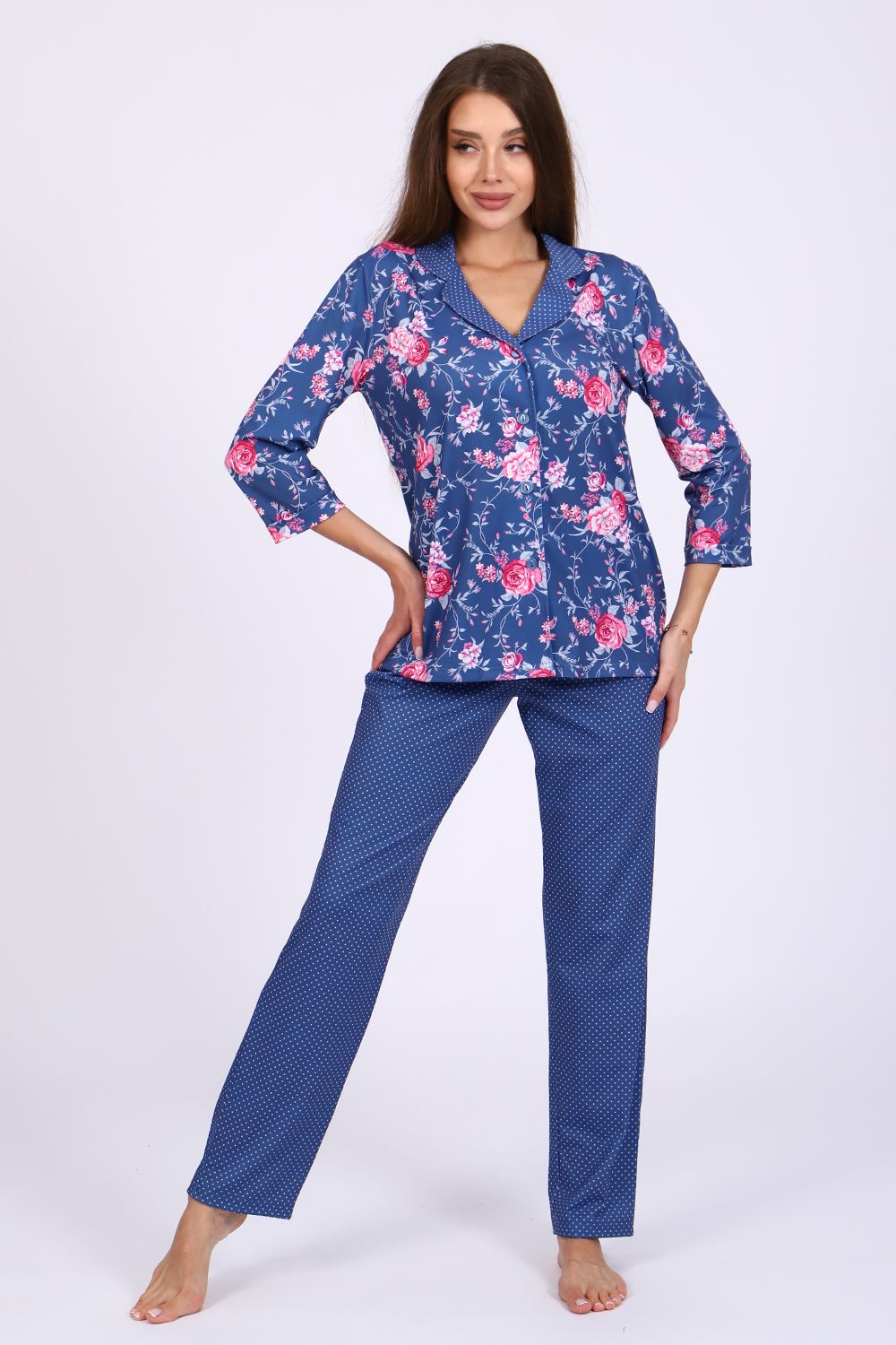 Женский костюм-пижама, состоящий из рубашки и брюк. Комплект сшит из трикотажного полотна нового поколения с цифровой печатью, которая не меняет цвет рисунка в процессе стирки. Содержание полиэстера в ткани позволяет изделию не менять свою форму в процессе носки и практически не мнется. Усадка костюма минимальна. Жакет-рубашка на пуговицах, воротник в английском стиле из ткани компаньона. Рукав 3/4, низ с имитацией манжета. Брюки на широкой резинке, низ брюк выполнен с имитацией манжета. Широкий размерный ряд с 44 по 56, большой ассортимент ярких расцветок на любой вкус. Можно носить, как домашний костюм и как пижаму. Рубашка свободного кроя для удобства домашнего ношения. Любителям носить в обтяжку рекомендуется брать на размер меньше (см. параметры в сантиметрах). Рекомендована стирка при 30-40 градусах в стиральной машине. Отличный подарок любимым женщинам.