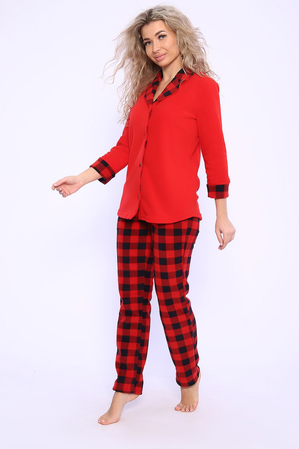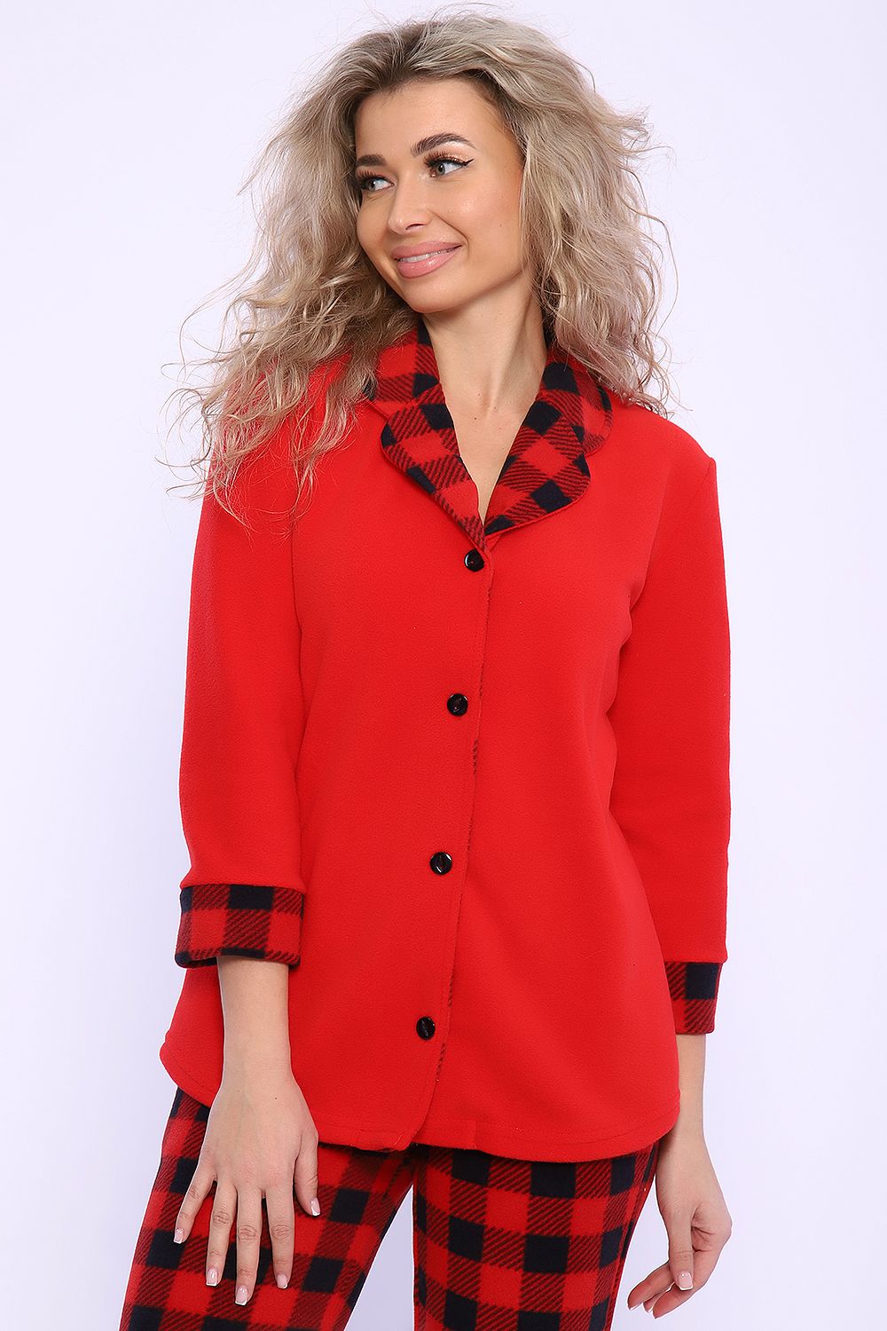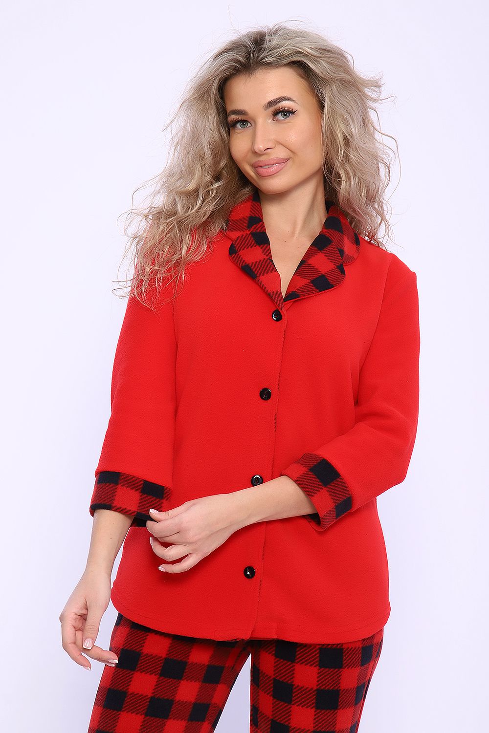 Домашний женский костюм из мягкой, нежной на ощупь и очень теплой флисовой ткани. Состоит из жакета на пуговицах с воротником пиджачного типа и приталенных брюк на широкой резинке, с боковыми карманами со скошенным входом. Рукав жакета втачной с манжетами в тон брюк и длиной 3/4, что делает костюм удобным при занятии домашними делами. Универсальный, удобный костюм-пижама подойдет для сна, для отдыха, занятий зимними видами спорта и просто прогулок на свежем воздухе. Удобный домашний комплект для женщин и девушек устойчив в процессе эксплуатации. Не садится, практически не мнется и не растягивается. Одежда для дома из флиса - нежная и воздушная, удобная и комфортная в использовании. Прекрасно подойдет для беременных и кормящих мам. Модель сшита размер в размер, поэтому любителям свободной одежды рекомендуем заказывать на размер больше. Другие расцветки данной модели Вы можете найти в артикулах: 71084, 71051, 71049. Хороший подарок милым дамам на день рождения, 8 Марта, Новый год и по любому поводу!