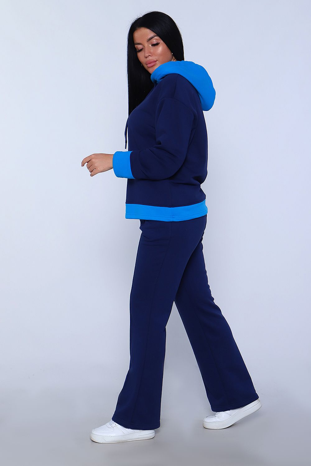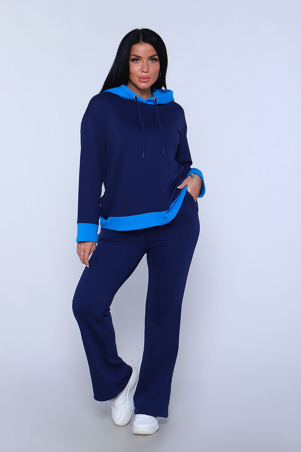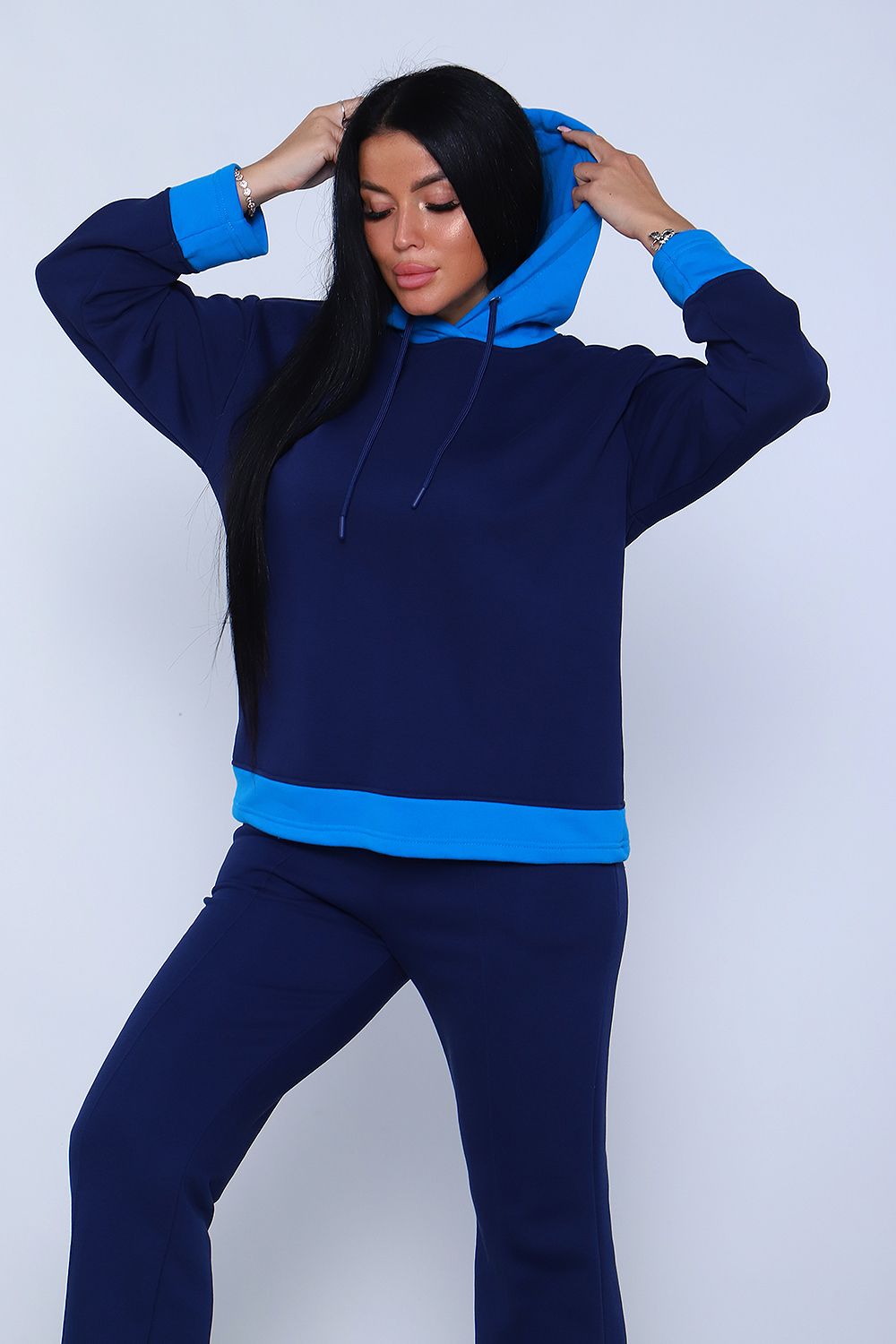 Элегантный женский костюм полуприлегающего силуэта, состоящий из худи и брюк сшит из трикотажного полотна премиум качества - футер 3-х нитка петля без начеса. Высокое качество ткани обеспечит комфорт и удобство на долгое время. Хлопковая изнаночная сторона изделия дарит комфортные ощущения при ношении костюма. Брюки силуэта клеш с широким поясом с декоративной отсрочкой и с отстроченной стрелкой на передней половине брюк, что "вытягивает" силуэт и визуально делает ноги длиннее, что добавляет женственности образу. В боковых швах брюк расположены карманы с отрезным бочком. Худи прямое, свободное с длинными рукавами. Низ рукава и низ худи отделаны декоративными манжетами контрастного цвета. Вырез горловины округлый, с двойным капюшоном контрастного цвета в тон манжет. Объём капюшона регулируется декоративным шнурком. Сочетание комфорта и стиля делает этот костюм модным и удобным для каждой девушки и женщины. Идеальный комплект обеспечивает удобную посадку на любую фигуру, позволяет свободно двигаться, гулять, отдыхать и заниматься спортом, благодаря тому, что костюм не сковывает движения. Базовые расцветки, прекрасно сочетающиеся цвета основной ткани и ткани - компаньона позволят подобрать тот костюм, который идеально соответствует вашему вкусу и предпочтениям. Стильный костюм подойдёт для любого времени года, на любую погоду. Удобный костюм подойдет как для домашнего, так и уличного ношения. Для беременных и молодых мам! Идеальный подарок прекрасным женщинам!