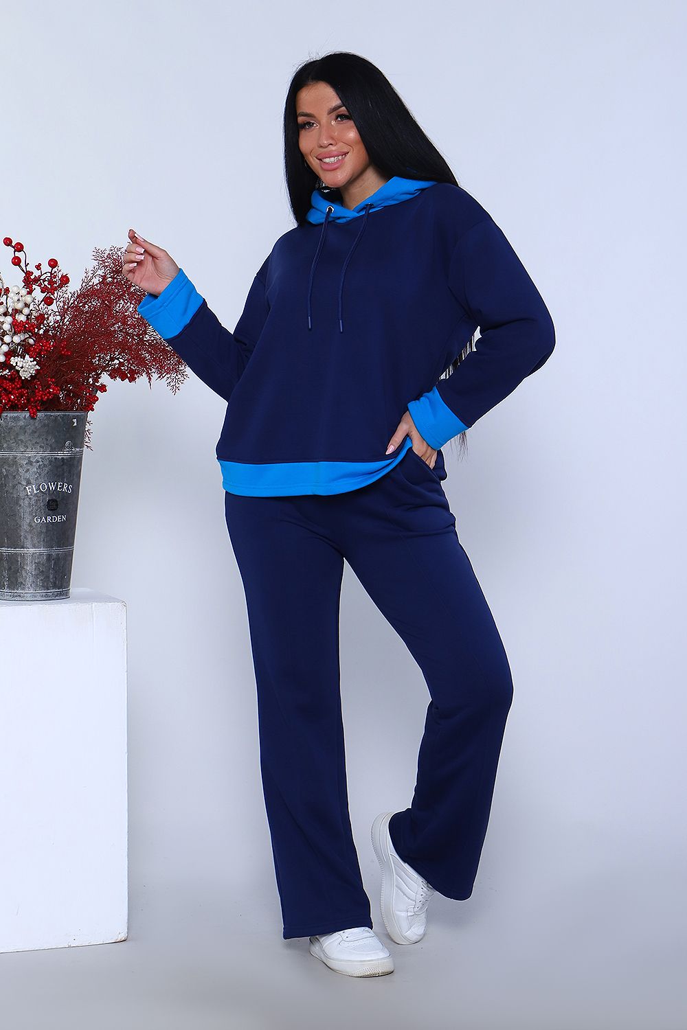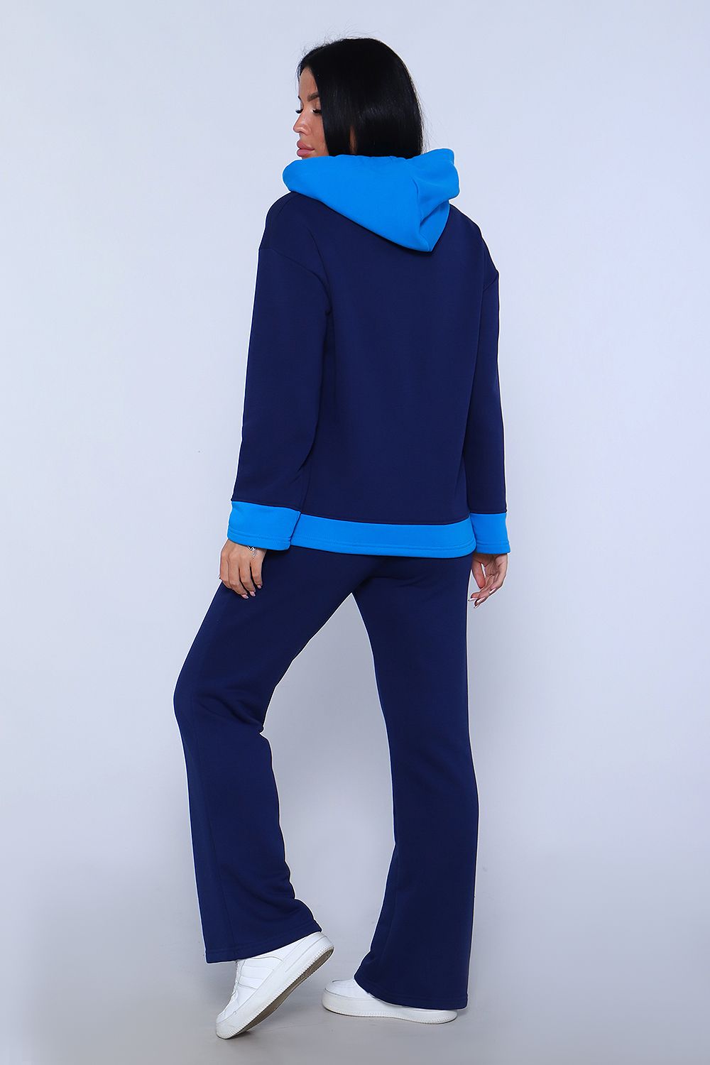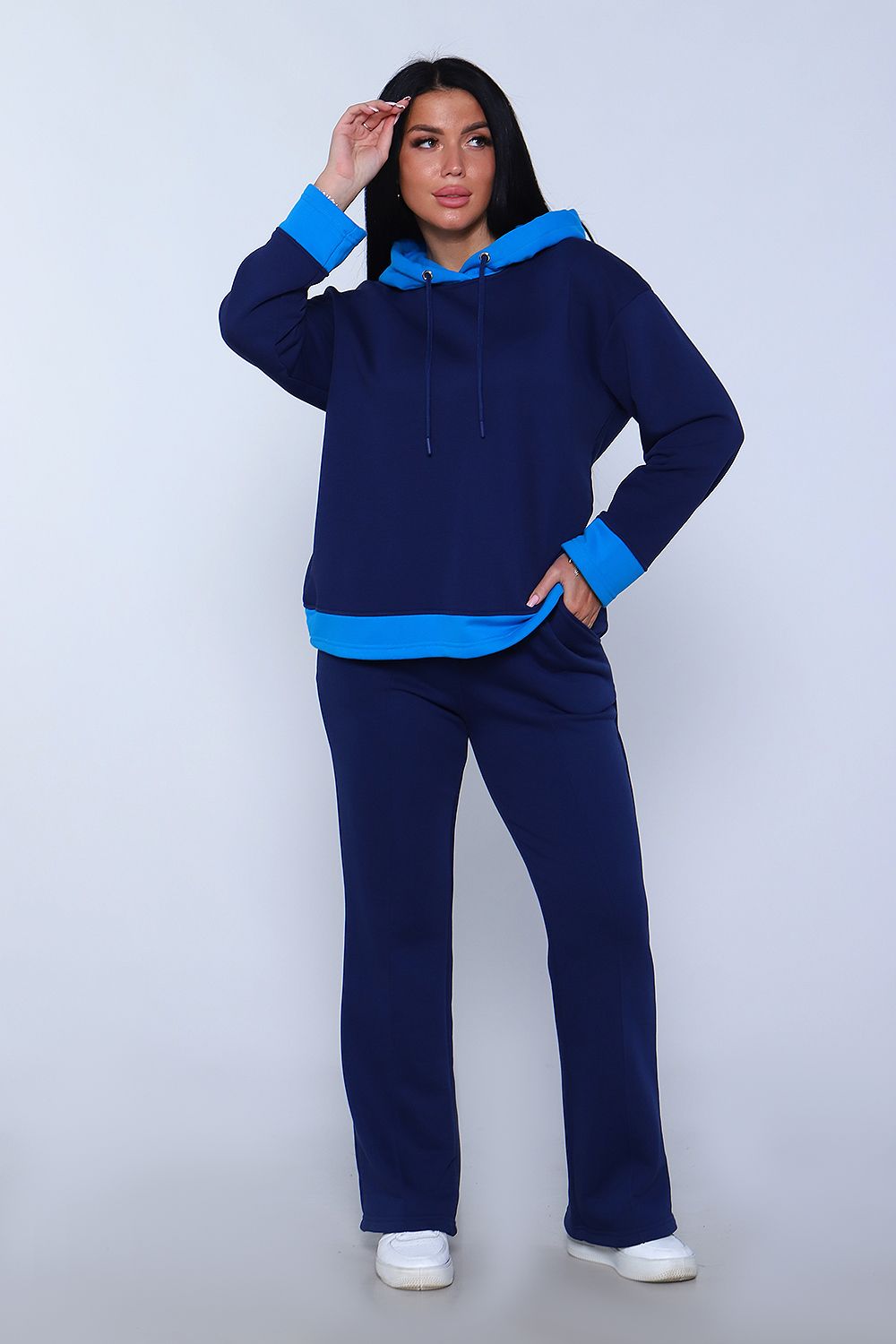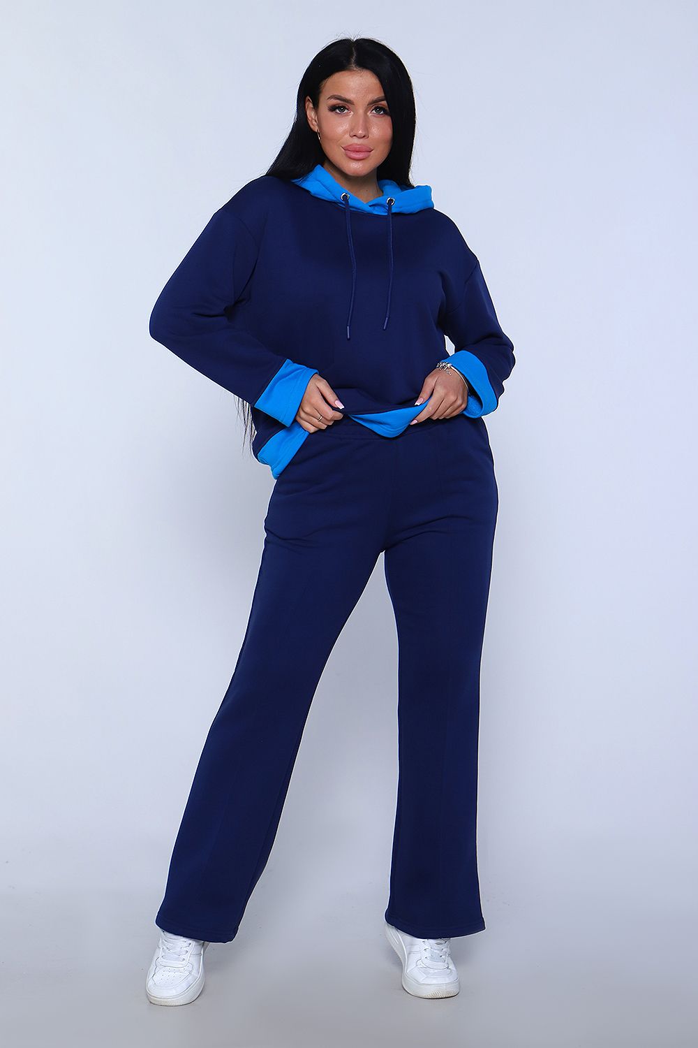Элегантный женский костюм полуприлегающего силуэта, состоящий из худи и брюк сшит из трикотажного полотна премиум качества - футер 3-х нитка петля без начеса. Высокое качество ткани обеспечит комфорт и удобство на долгое время. Хлопковая изнаночная сторона изделия дарит комфортные ощущения при ношении костюма. Брюки силуэта клеш с широким поясом с декоративной отсрочкой и с отстроченной стрелкой на передней половине брюк, что "вытягивает" силуэт и визуально делает ноги длиннее, что добавляет женственности образу. В боковых швах брюк расположены карманы с отрезным бочком. Худи прямое, свободное с длинными рукавами. Низ рукава и низ худи отделаны декоративными манжетами контрастного цвета. Вырез горловины округлый, с двойным капюшоном контрастного цвета в тон манжет. Объём капюшона регулируется декоративным шнурком. Сочетание комфорта и стиля делает этот костюм модным и удобным для каждой девушки и женщины. Идеальный комплект обеспечивает удобную посадку на любую фигуру, позволяет свободно двигаться, гулять, отдыхать и заниматься спортом, благодаря тому, что костюм не сковывает движения. Базовые расцветки, прекрасно сочетающиеся цвета основной ткани и ткани - компаньона позволят подобрать тот костюм, который идеально соответствует вашему вкусу и предпочтениям. Стильный костюм подойдёт для любого времени года, на любую погоду. Удобный костюм подойдет как для домашнего, так и уличного ношения. Для беременных и молодых мам! Идеальный подарок прекрасным женщинам!