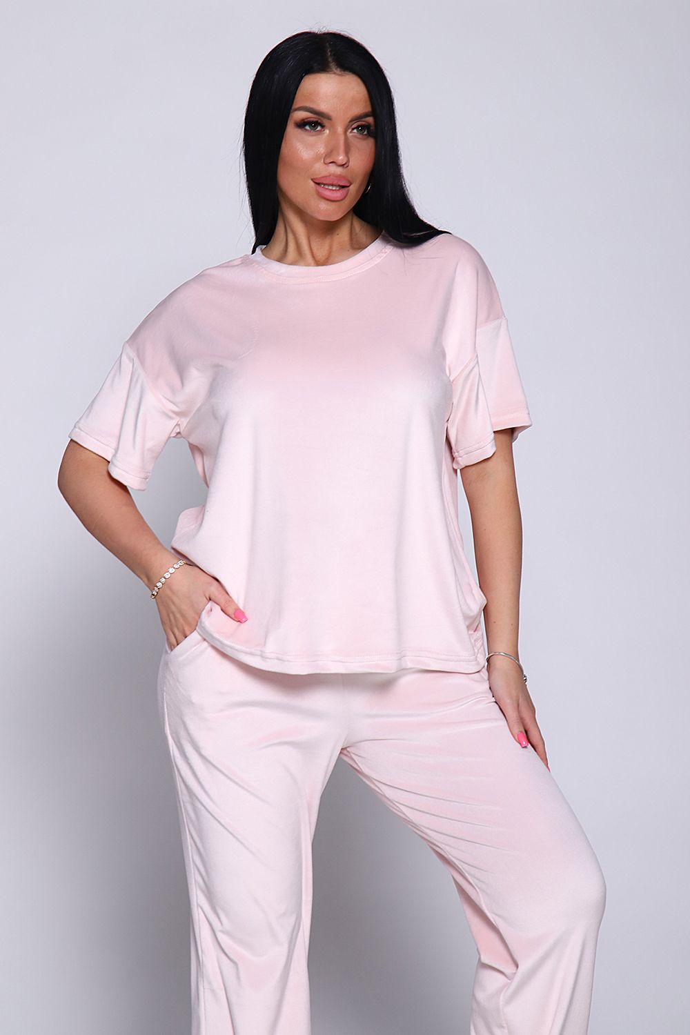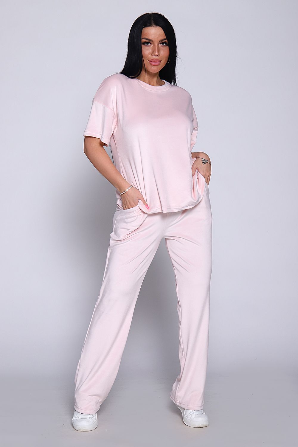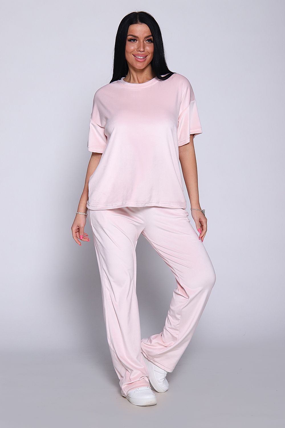Костюм женский велюровый, повседневный, всесезонный. Костюм состоит из футболки и брюк. Футболка оверсайз прямого силуэта, длиной до бедра. Рукав втачной со спущенным плечом, длиной чуть выше локтя. Горловина с обтачкой, низ футболки с подгибкой. Брюки прямого силуэта, умеренного объема. На передних половинках брюк карманы с отрезным бочком. Пояс притачной с эластичной тесьмой. Низ брюк подгибка. Замеры объема талии брюк по нерастянутой резинке.