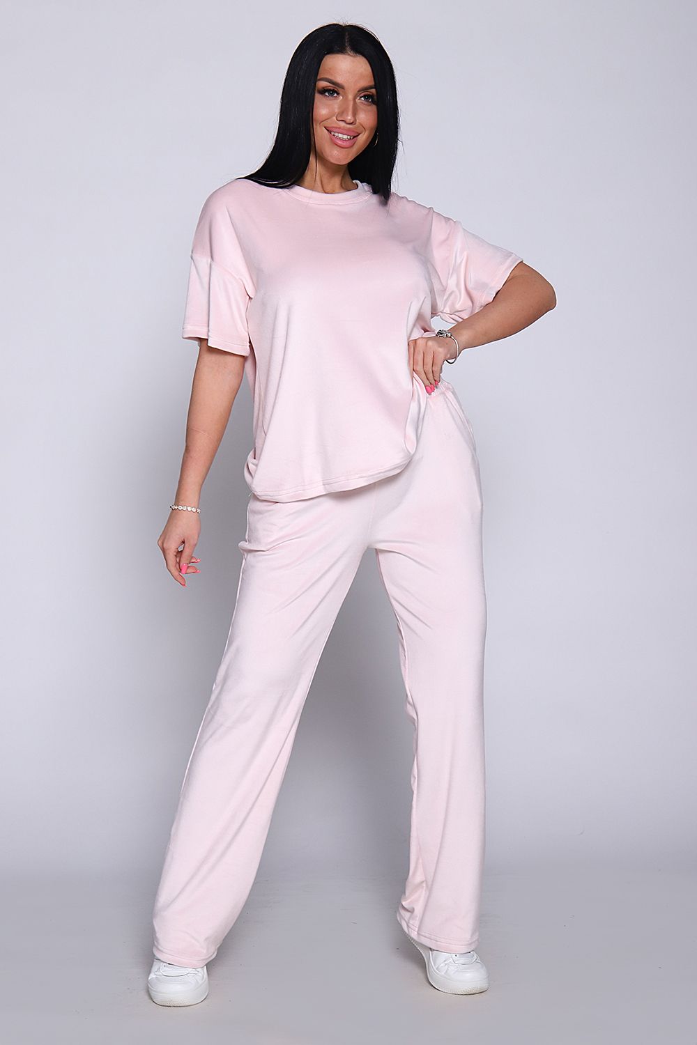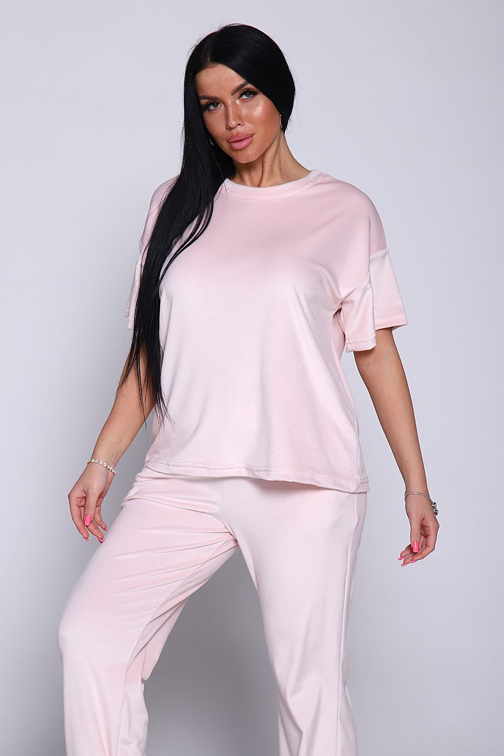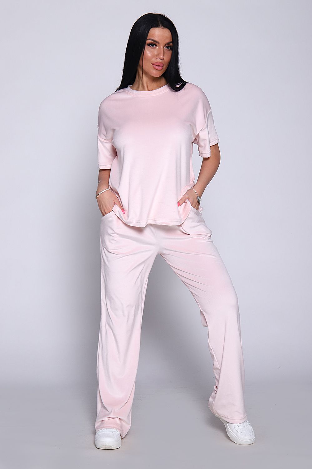 Костюм женский велюровый, повседневный, всесезонный. Костюм состоит из футболки и брюк. Футболка оверсайз прямого силуэта, длиной до бедра. Рукав втачной со спущенным плечом, длиной чуть выше локтя. Горловина с обтачкой, низ футболки с подгибкой. Брюки прямого силуэта, умеренного объема. На передних половинках брюк карманы с отрезным бочком. Пояс притачной с эластичной тесьмой. Низ брюк подгибка. Замеры объема талии брюк по нерастянутой резинке.