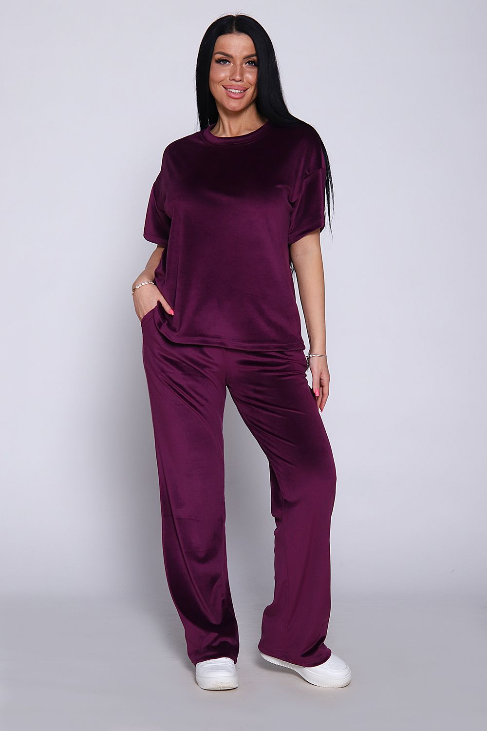 Костюм женский велюровый, повседневный, всесезонный. Костюм состоит из футболки и брюк. Футболка оверсайз прямого силуэта, длиной до бедра. Рукав втачной со спущенным плечом, длиной чуть выше локтя. Горловина с обтачкой, низ футболки с подгибкой. Брюки прямого силуэта, умеренного объема. На передних половинках брюк карманы с отрезным бочком. Пояс притачной с эластичной тесьмой. Низ брюк подгибка. Замеры объема талии брюк по нерастянутой резинке.