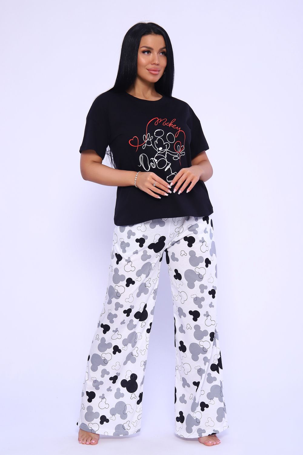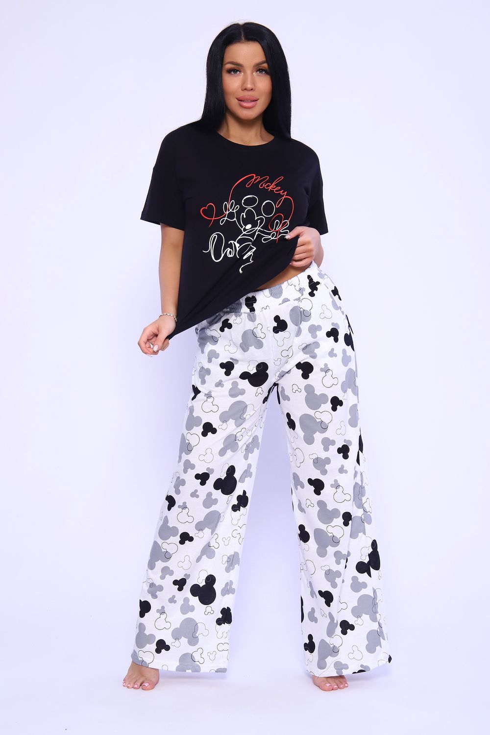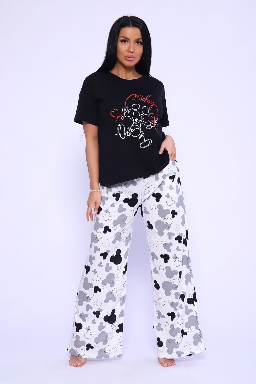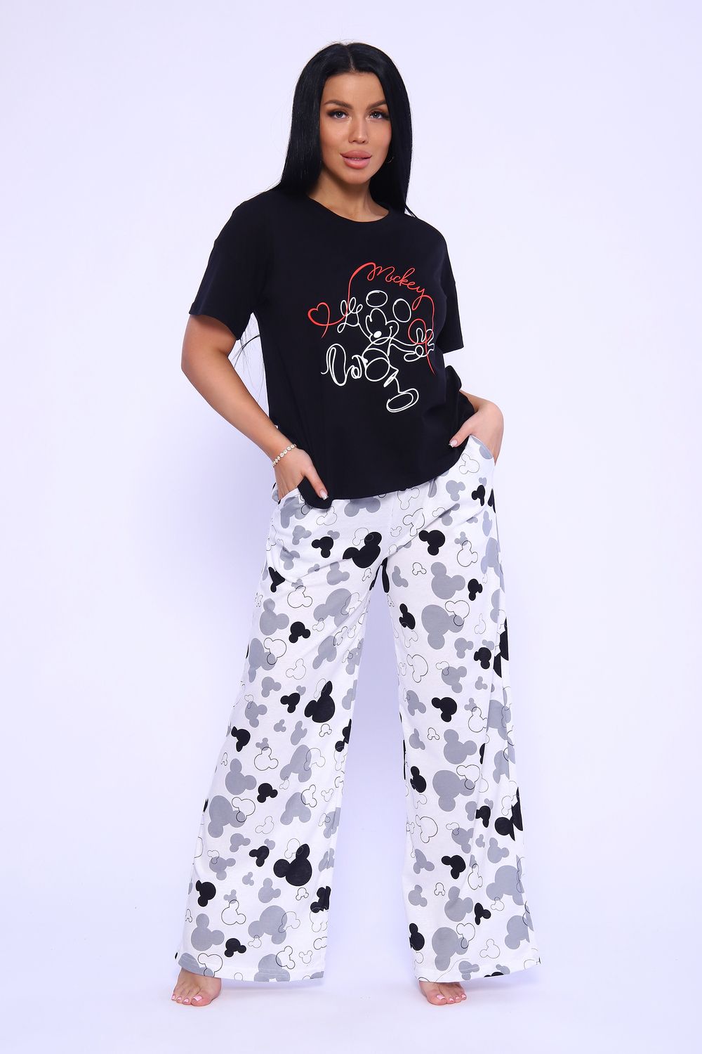 Женский домашний костюм-пижама, состоящий из футболки и брюк Микки из трикотажного полотна 100% хлопка. Приятный дышащий материал идеален для изготовления домашней одежды. Футболка свободного кроя, с круглой горловиной и втачным спущенным коротким рукавом, в которой будет одинаково приятно спать и заниматься домашними делами. Оригинальный, яркий принт обязательно поднимет настроение. Брюки прямого силуэта свободного кроя, с карманами в боковых швах. Мягкий удобный пояс на резинке не перекрутится, т.к отстрочен на поясной машине. Пижамка не изменит свой внешний вид после стирки при соблюдении рекомендаций по уходу и будет долго вас радовать. Отличный подарок для всех девушек и женщин на любой праздник!