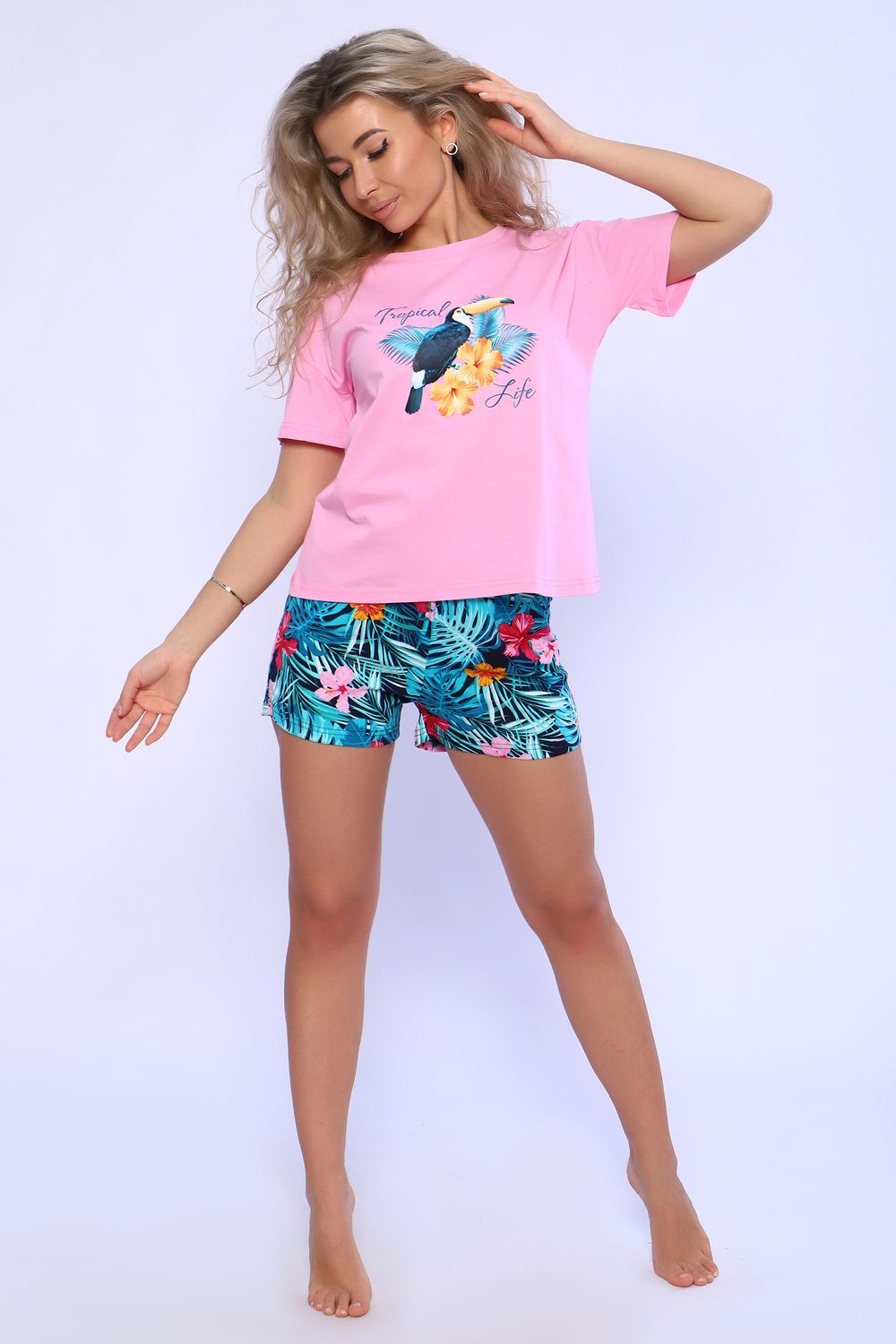 Женский домашний костюм-пижама, состоящий из футболки Тукан и шорт Листья из трикотажного полотна 100%-го хлопка. Приятный дышащий материал идеален для изготовления домашней одежды. Футболка свободного кроя, с круглой горловиной и втачным спущенным коротким рукавом, в которой будет одинаково приятно спать и заниматься домашними делами. Оригинальный принт обязательно поднимет настроение. Шорты прямого силуэта свободного кроя, с карманами в боковых швах. Мягкий удобный пояс на резинке не перекрутится, т.к отстрочен на поясной машине. Пижамка не изменит свой внешний вид после стирки при соблюдении рекомендаций по уходу и будет долго вас радовать. Обязательно возьмите этот костюм в отпуск. Отличный подарок для всех девушек и женщин на любой праздник!