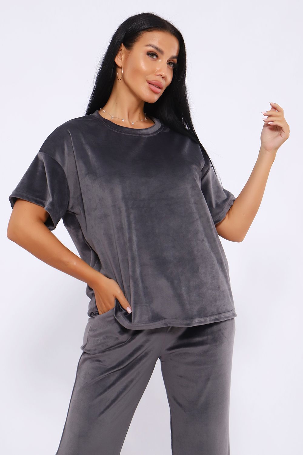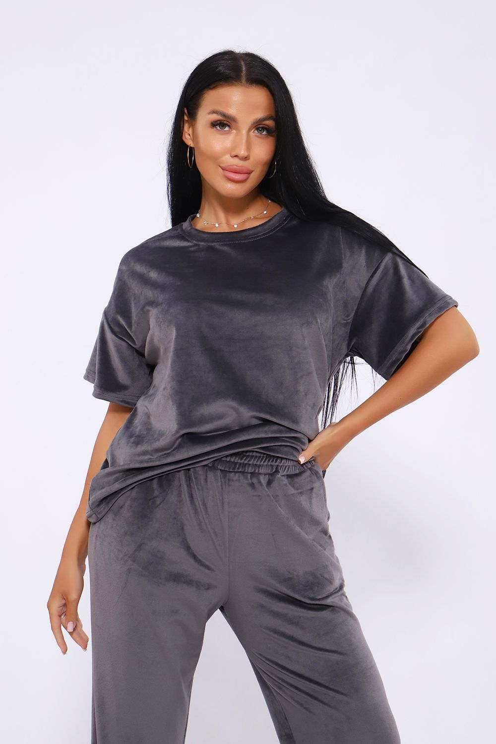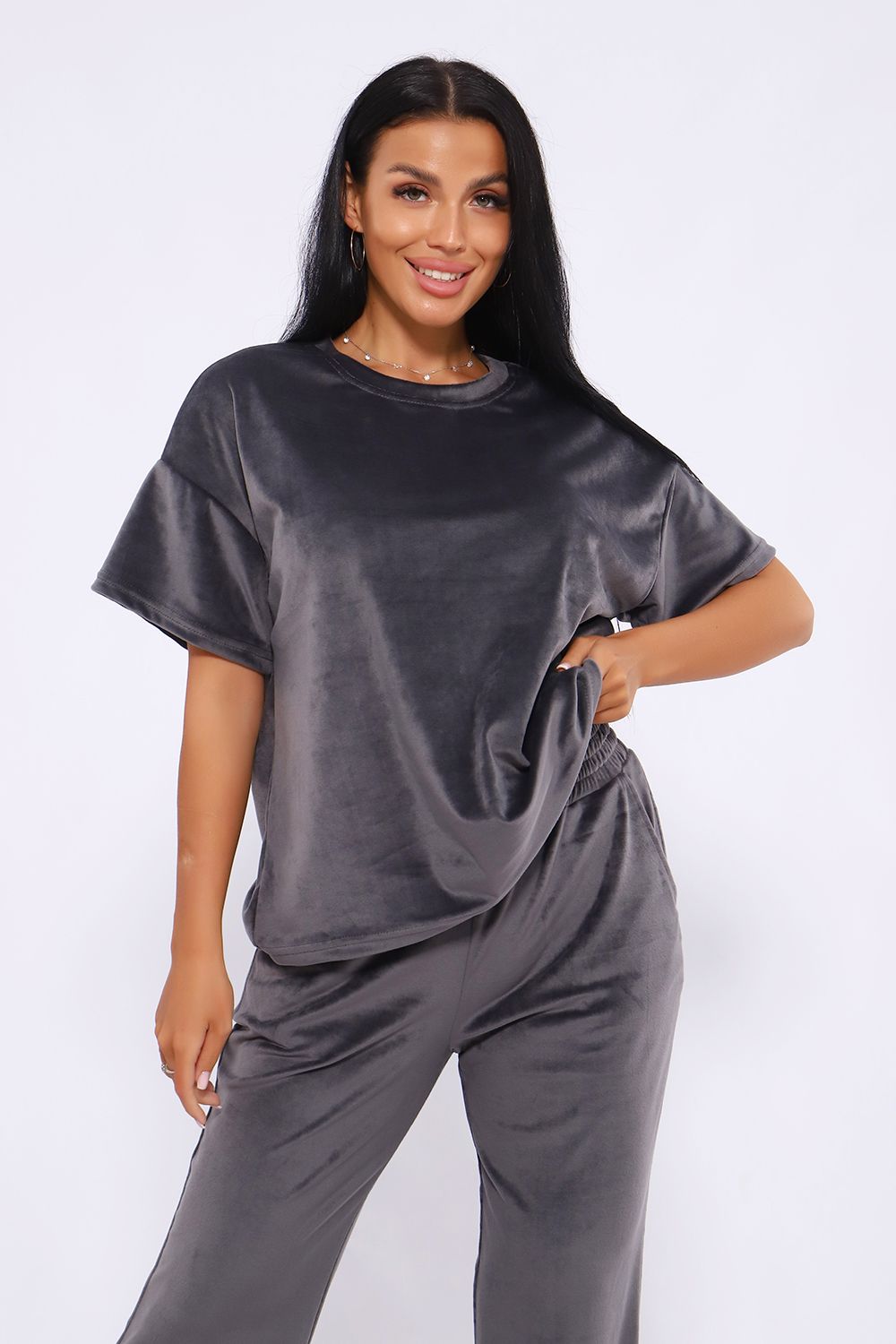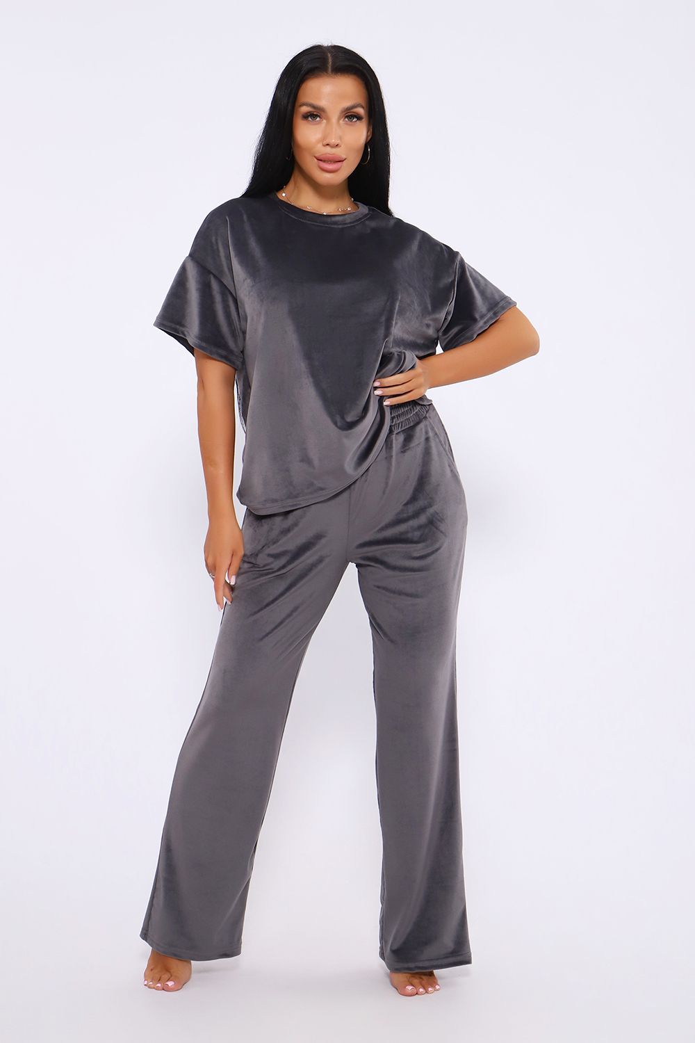 Костюм женский велюровый, повседневный, всесезонный. Костюм состоит из футболки и брюк. Футболка оверсайз прямого силуэта, длиной до бедра. Рукав втачной со спущенным плечом, длиной чуть выше локтя. Горловина с обтачкой, низ футболки с подгибкой. Брюки прямого силуэта, умеренного объема. На передних половинках брюк карманы с отрезным бочком. Пояс притачной с эластичной тесьмой. Низ брюк подгибка. Замеры объема талии брюк по нерастянутой резинке.