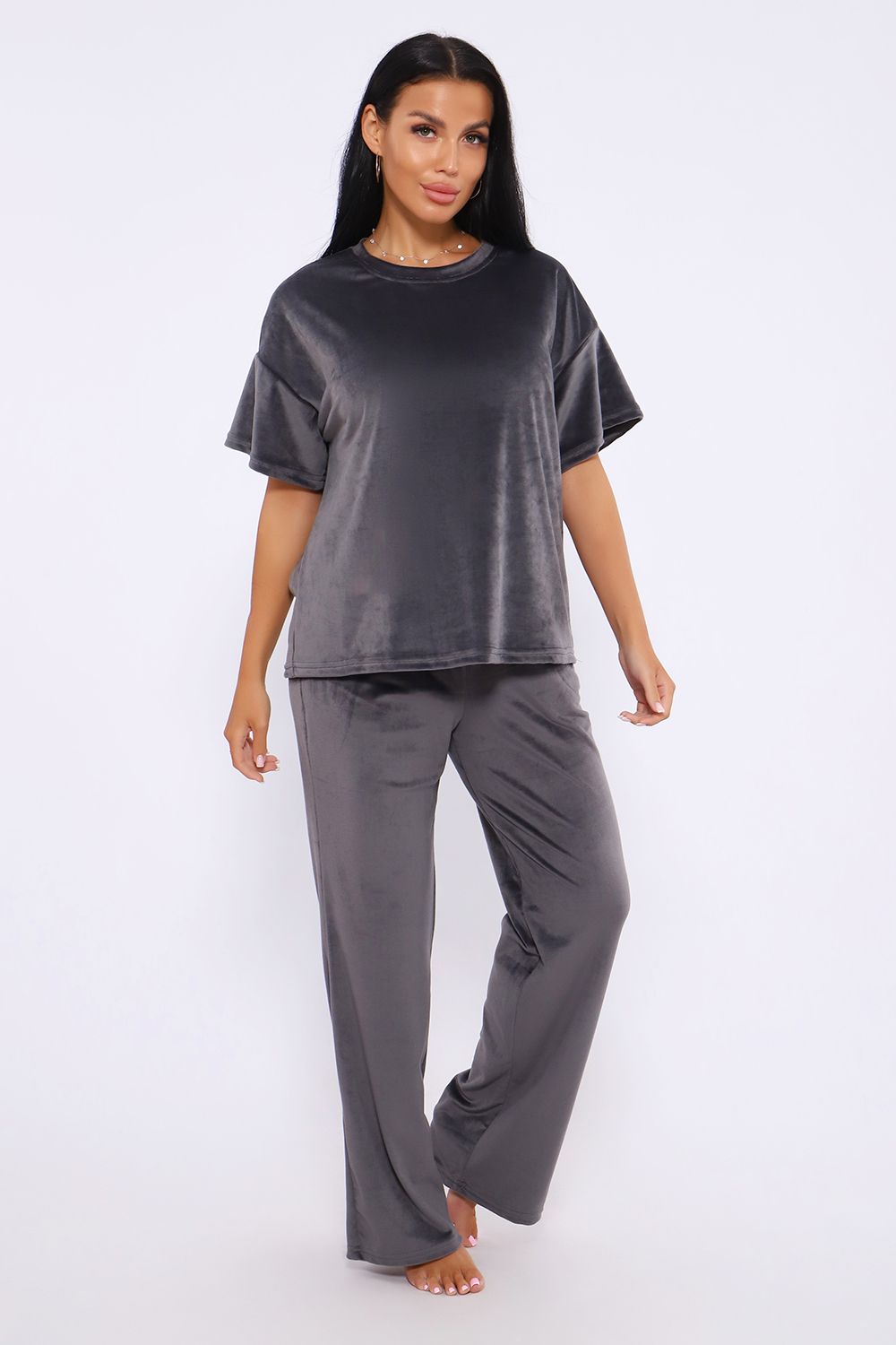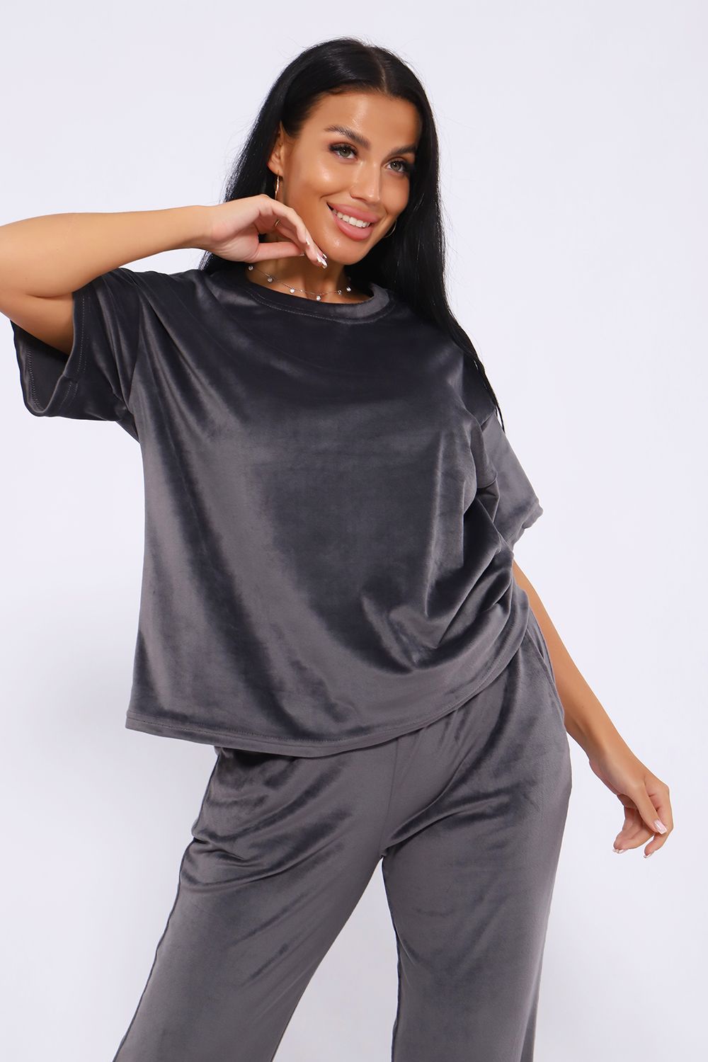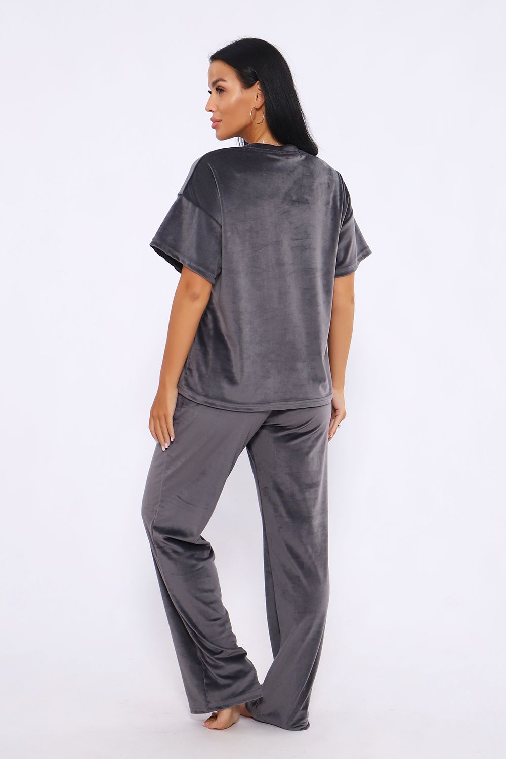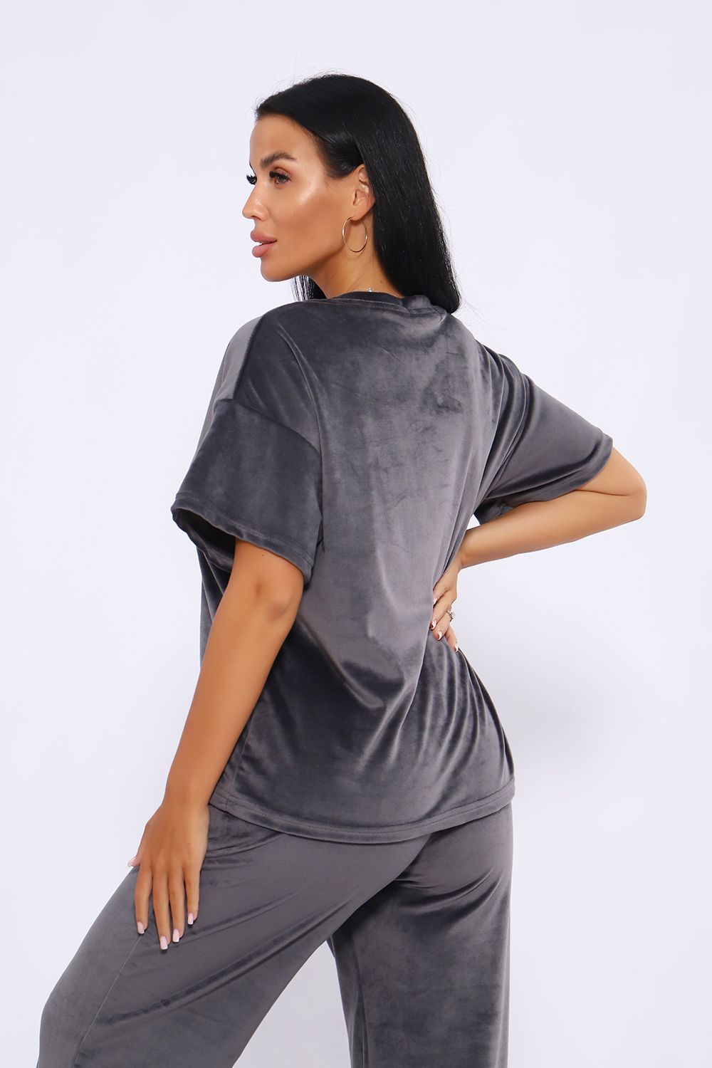 Костюм женский велюровый, повседневный, всесезонный. Костюм состоит из футболки и брюк. Футболка оверсайз прямого силуэта, длиной до бедра. Рукав втачной со спущенным плечом, длиной чуть выше локтя. Горловина с обтачкой, низ футболки с подгибкой. Брюки прямого силуэта, умеренного объема. На передних половинках брюк карманы с отрезным бочком. Пояс притачной с эластичной тесьмой. Низ брюк подгибка. Замеры объема талии брюк по нерастянутой резинке.