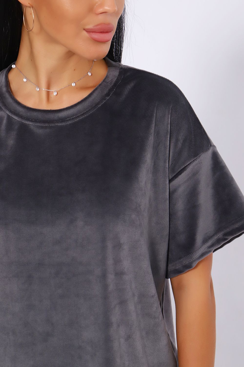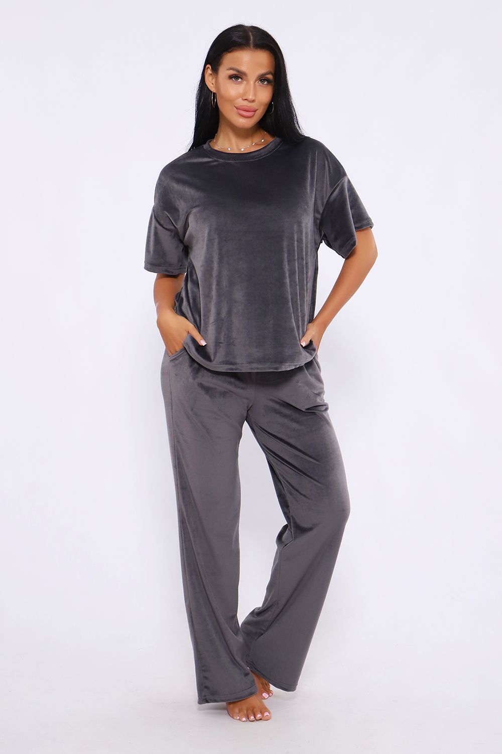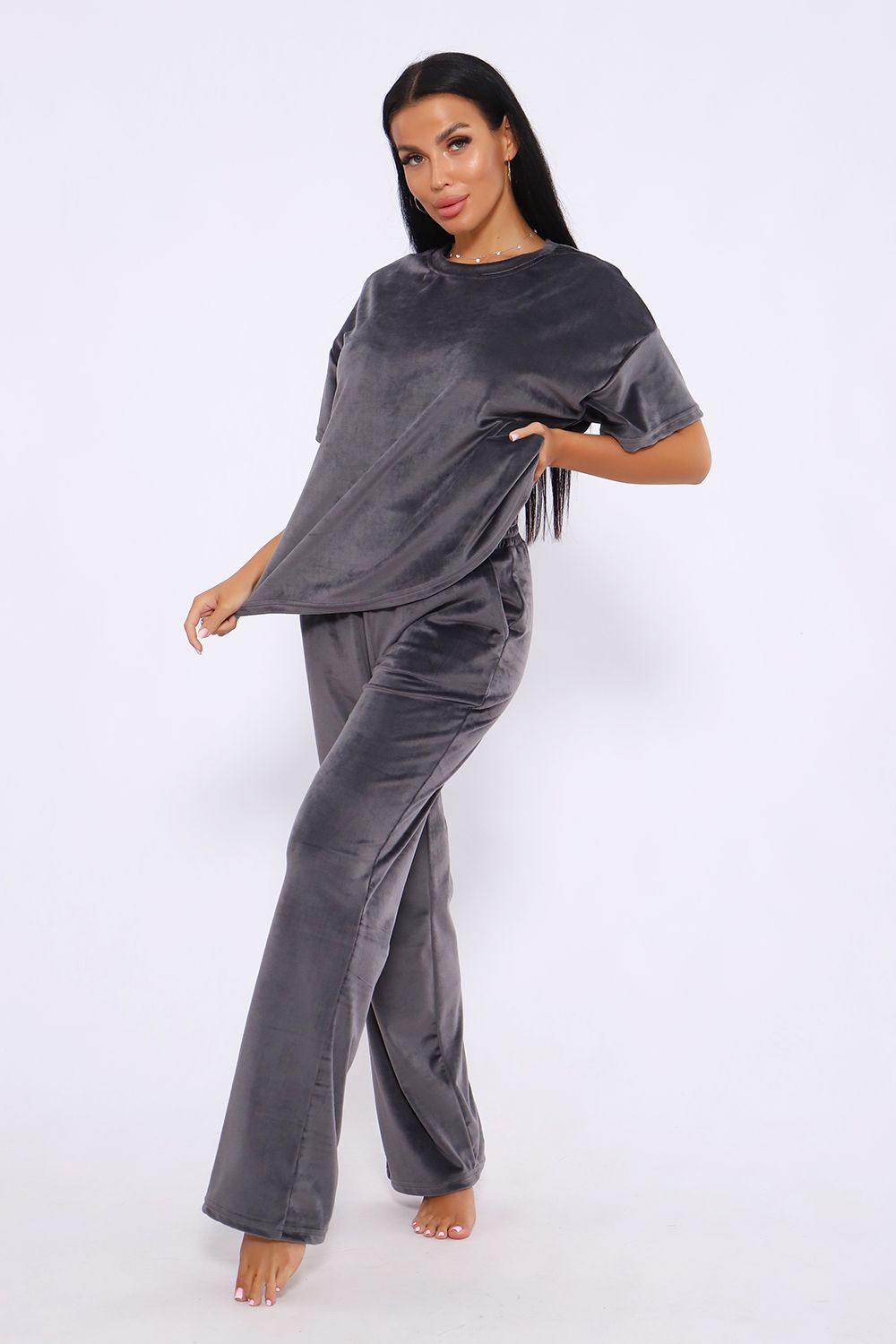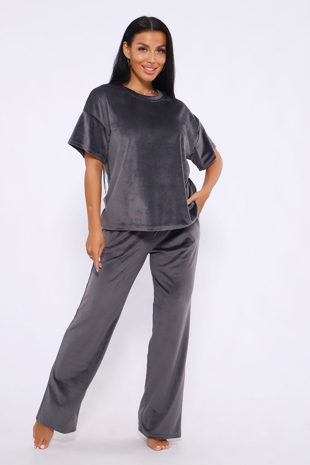Костюм женский велюровый, повседневный, всесезонный. Костюм состоит из футболки и брюк. Футболка оверсайз прямого силуэта, длиной до бедра. Рукав втачной со спущенным плечом, длиной чуть выше локтя. Горловина с обтачкой, низ футболки с подгибкой. Брюки прямого силуэта, умеренного объема. На передних половинках брюк карманы с отрезным бочком. Пояс притачной с эластичной тесьмой. Низ брюк подгибка. Замеры объема талии брюк по нерастянутой резинке.
