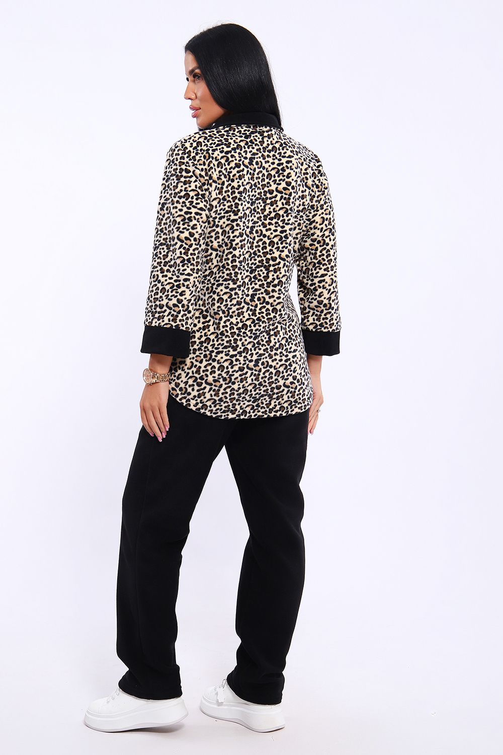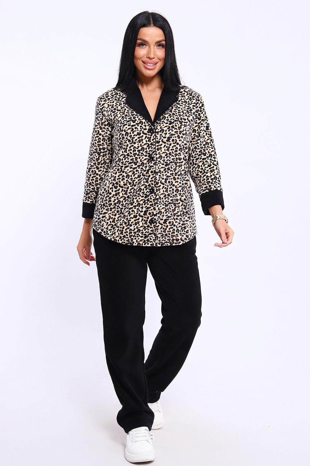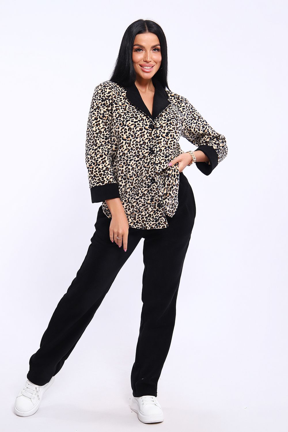 Домашний женский костюм из мягкого, теплого флиса. Кофта полуприлегающего силуэта, застегивается на петли и пуговицы. Длиной до бедер с фигурной линией низа. Рукав втачной, длиной 3/4 с манжетом из отделочной ткани. Воротник пиджачного типа с закругленными углами, из отделочной ткани. Борта, воротник и лацканы отстрочены. Домашние брюки прямого кроя с вместительными карманами в боковом шве, комфортный пояс на резинке, располагается на линии талии, длина брюк ниже щиколотки.