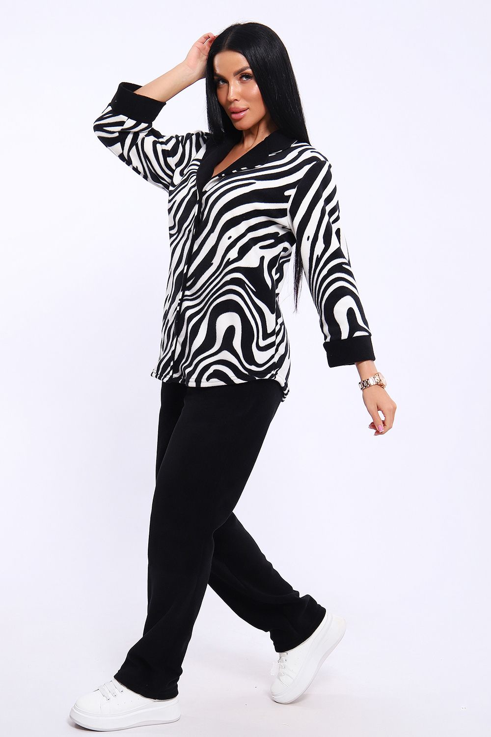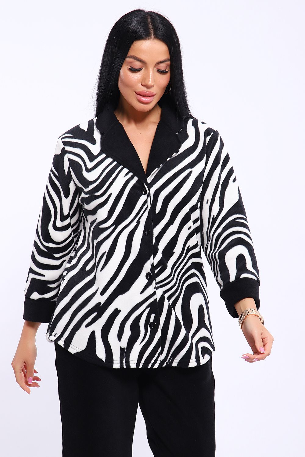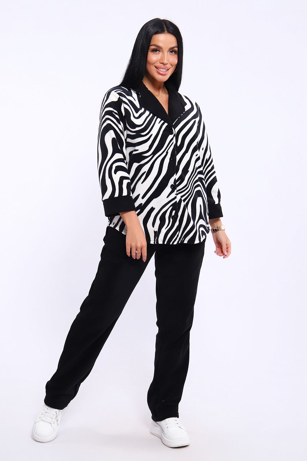 Домашний женский костюм из мягкого, теплого флиса. Кофта полуприлегающего силуэта, застегивается на петли и пуговицы. Длиной до бедер с фигурной линией низа. Рукав втачной, длиной 3/4 с манжетом из отделочной ткани. Воротник пиджачного типа с закругленными углами, из отделочной ткани. Борта, воротник и лацканы отстрочены. Домашние брюки прямого кроя с вместительными карманами в боковом шве, комфортный пояс на резинке, располагается на линии талии, длина брюк ниже щиколотки.