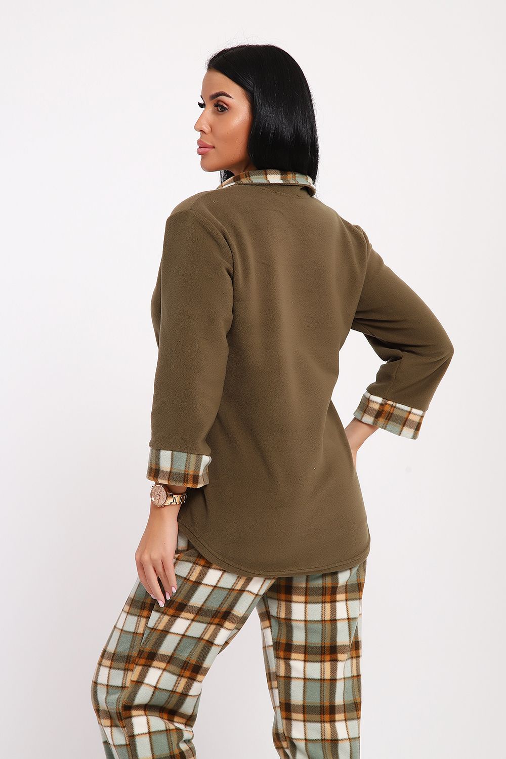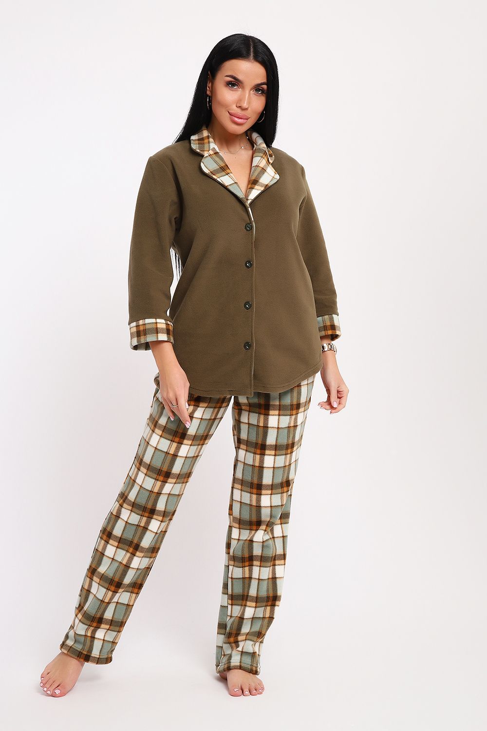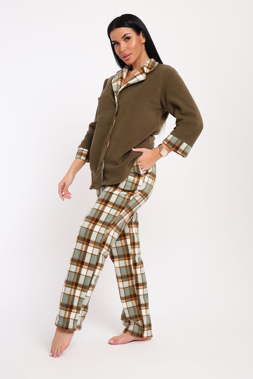 Домашний женский костюм из мягкого, теплого флиса. Кофта полуприлегающего силуэта, застегивается на петли и пуговицы. Длиной до бедер с фигурной линией низа. Рукав втачной, длиной 3/4 с манжетом из отделочной ткани. Воротник пиджачного типа с закругленными углами, из отделочной ткани. Борта, воротник и лацканы отстрочены. Домашние брюки прямого кроя с вместительными карманами в боковом шве, комфортный пояс на резинке, располагается на линии талии, длина брюк ниже щиколотки.