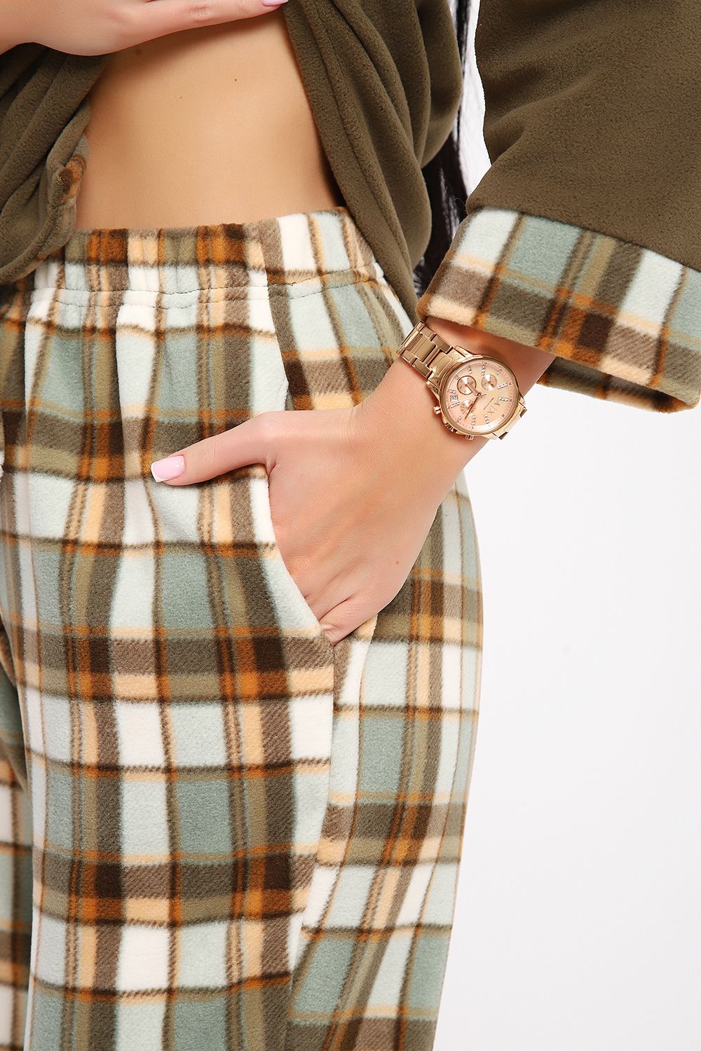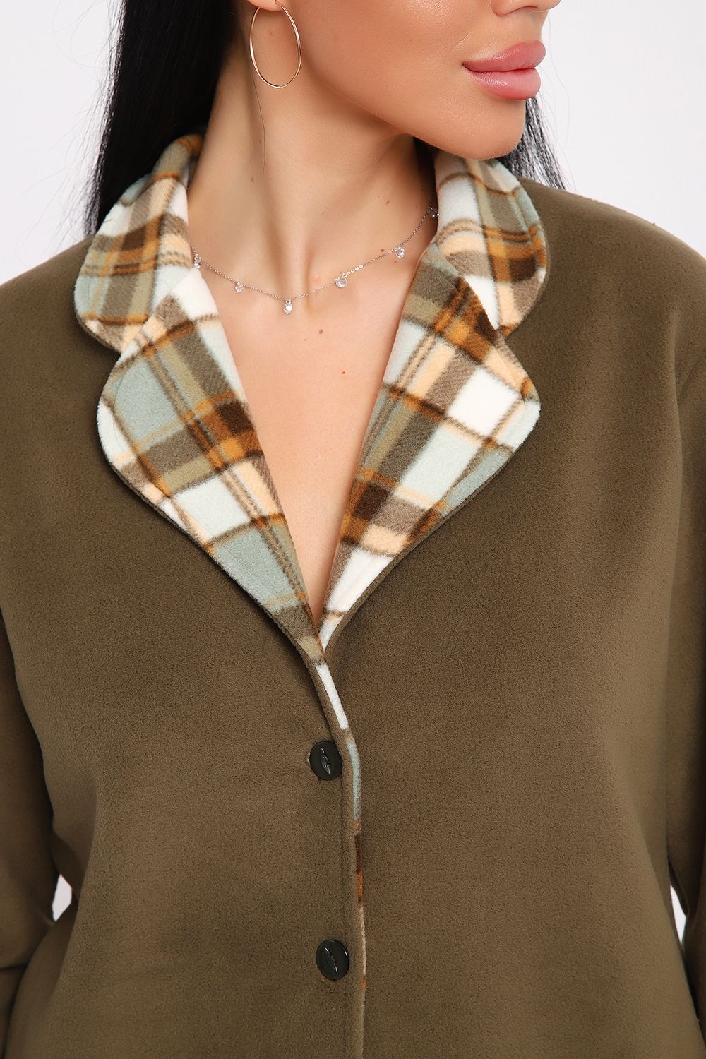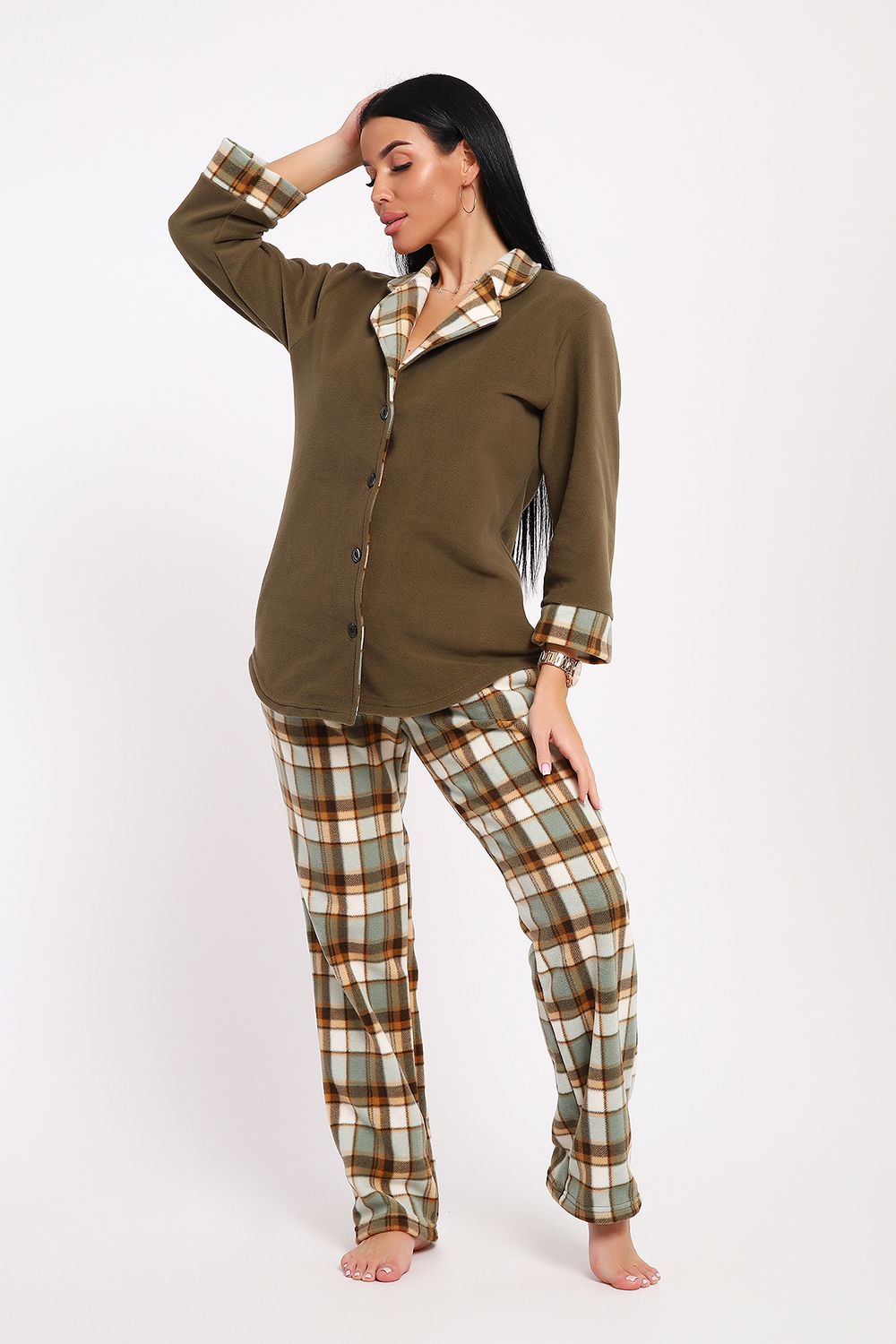 Домашний женский костюм из мягкого, теплого флиса. Кофта полуприлегающего силуэта, застегивается на петли и пуговицы. Длиной до бедер с фигурной линией низа. Рукав втачной, длиной 3/4 с манжетом из отделочной ткани. Воротник пиджачного типа с закругленными углами, из отделочной ткани. Борта, воротник и лацканы отстрочены. Домашние брюки прямого кроя с вместительными карманами в боковом шве, комфортный пояс на резинке, располагается на линии талии, длина брюк ниже щиколотки.