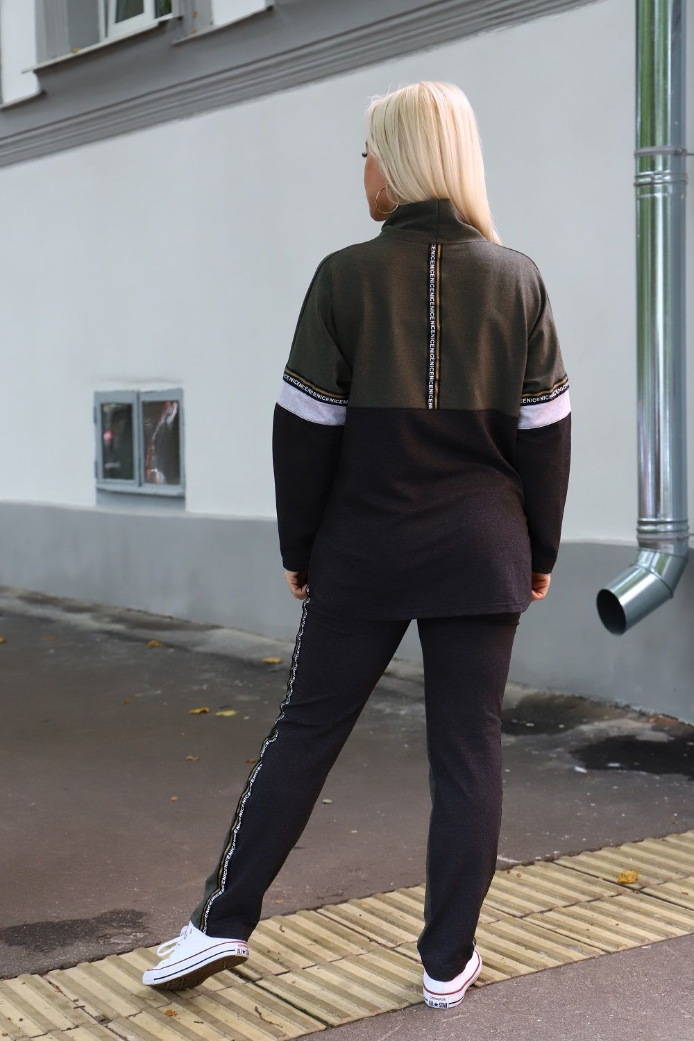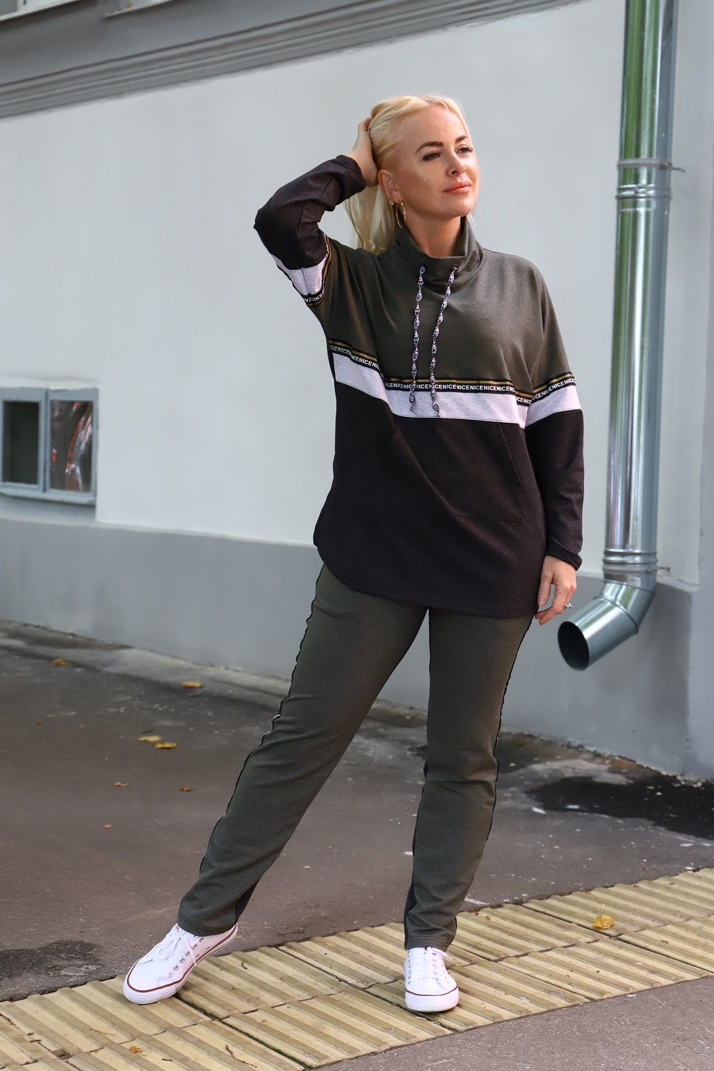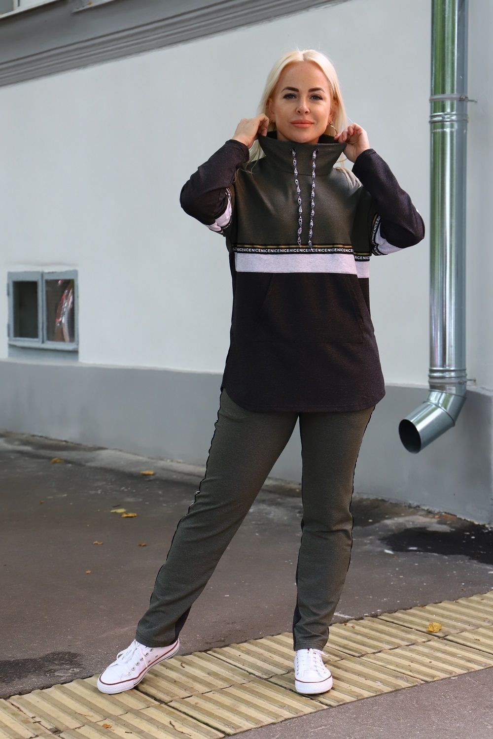 Костюм женский туника и брюки. Туника прямого силуэта, брюки облегающие. Воротник-стойка хомут со шнурками из тесьмы. Карман - кенгуру. Верхняя и нижняя часть туники из разных тканей, посередине полочки и рукавов белая отделочная полоса с декоративной тесьмой. Брюки с карманами и лампасами из декоративной тесьмы.