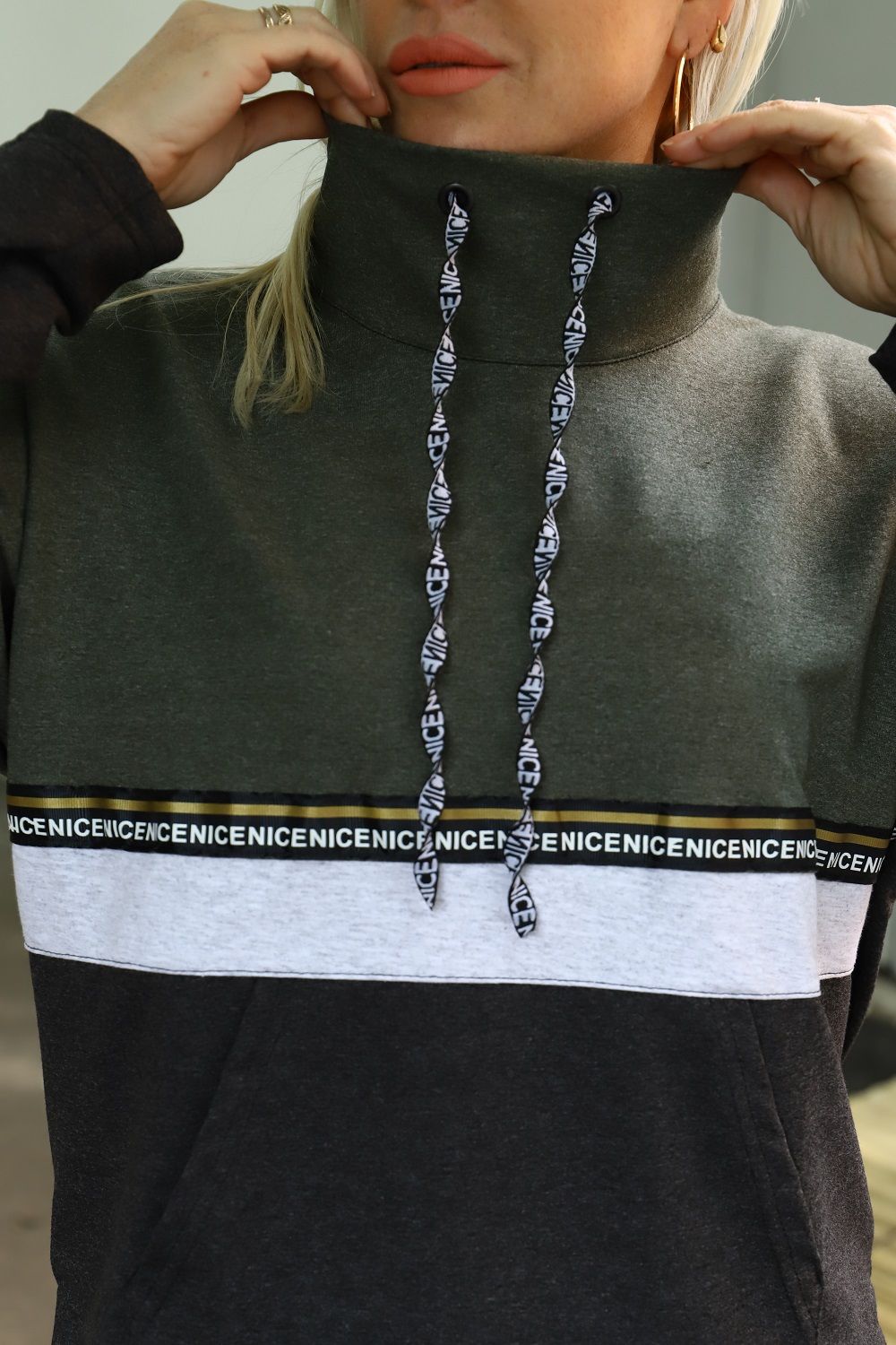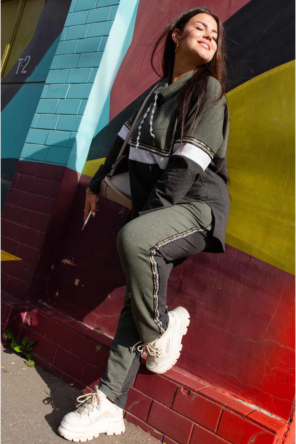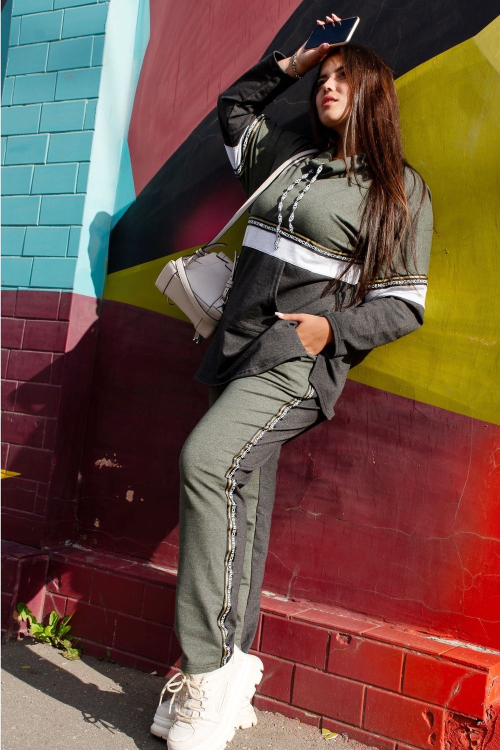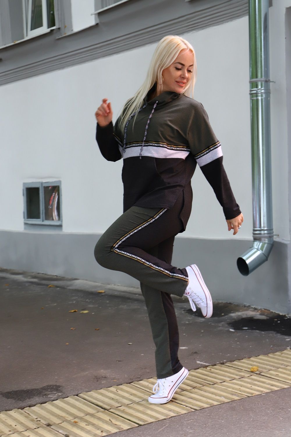 Костюм женский туника и брюки. Туника прямого силуэта, брюки облегающие. Воротник-стойка хомут со шнурками из тесьмы. Карман - кенгуру. Верхняя и нижняя часть туники из разных тканей, посередине полочки и рукавов белая отделочная полоса с декоративной тесьмой. Брюки с карманами и лампасами из декоративной тесьмы.