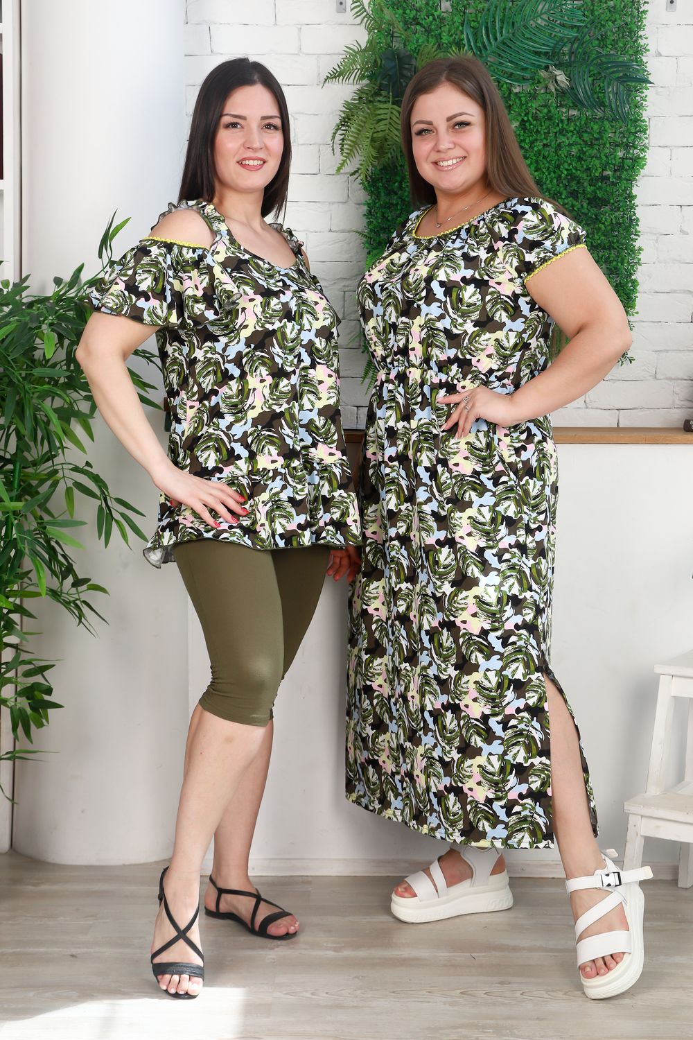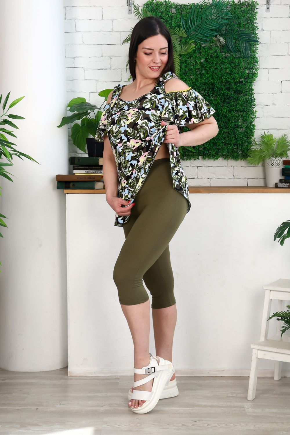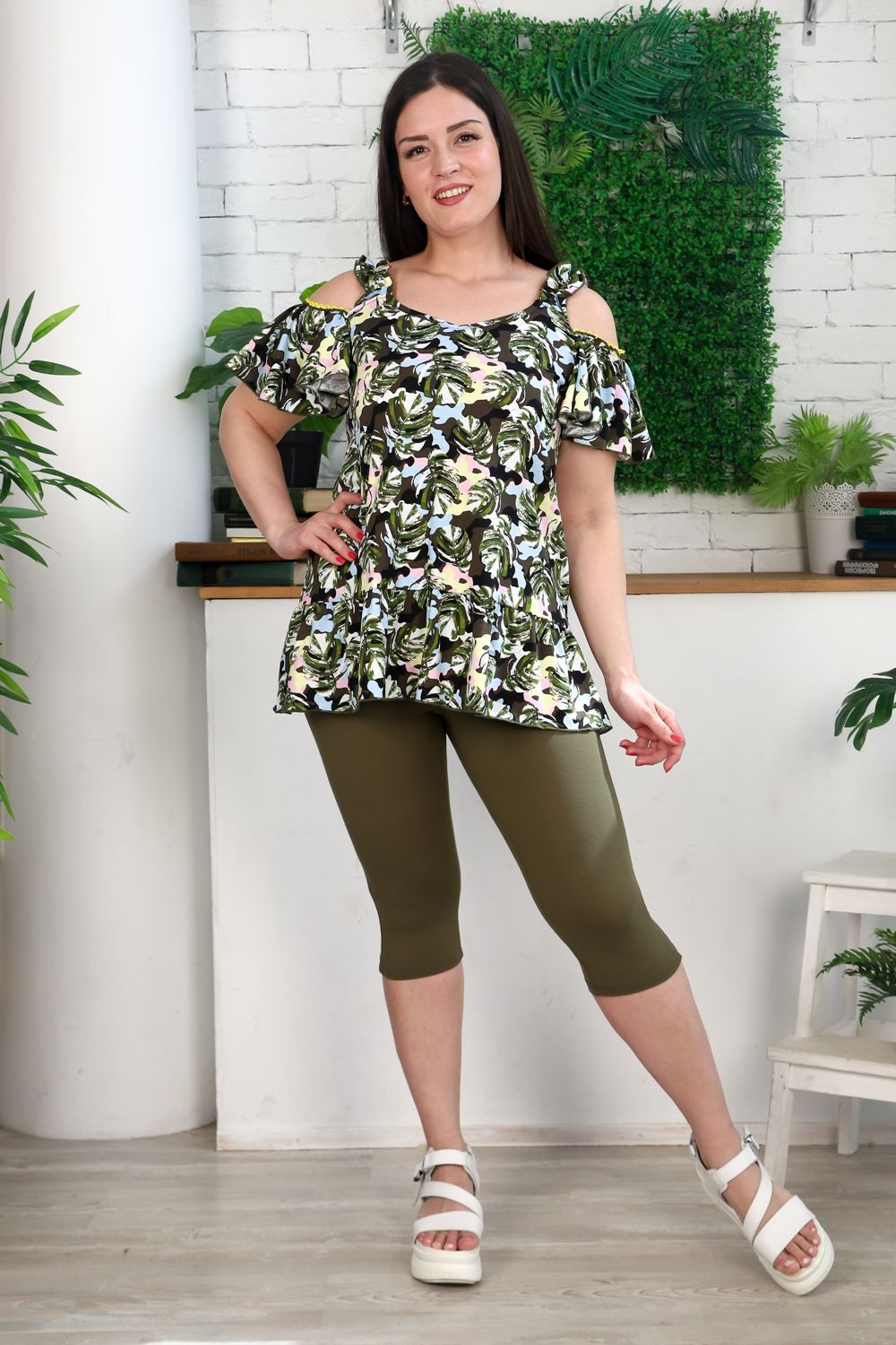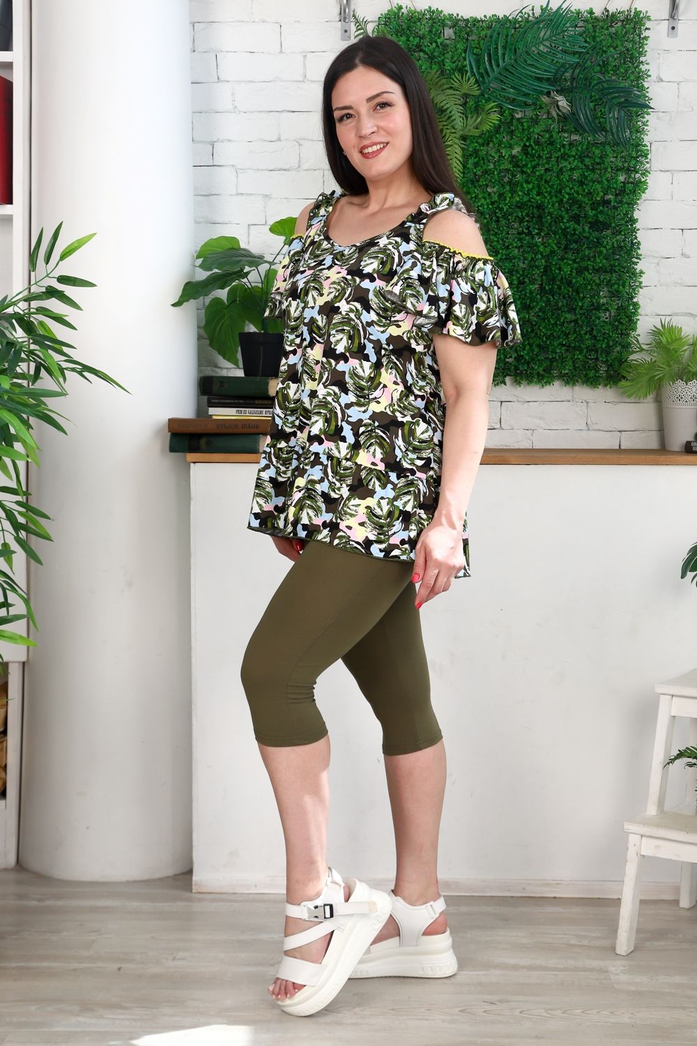 Костюм женский состоит из топа и вискозных бриджей. Топ на эластичных бретелях. Эффектный рукав «крылышко», поверху обработан эластичной кружевной тесьмой.