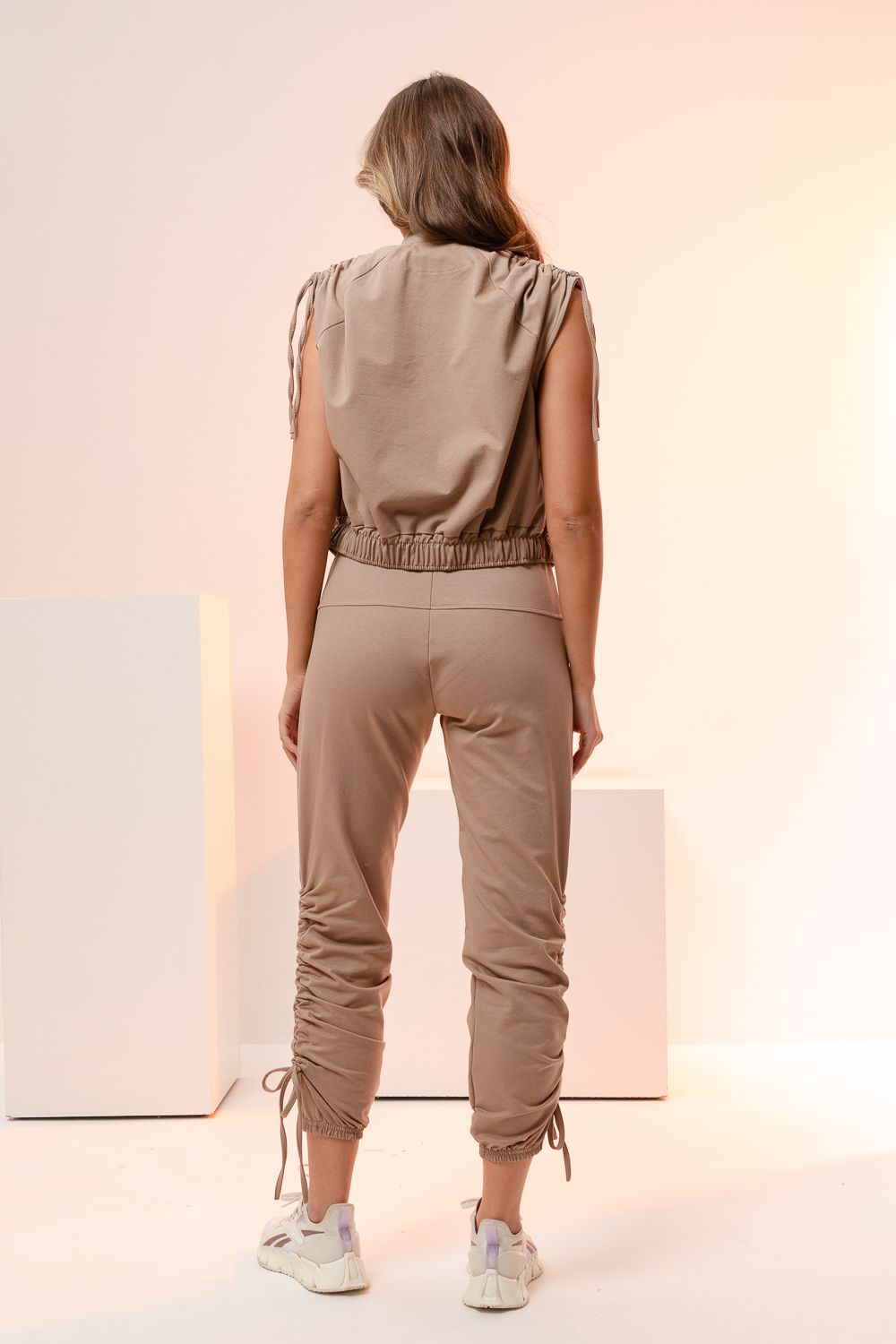 Стильный женский костюм с драпировкой. Однотонный вариант костюма – двойка - неотъемлемая частью женского гардероба. Модель подойдет для прогулок и повседневной носки. Материал хорошо пропускает воздух. Крой жилета укороченный. Длину брюк и плеча можно регулировать при помощи завязок.