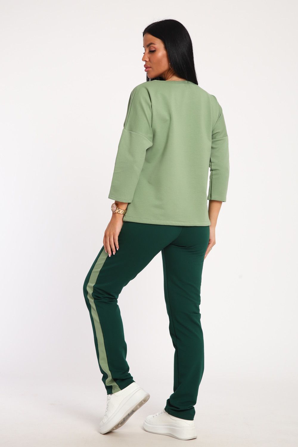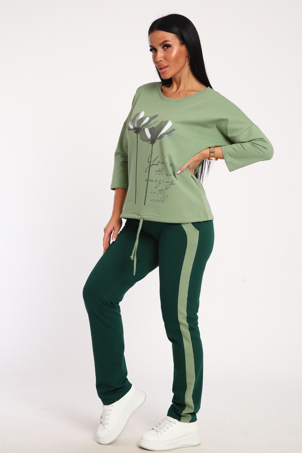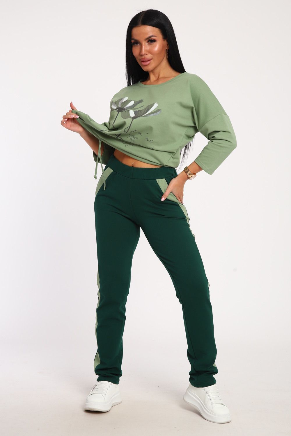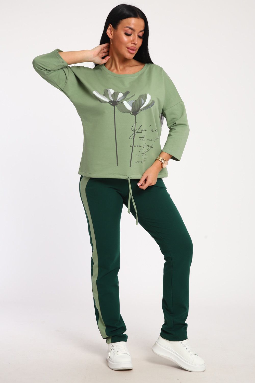 Костюм женский выполнен из футера с лайкрой. Состоит из кофты без карманов и брюк прямого силуэта с лампасами. Кофта имеет внизу регулировку, что позволяет затягивать или оставлять или оставлять кофту свободной. У костюма широкий размерный ряд.