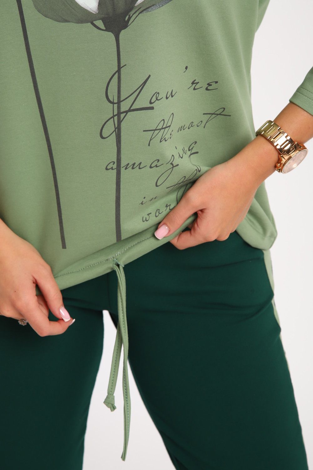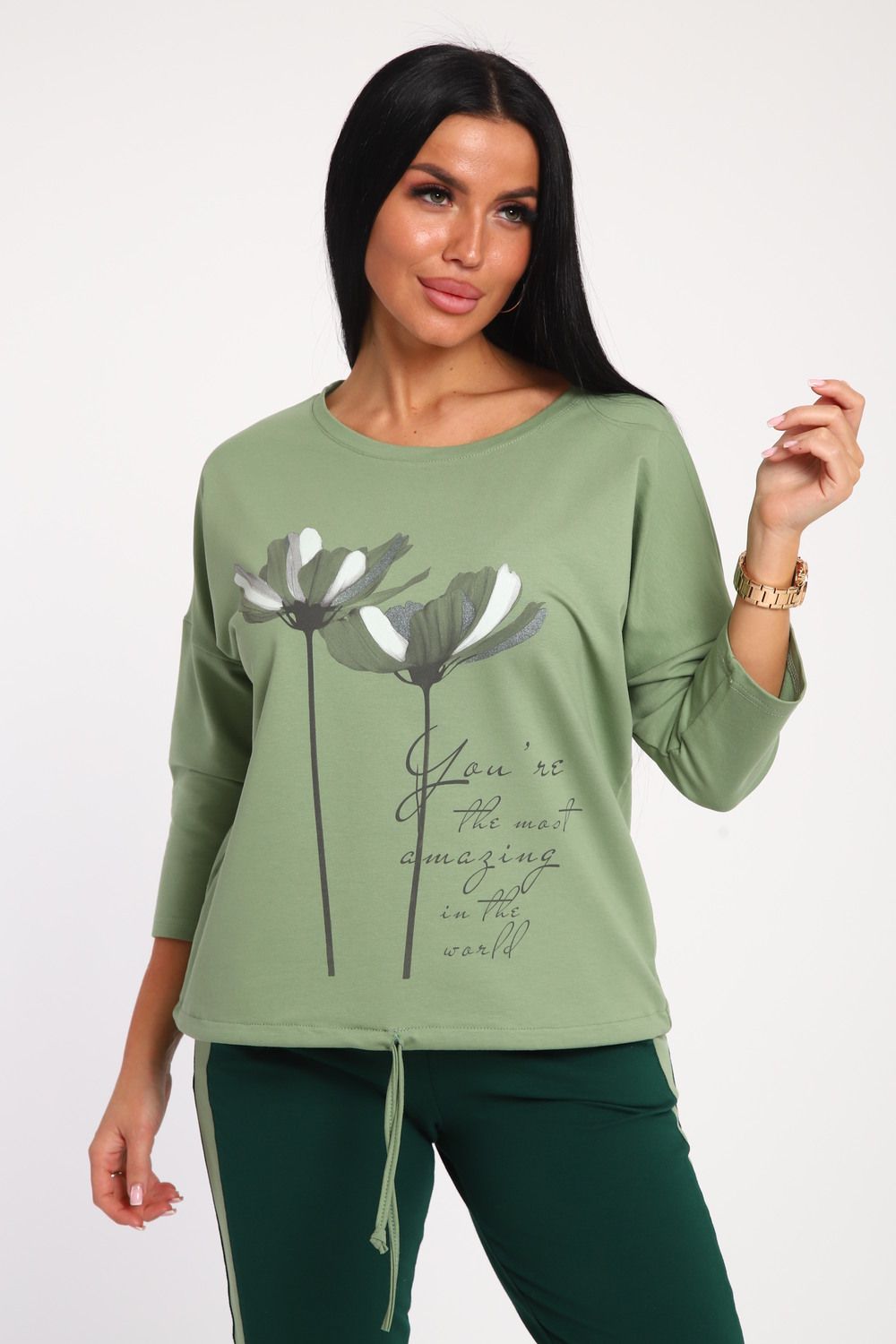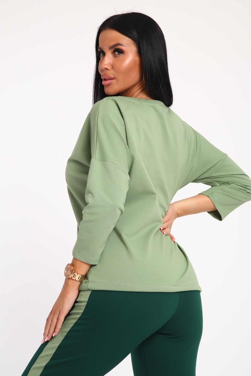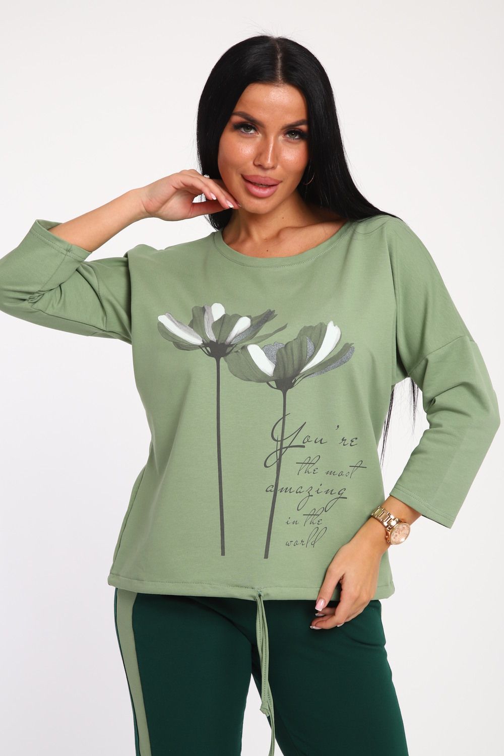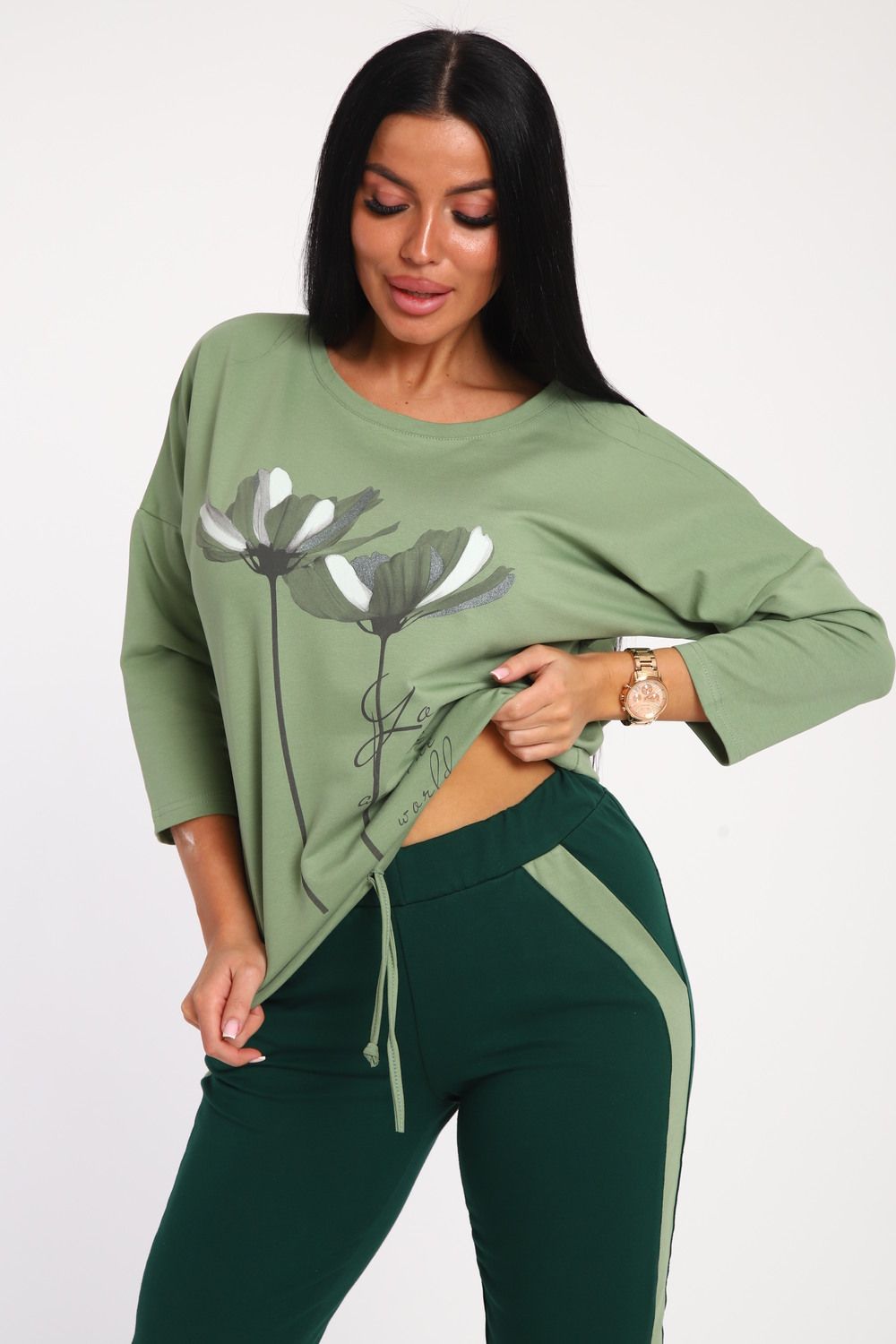 Костюм женский выполнен из футера с лайкрой. Состоит из кофты без карманов и брюк прямого силуэта с лампасами. Кофта имеет внизу регулировку, что позволяет затягивать или оставлять или оставлять кофту свободной. У костюма широкий размерный ряд.
