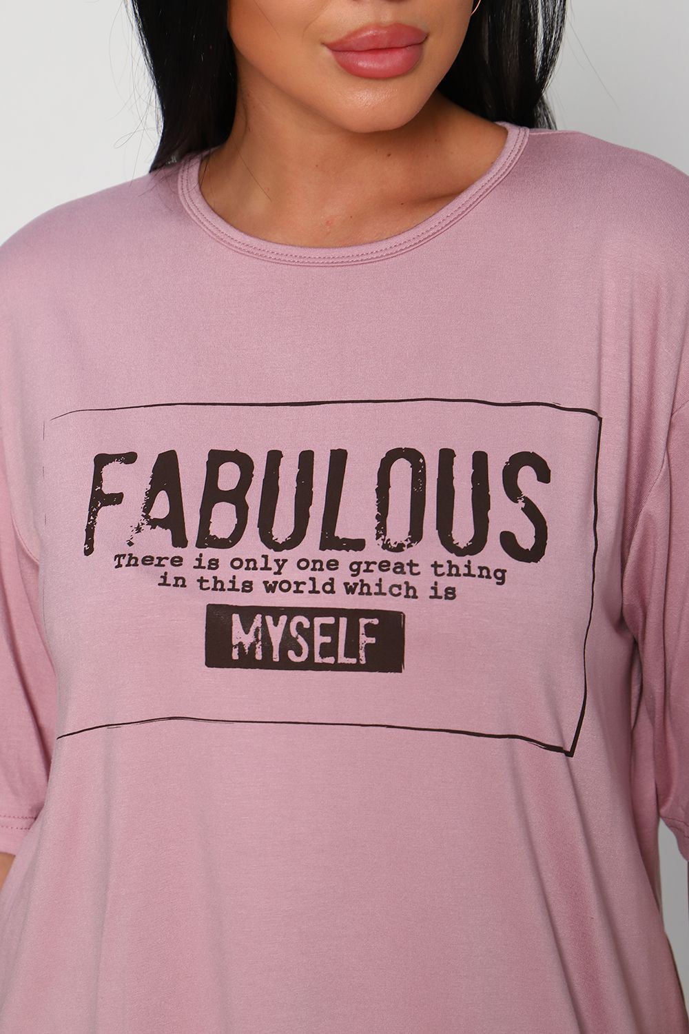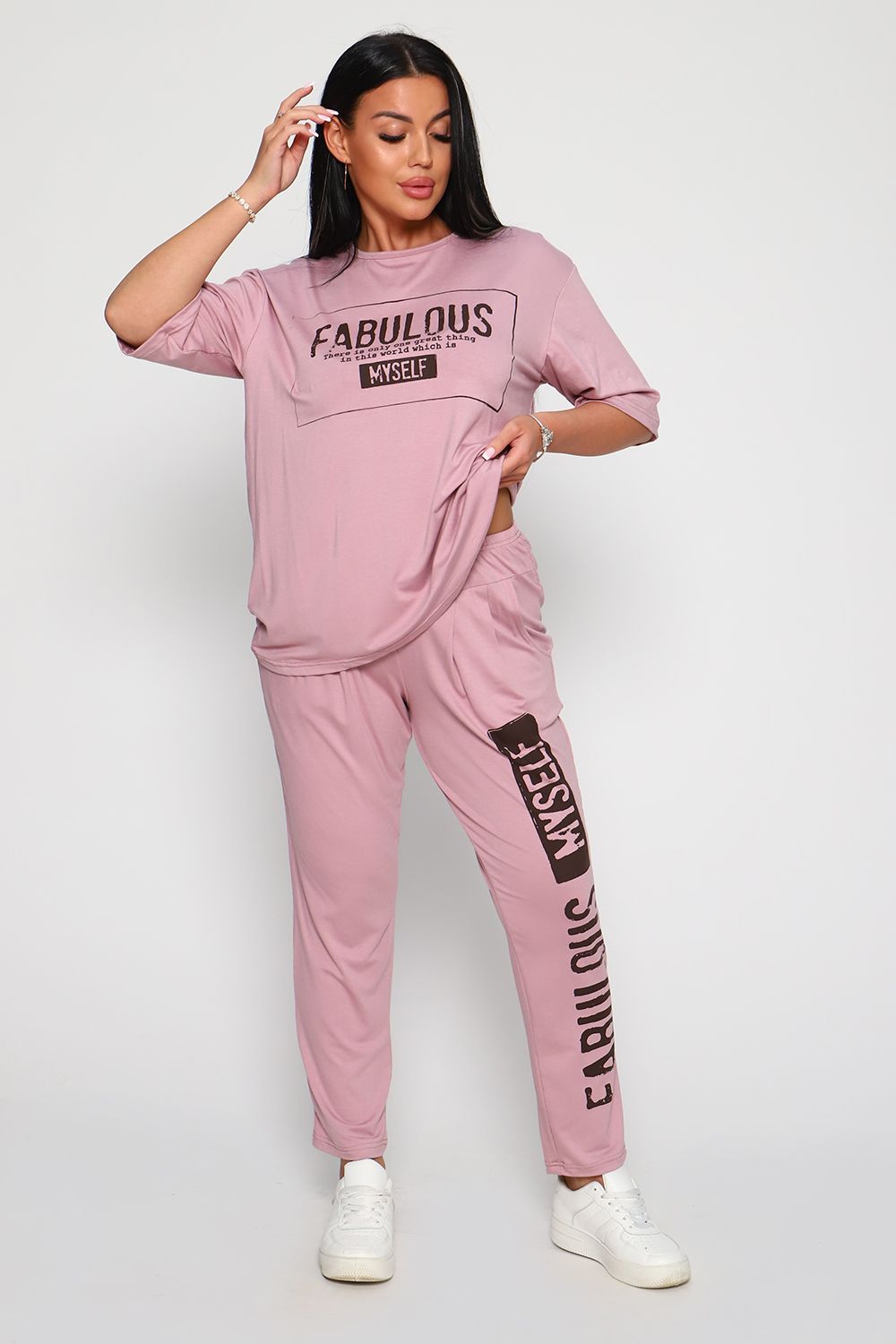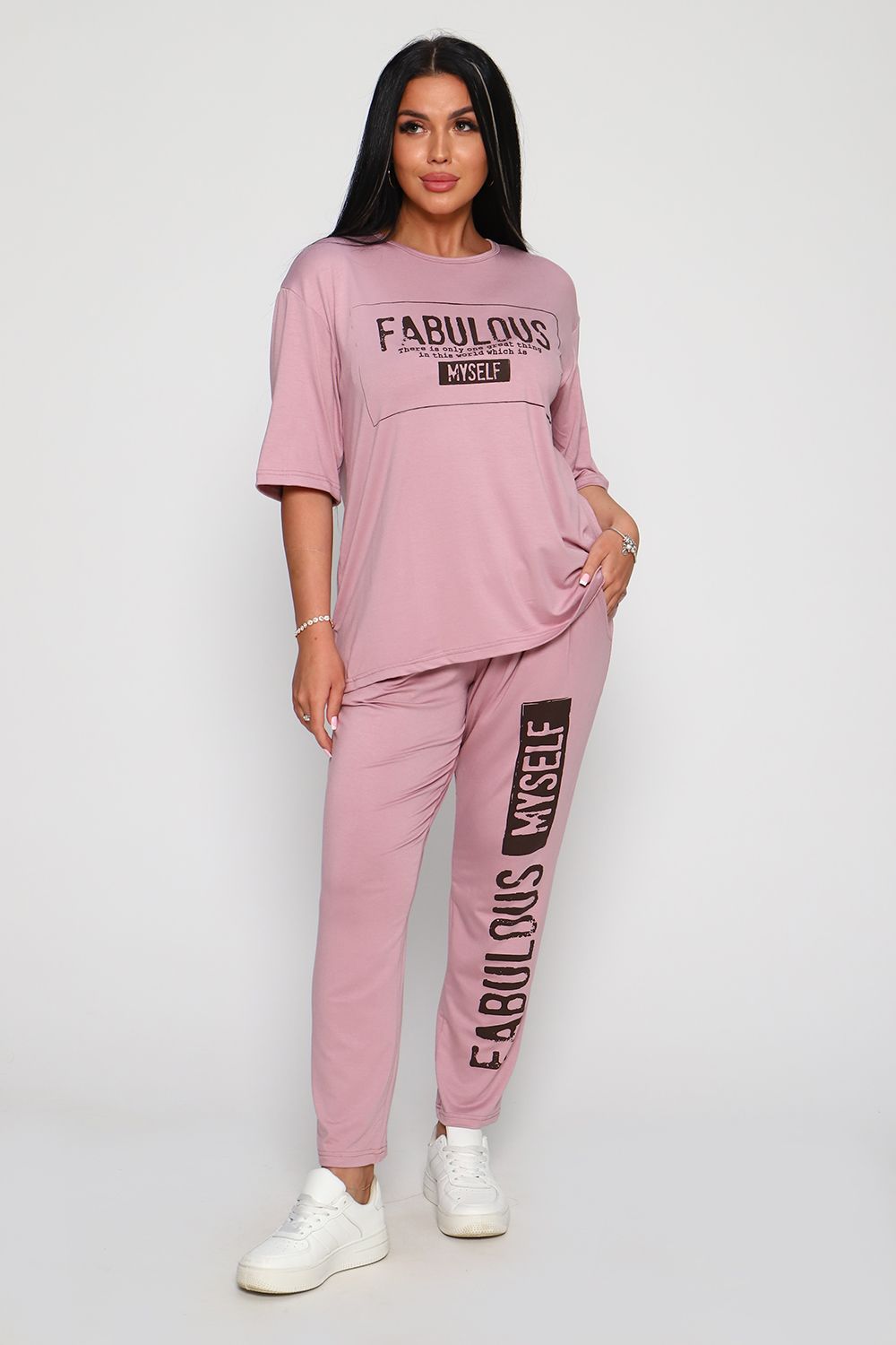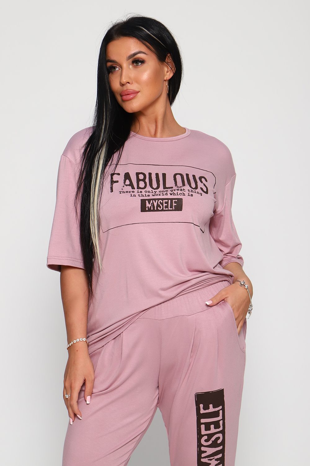 Костюм из вискозы, состоит из футболки и брюк. Футболка свободная, рукав до локтя, горловина обработана под окантовку по переду принт. Брюки по переду со складками, с карманами с принтом на одной брючине, длина до щиколотки. На модели 48-50 размер.